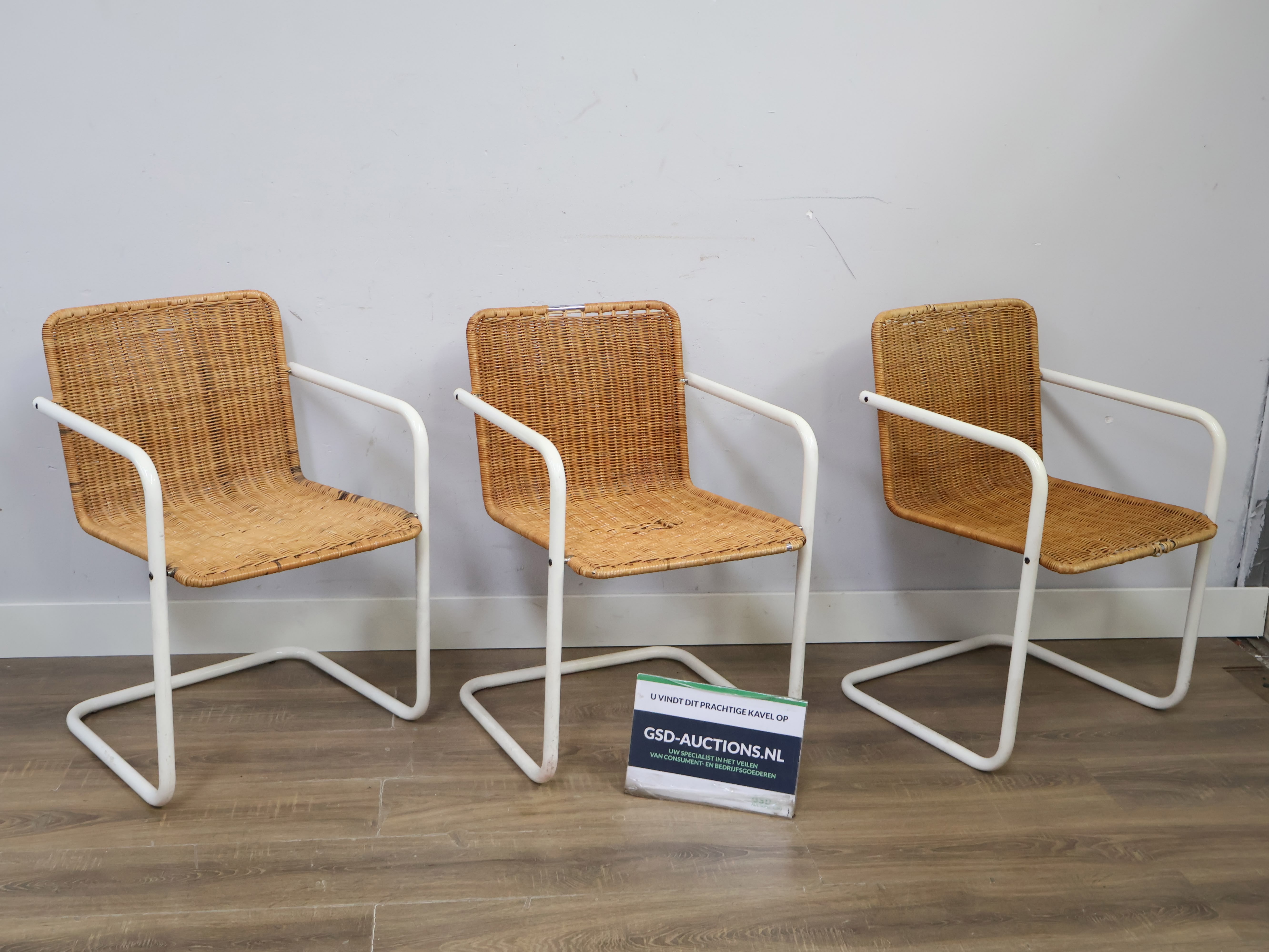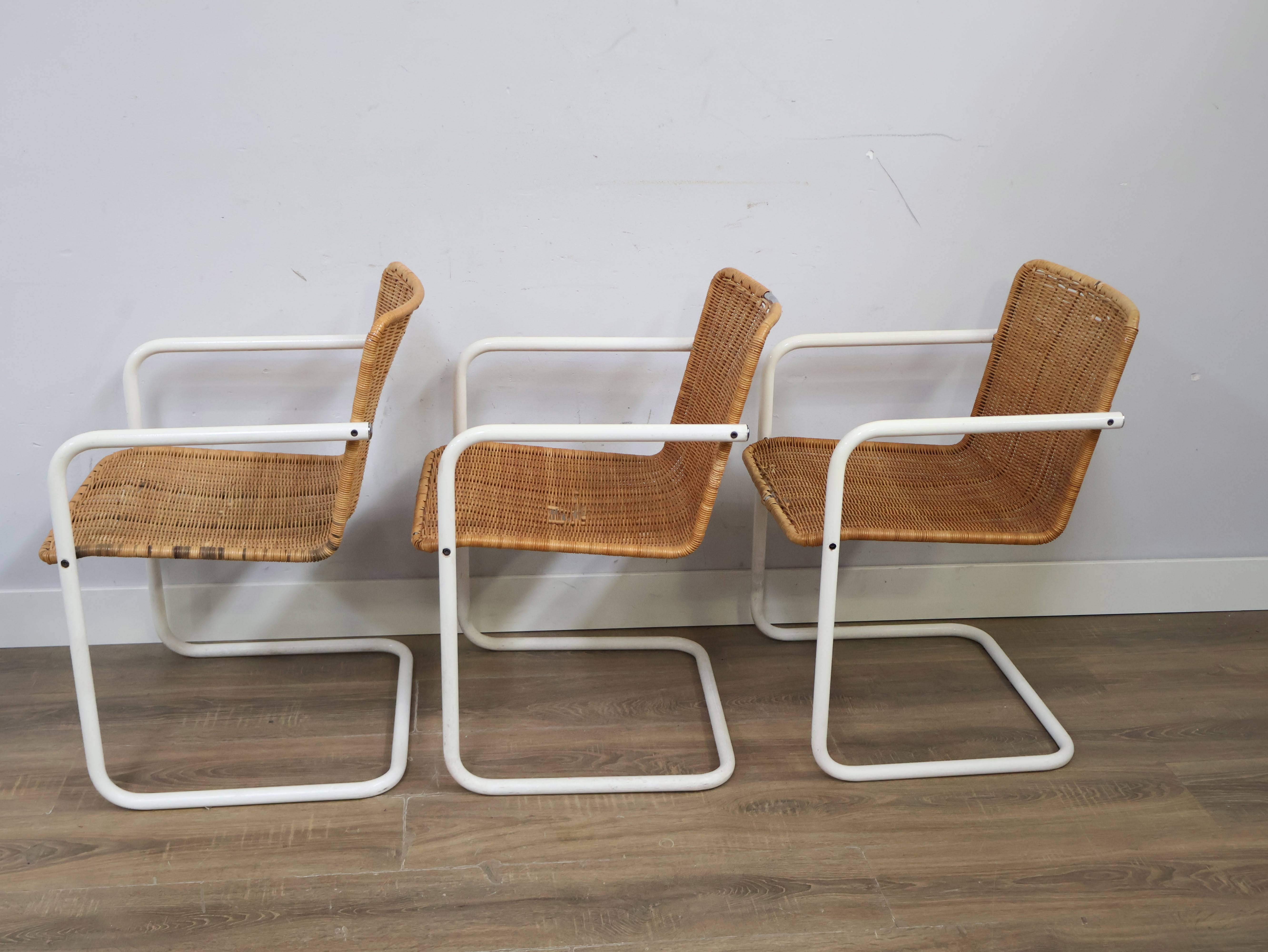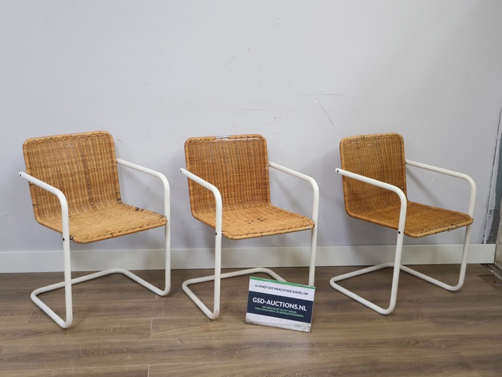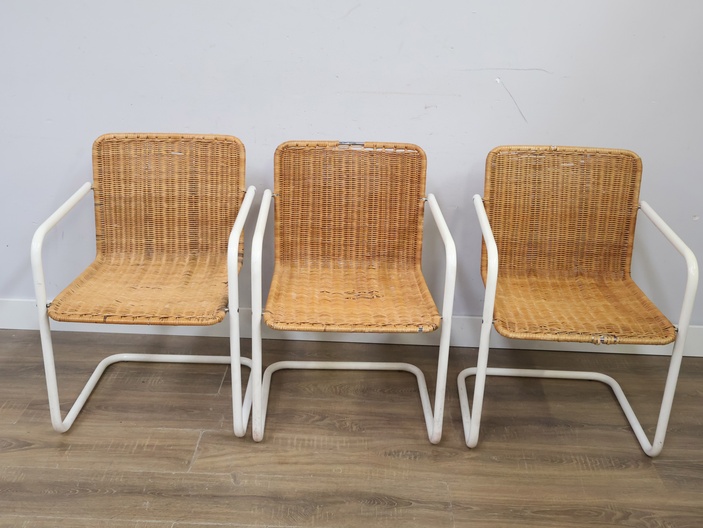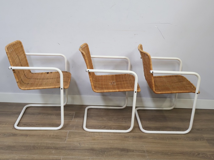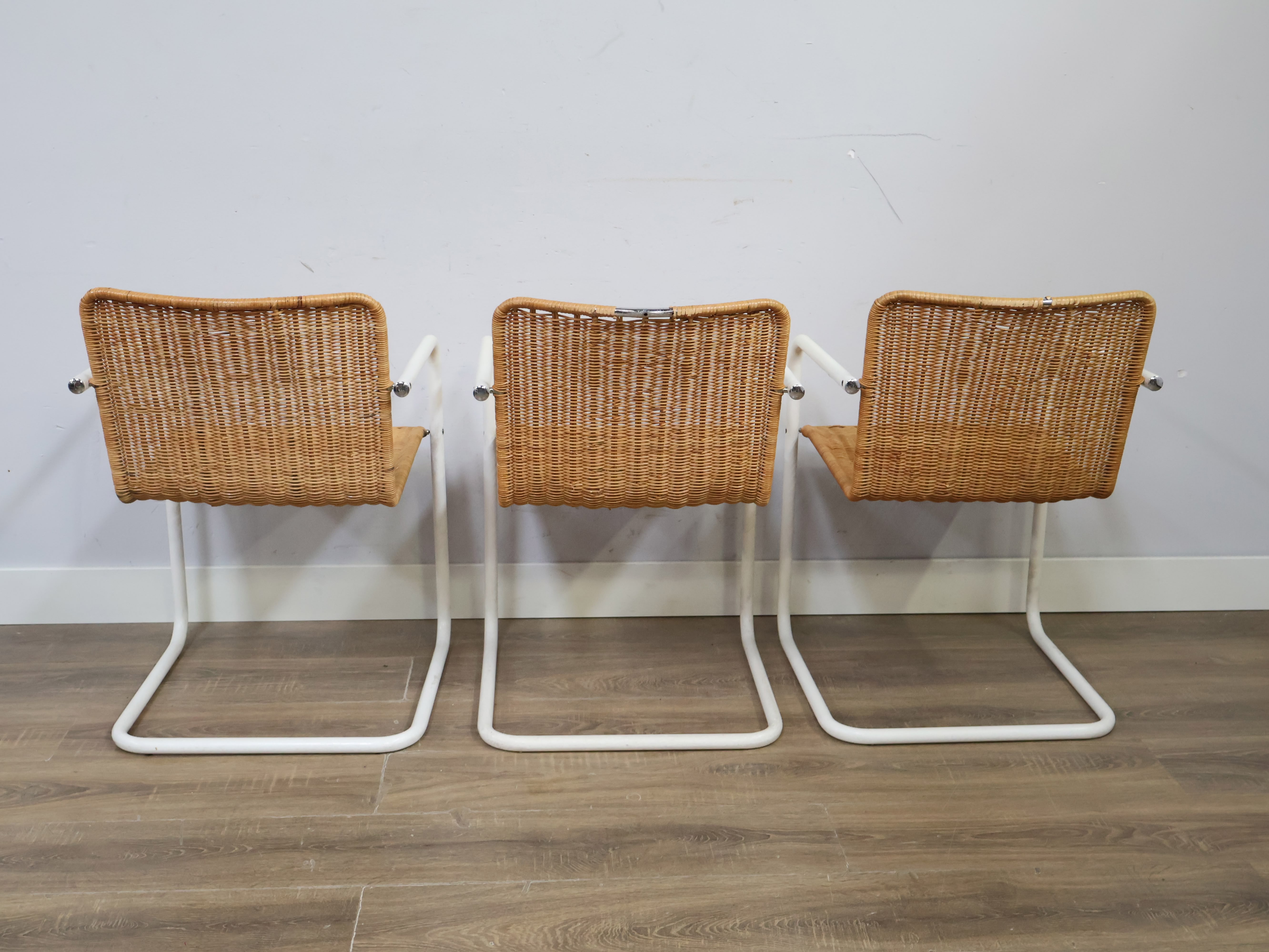 Set van 3 Rotan Bauhaus-Stijl Stoelen met Wit Buisframe