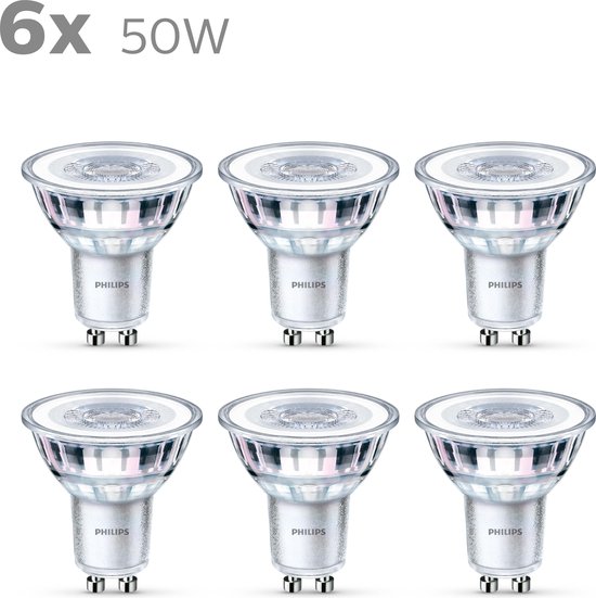 Vervang 6 oude spotjes door deze nieuwe energiezuinige Philips LED-lampen, met warmwit licht, en bespaar tot €30 op energiekosten per lamp per jaar. Deze standaardlampen verbruiken tot 90% minder energie dan gloei- en halogeenlampen dankzij de nieuwste energiezuinige LED-technologie. Daarnaast gaan ze gaan tien keer langer mee. Met EyeComfort, voor licht dat aangenaam is voor jouw ogen. Deze lampen hebben een GU10-fitting en gaan vaak perfect samen met jouw in- of opbouwspots.