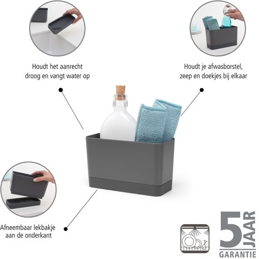 Afgeknapt op je afwas? Het Brabantia Sink Side Aanrechtbakje geeft aandacht aan je aanrecht. Hou al je kleine, stijlvolle afwas-item bij elkaar in deze organiser en het houdt je aanrecht schoon en opgeruimd. Laat je niet bedotten door zijn bescheiden buitenkantje want er is genoeg ruimte voor je afwasmiddel, sponsjes en meer.