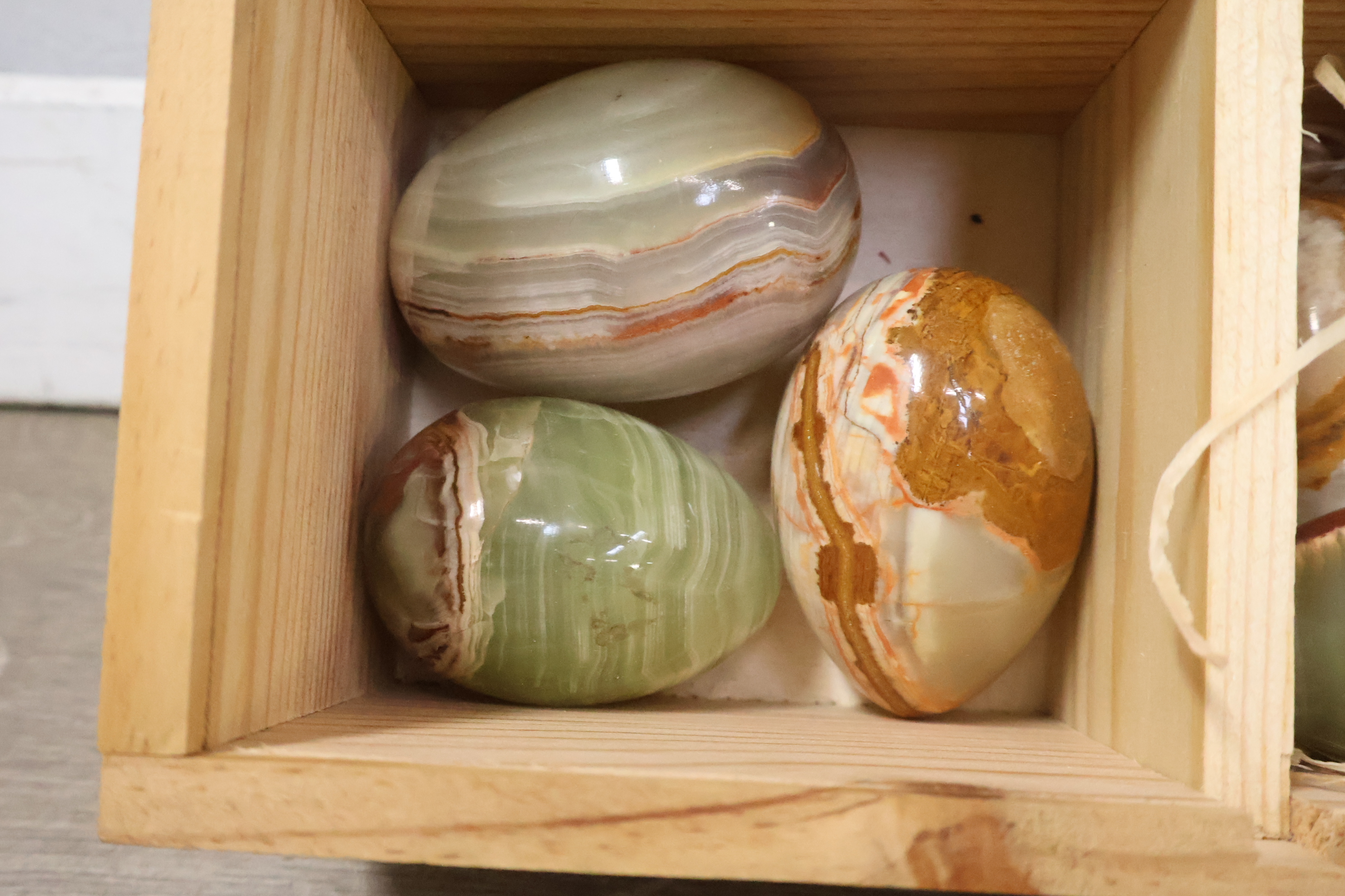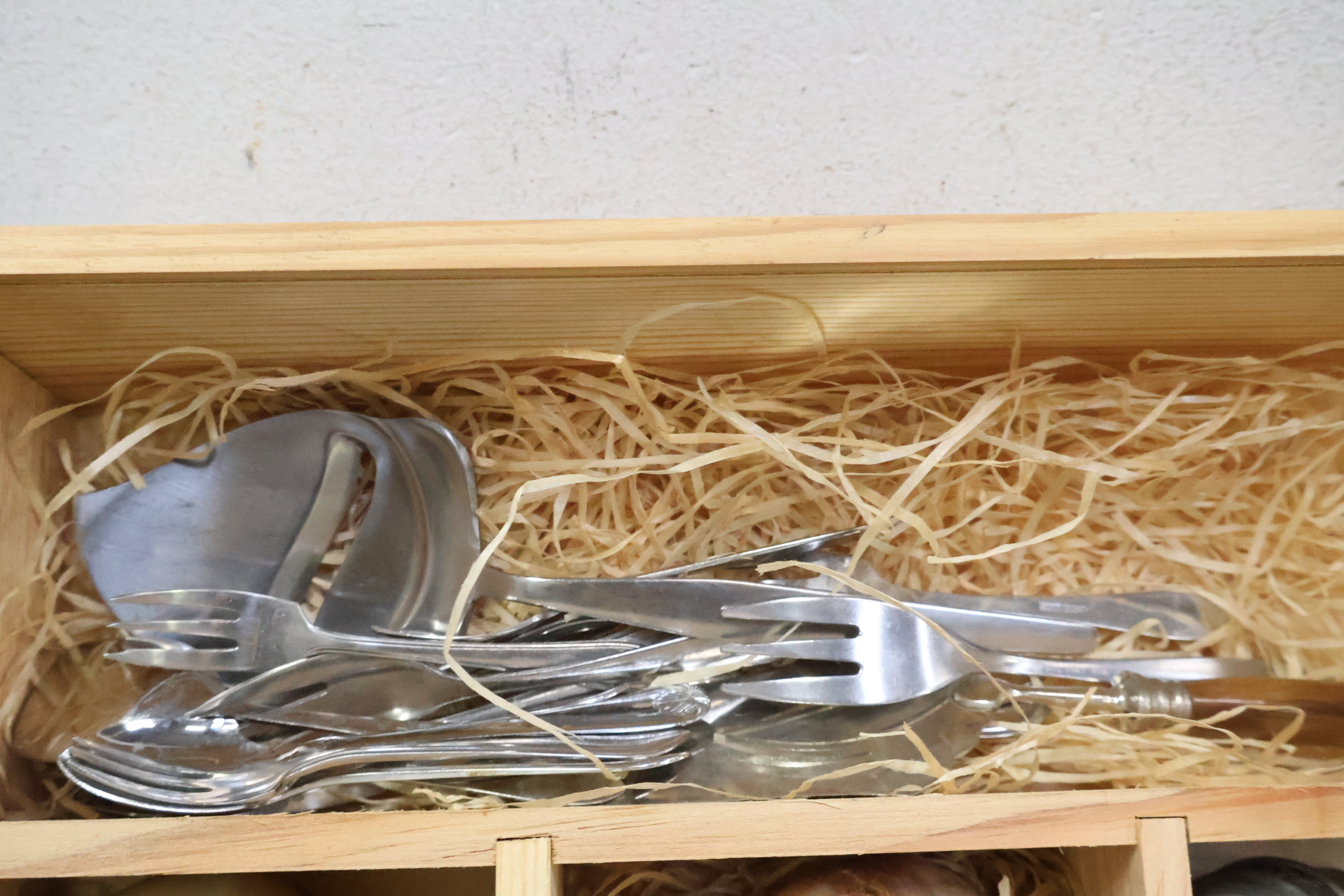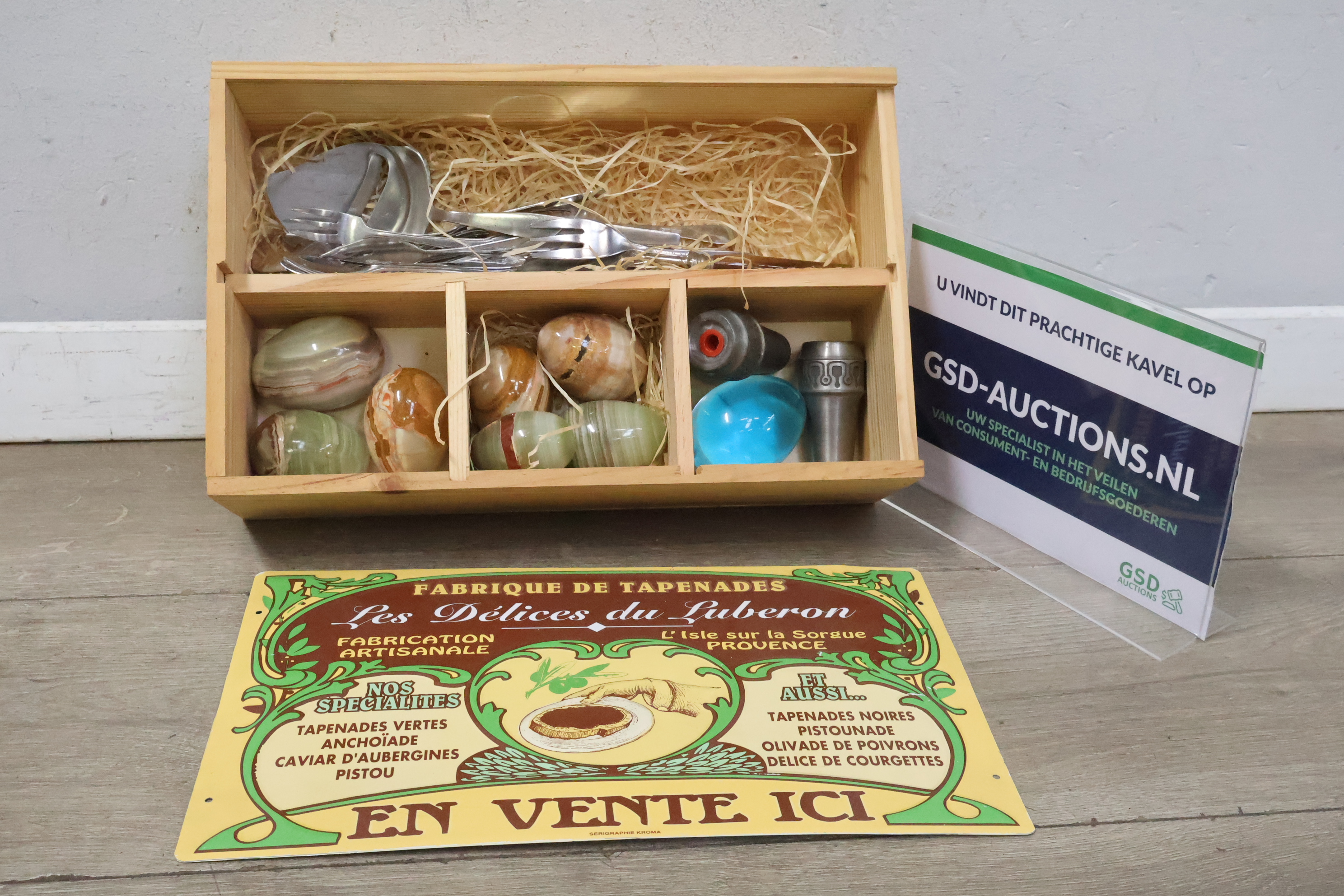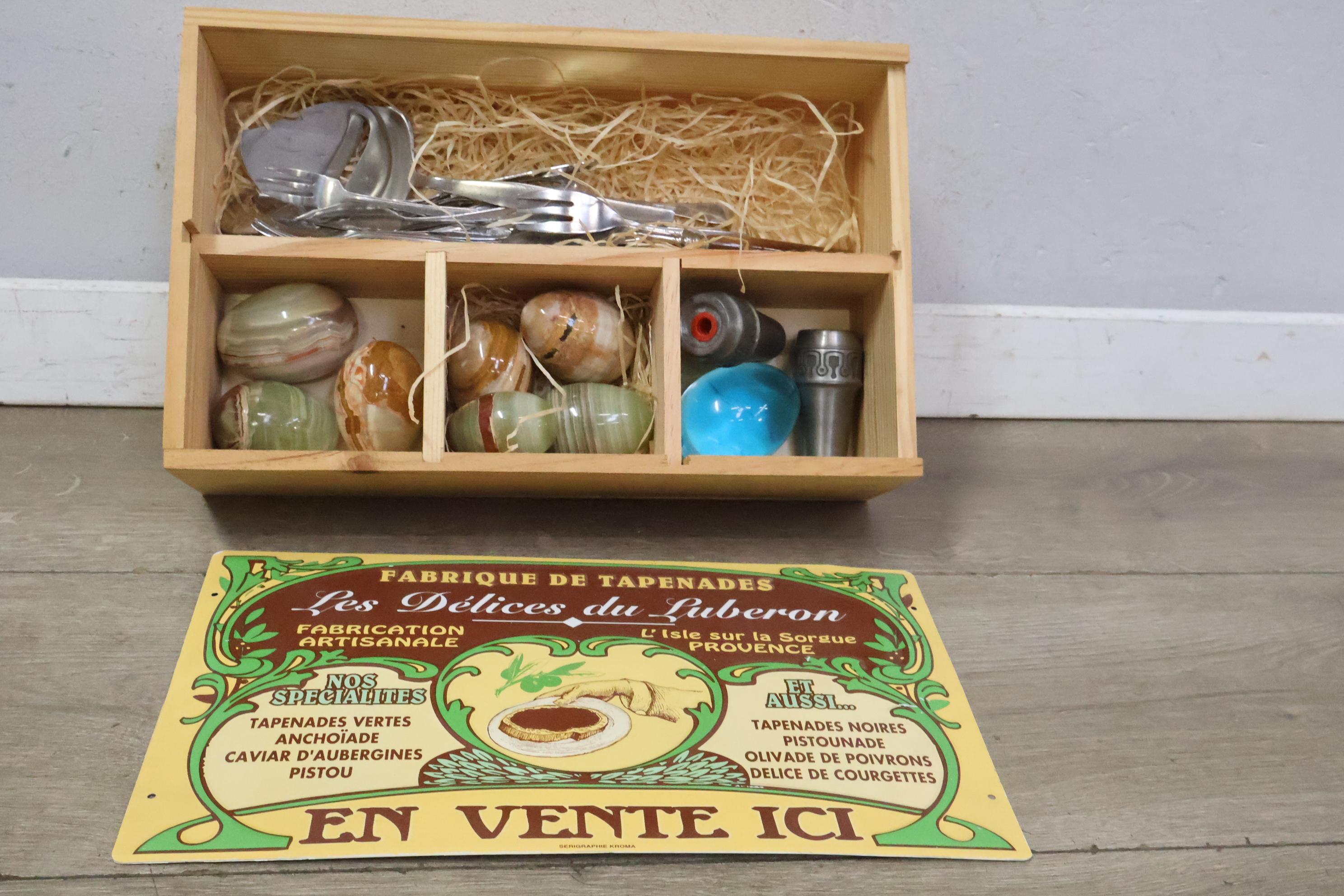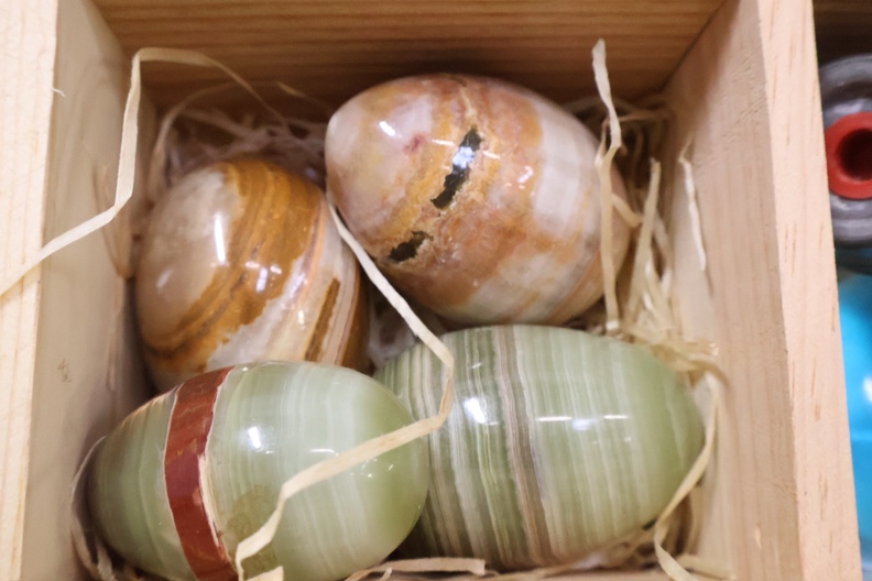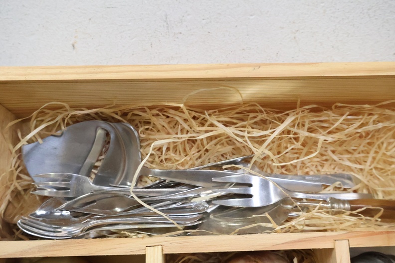 Marmeren eieren, peper/zout vaatjes en bestek in een kistje