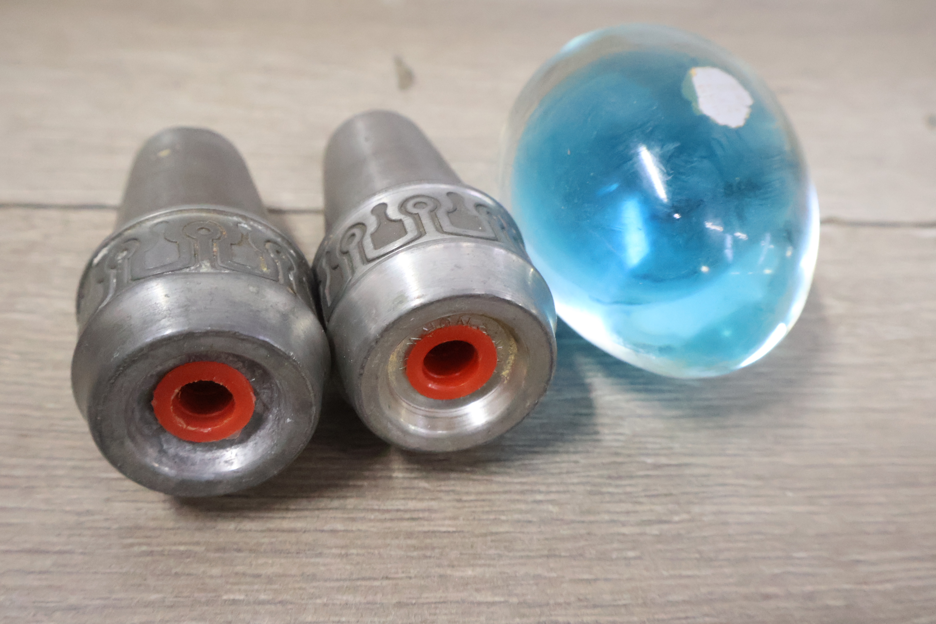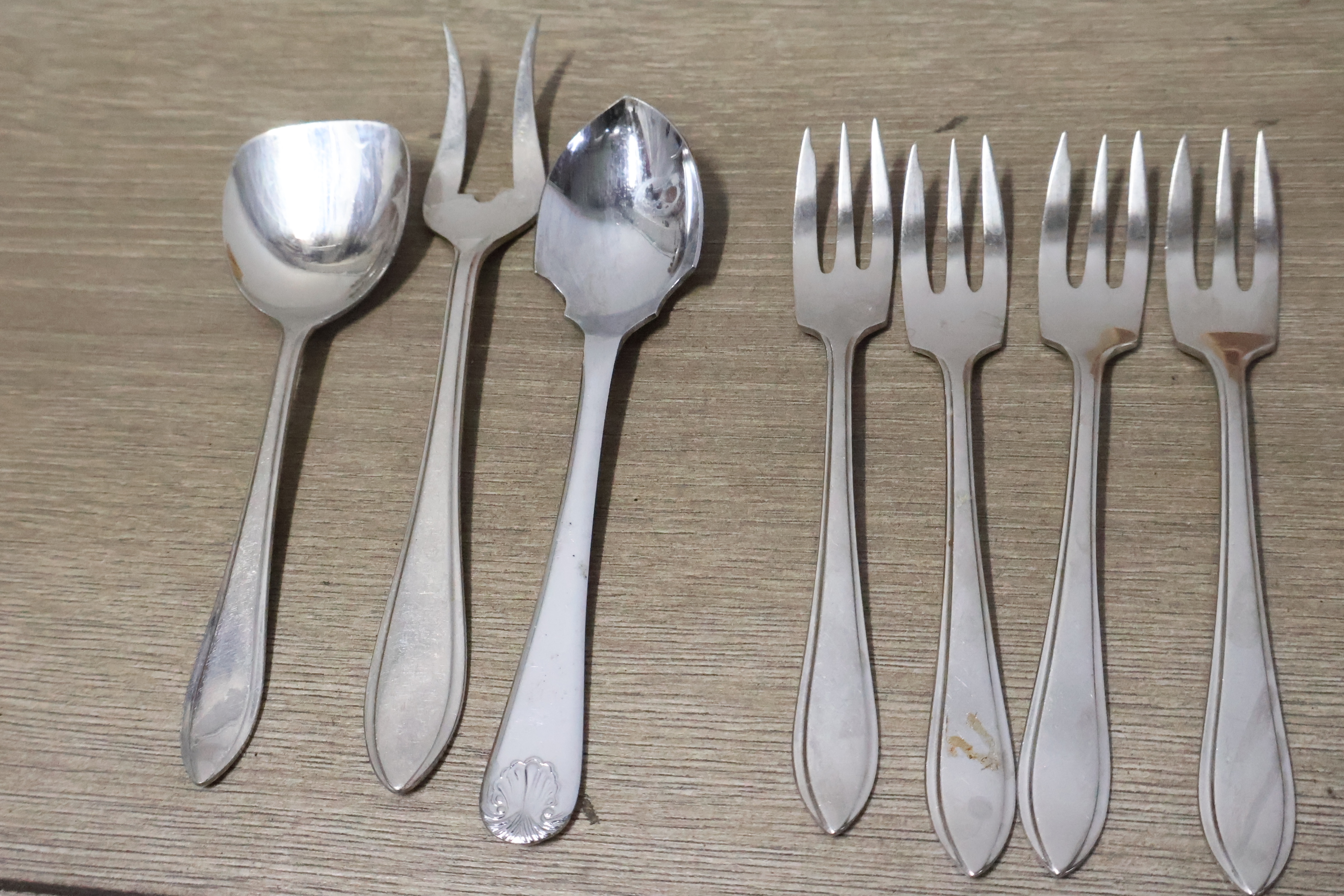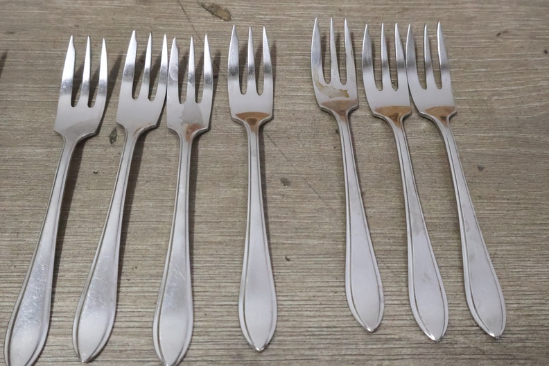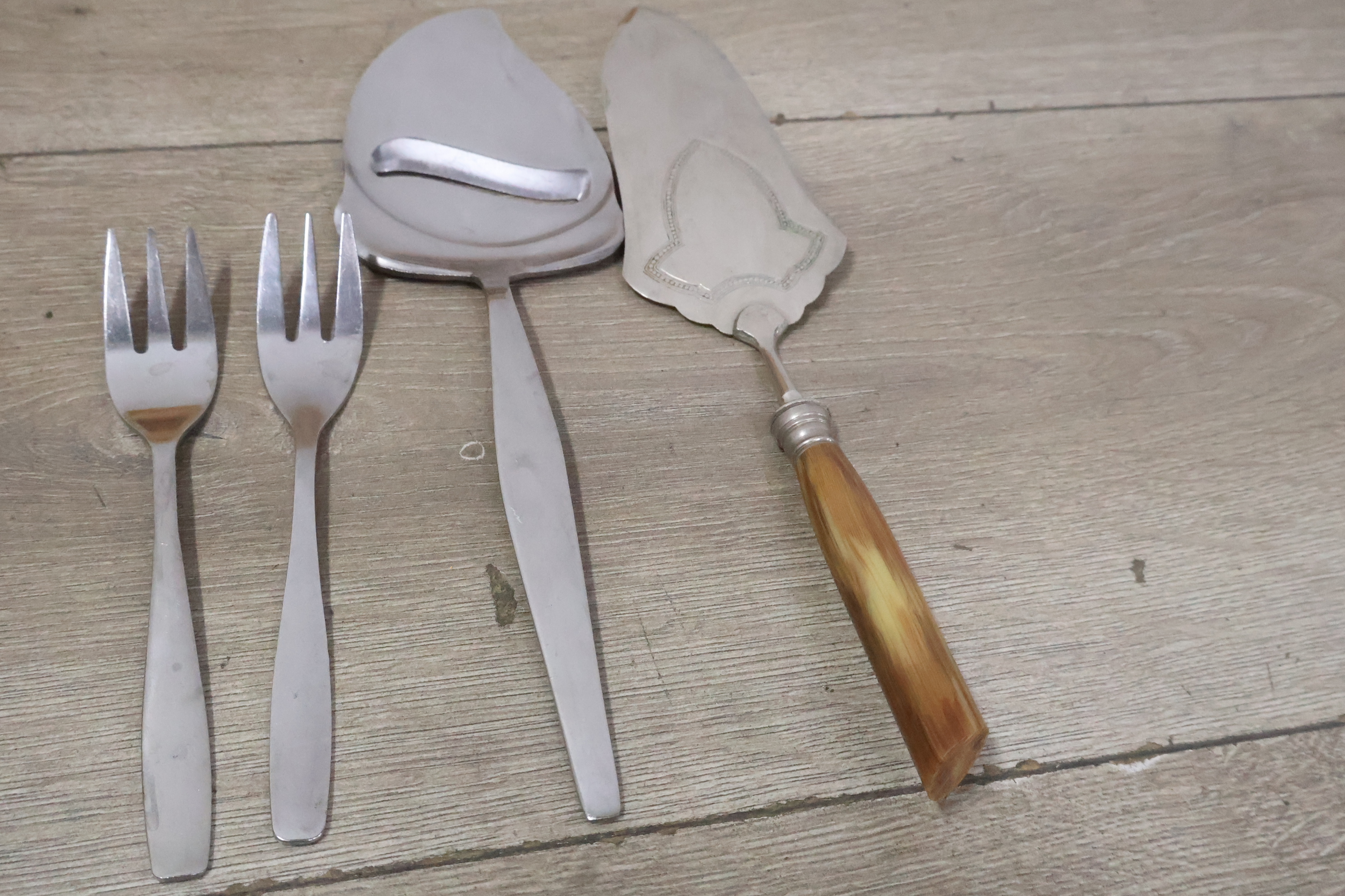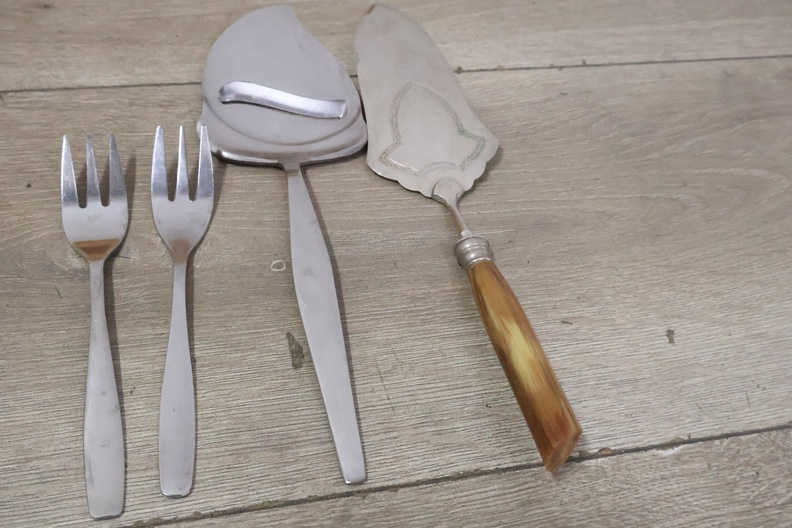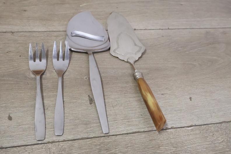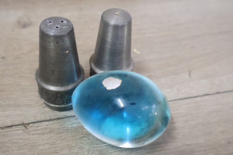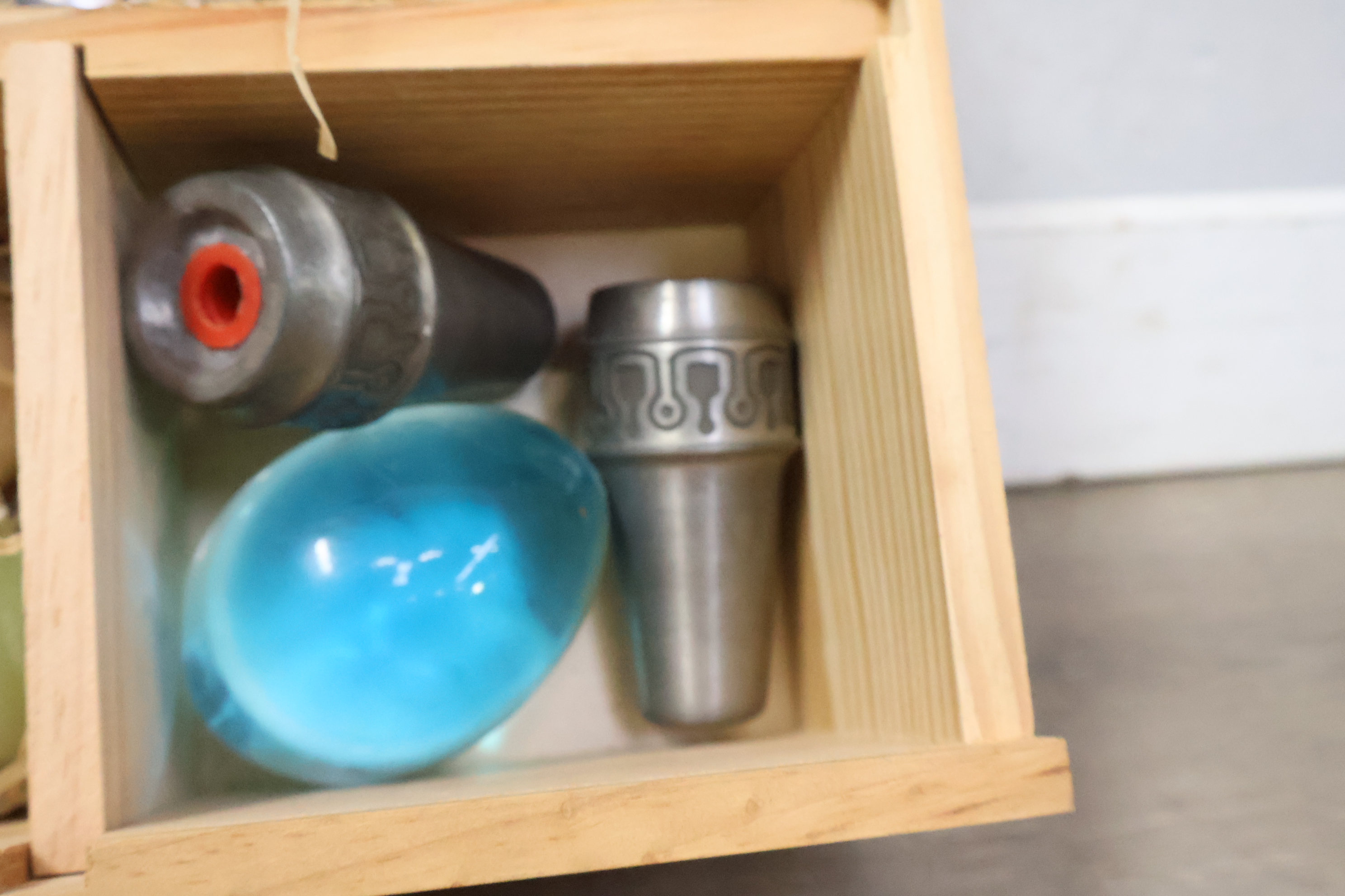 Marmeren eieren, peper/zout vaatjes en bestek in een kistje