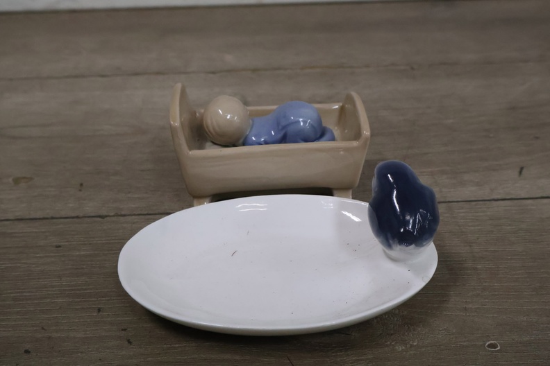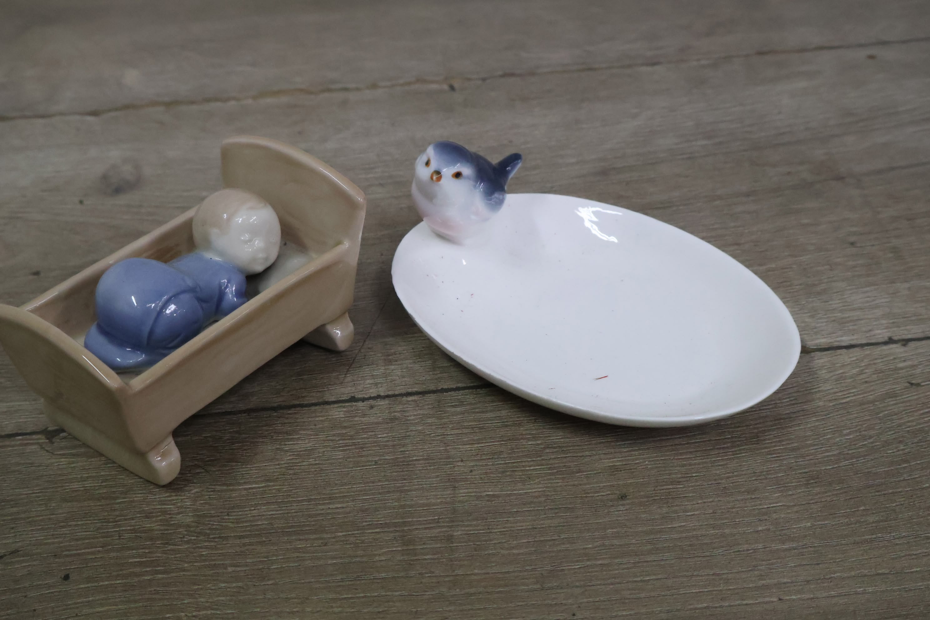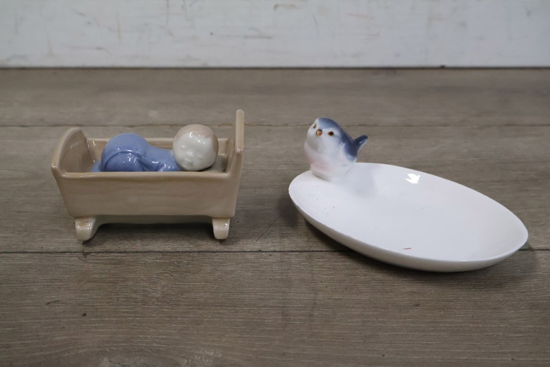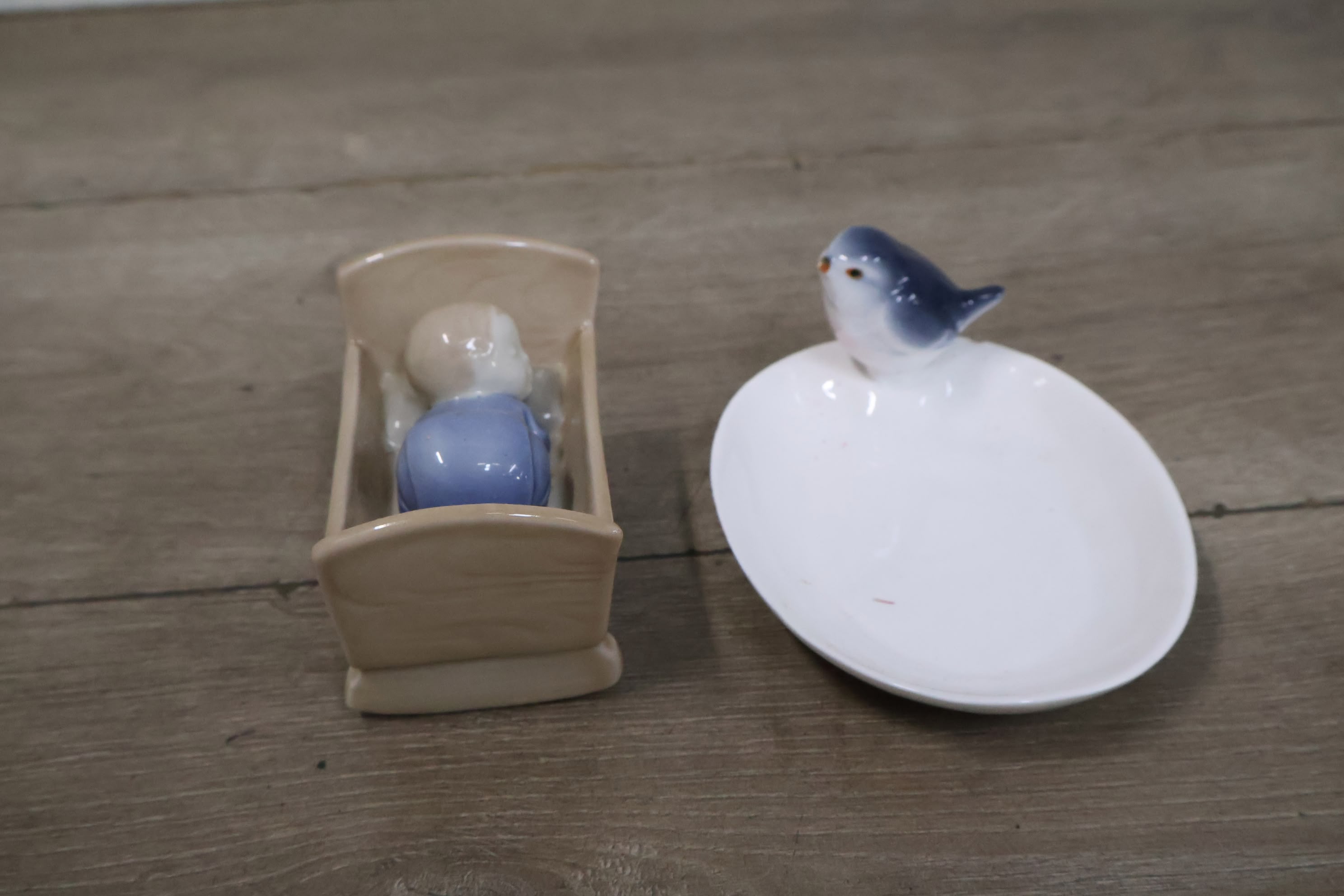 Porseleinen Baby in Kribbe met Vogeldrinkbakje'