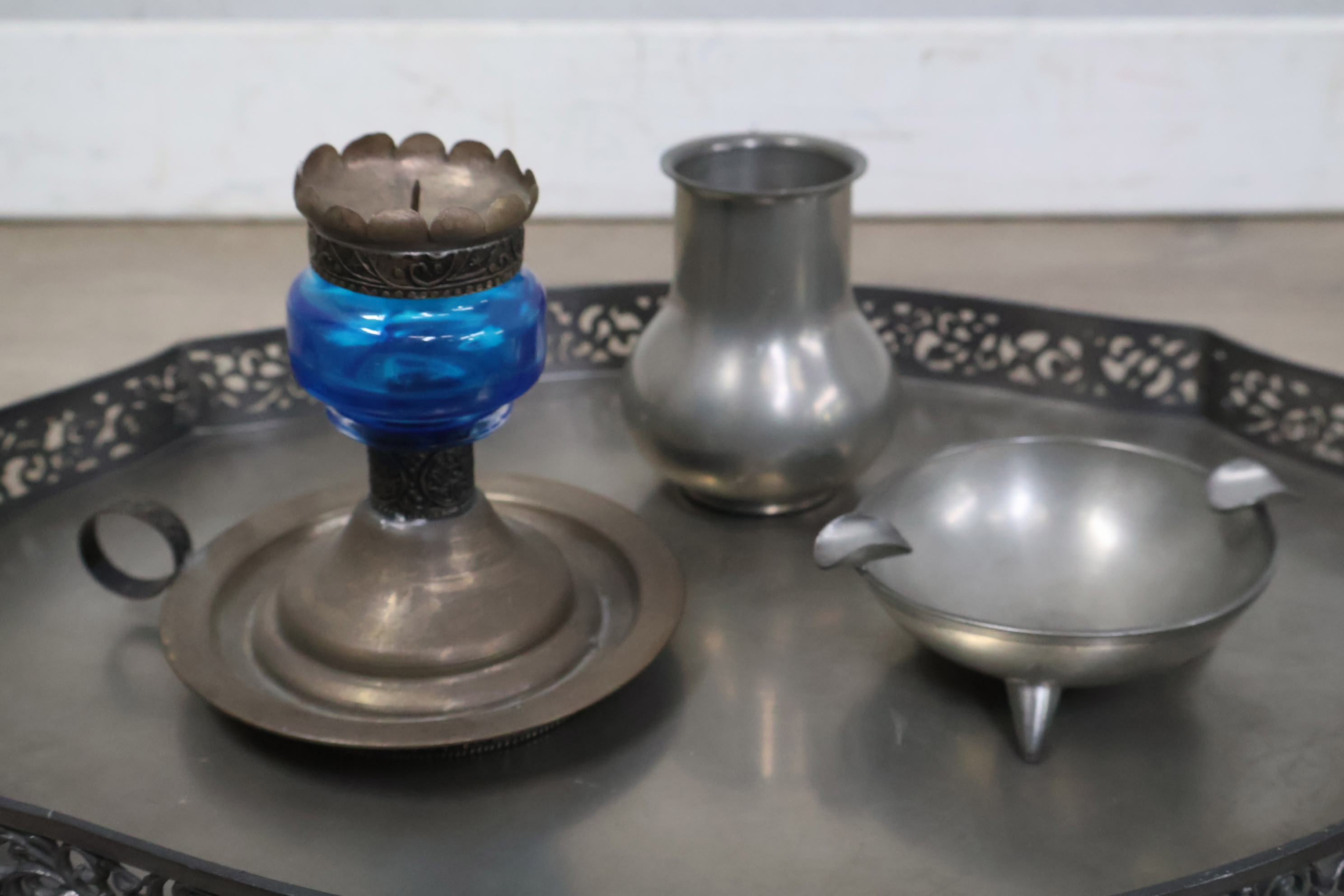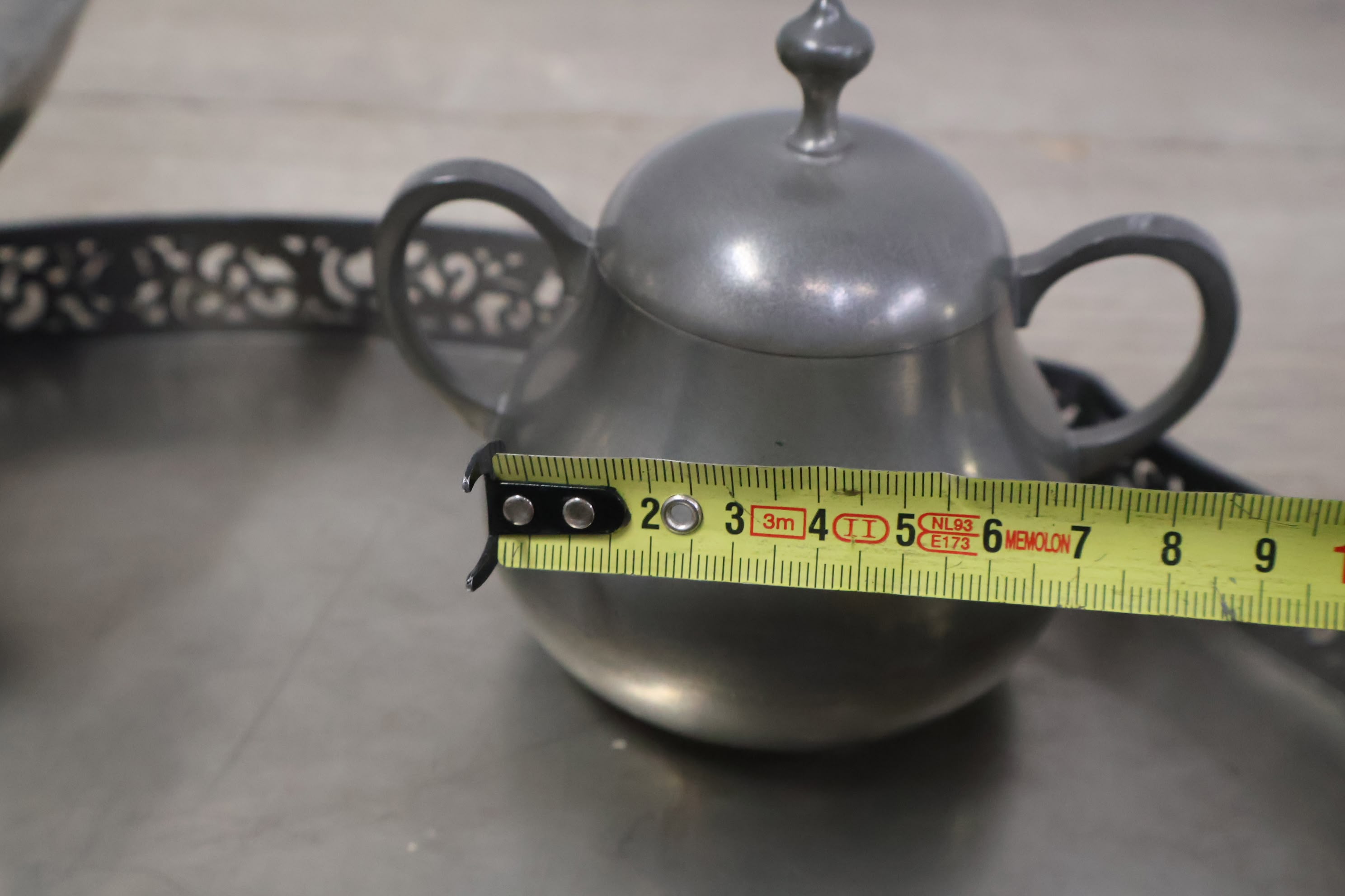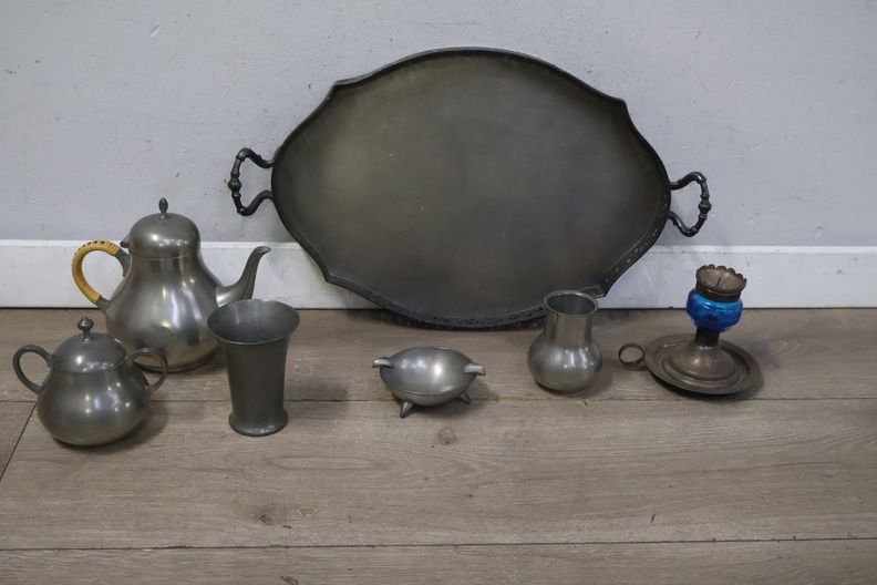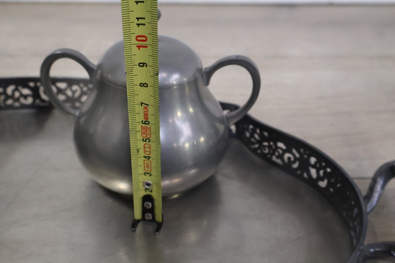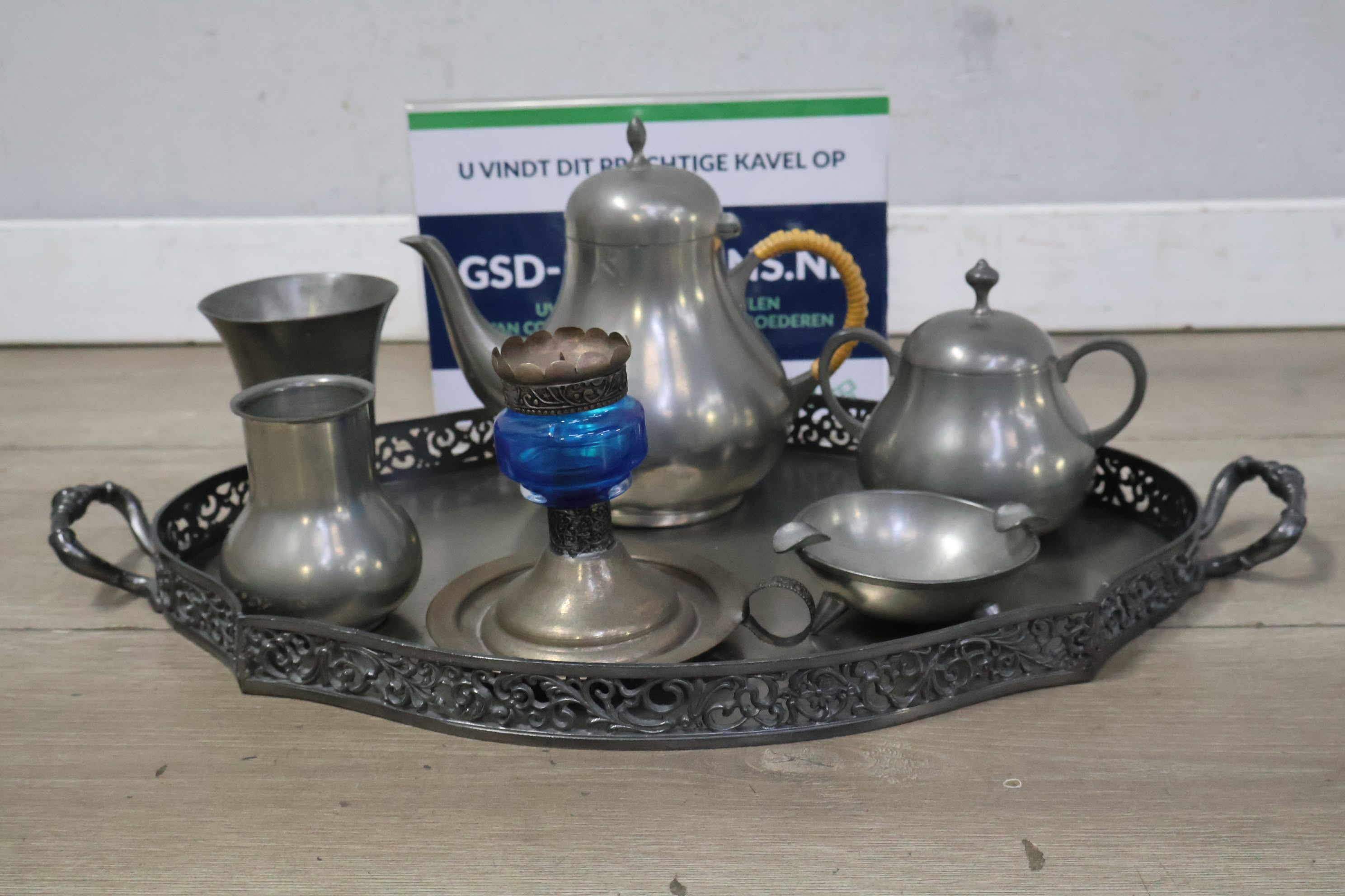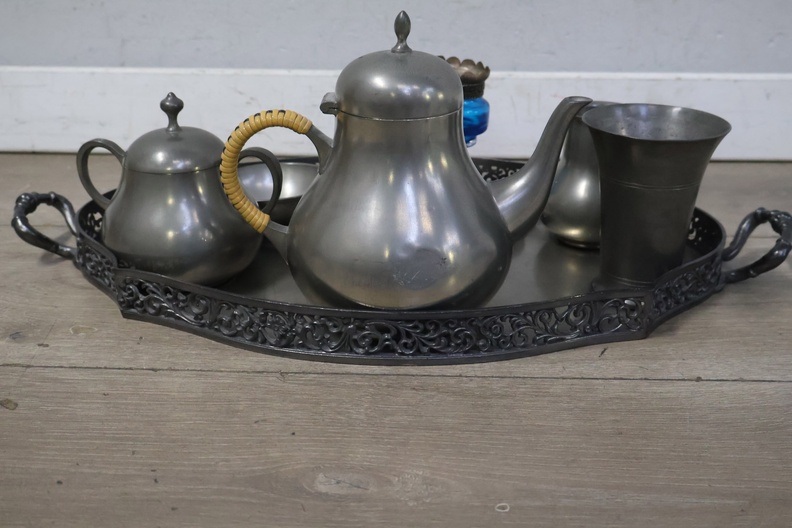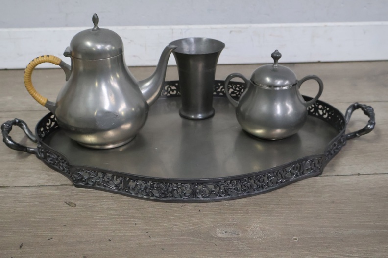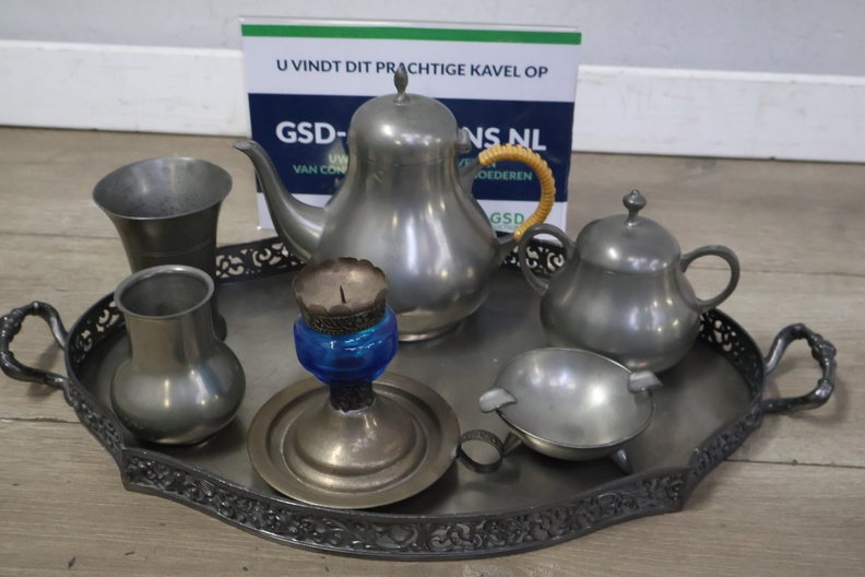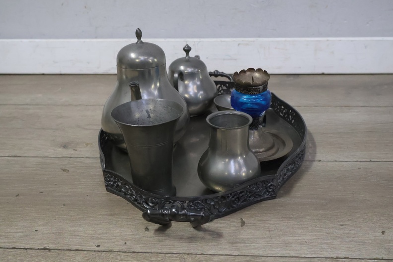 Set van 6 Stuks Antiek Tin op Dienblad