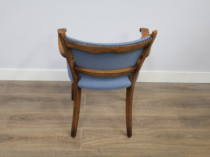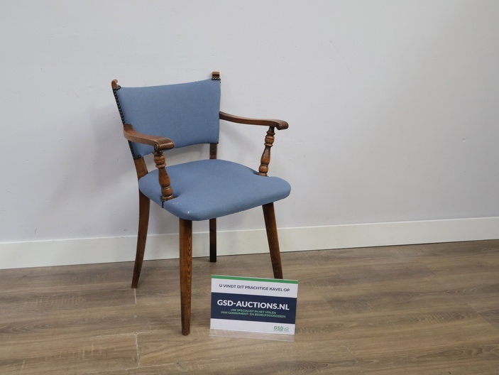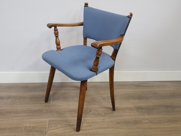 Vintage Houten Armstoel met Blauwe Zitting