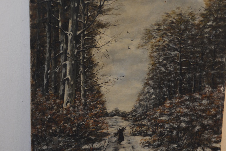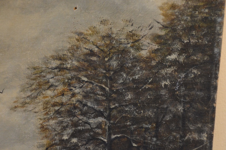 Olieverfschilderij van een winters landschap.