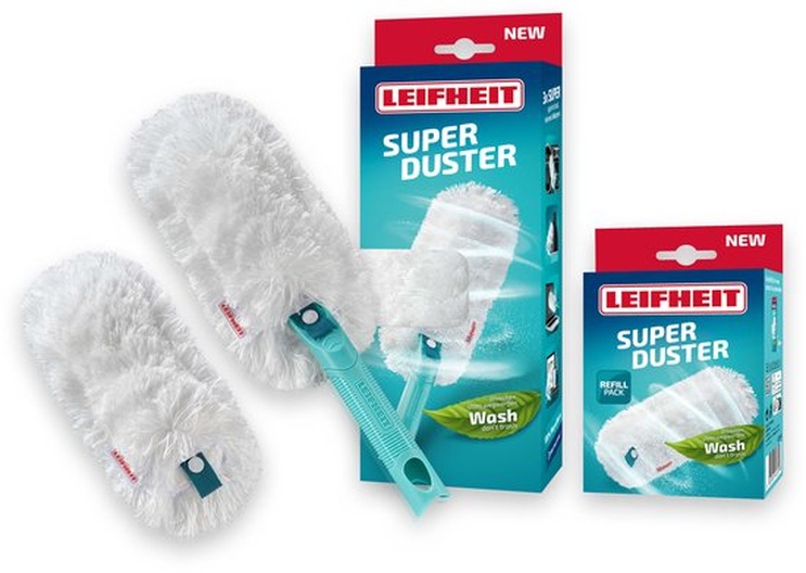 Plumeau SUPERDUSTER M Plumeau set van Leifheit met een extra wasbare stof overtrek: dat is comfort, efficiëntie en duurzaamheid in één product. De nieuwe superkracht tegen stof. Het 360°-textieldeel van microvezel vangt als de beste stof, haren en allergenen en houdt ze vast, zonder opwervelen of verspreiden. Dankzij de wendbare, flexibele greep en het zachte volumineuze textieldeel verwijder je grondig al het stof van voorwerpen op tafel en in het wandrek zonder ze te hoeven verplaatsen, want de plumeau voegt zich makkelijk en flexibel naar boeken en deco. Ook voor nissen en andere moeilijk bereikbare plekjes is de SUPERDUSTER de ideale stofvanger.