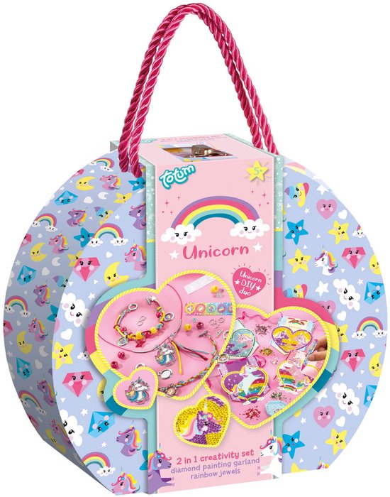 Urenlang speelplezier met dit vrolijke Totum Unicorn 2 in 1 knutselkoffertje maak je zelf de mooiste armbandjes en diamond painting kaarten of slinger. Knutselen was nog nooit zo leuk als met dit koffertje met 2 activiteiten: maak mooie unicorn armbandjes en versier de kaarten met diamond paint strass steentjes. Voeg Unicorn magie toe aan jouw dag of verras iemand met je zelfgemaakte creaties!