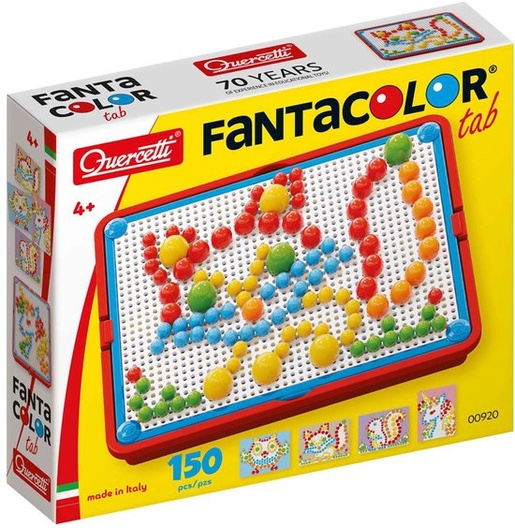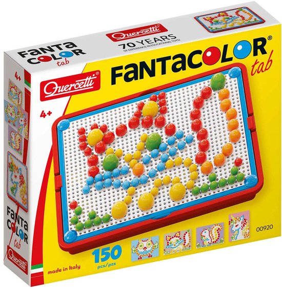 Deze Quercetti FantaColor portable small is een tijdloos creatief spel dat al vele generaties kinderen boeit. Duw de pinnen in het geperforeerde bord en volg je verbeelding. Uitstekend voor de hand-oogcoördinatie. Kinderen kunnen hun eigen mozaïeken maken of de voorbeelden volgen uit het voorbeeldboekje. Alle onderdelen zijn makkelijk op te bergen d.m.v. het geperforeerde bord wat tevens als deksel dient en vast is te maken op het opbergvak. Makkelijk om mee te nemen op reis en uiterst draagbaar d.m.v. het handvat en kan tevens gebruikt worden om het kunstwerkje op te hangen als originele versiering van een kinderkamer. Om opnieuw te beginnen draai het bord gewoon om boven het opbergvak en druk de pinnen er uit. De set wordt geleverd met 150 pinnen in verschillende kleuren en 3 verschillende maten (10, 15 en 20mm.). Geschikt voor kinderen vanaf 4 jaar.