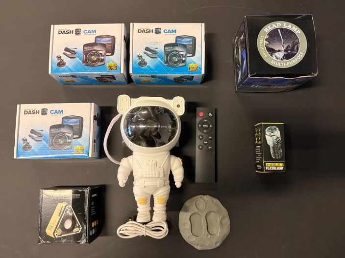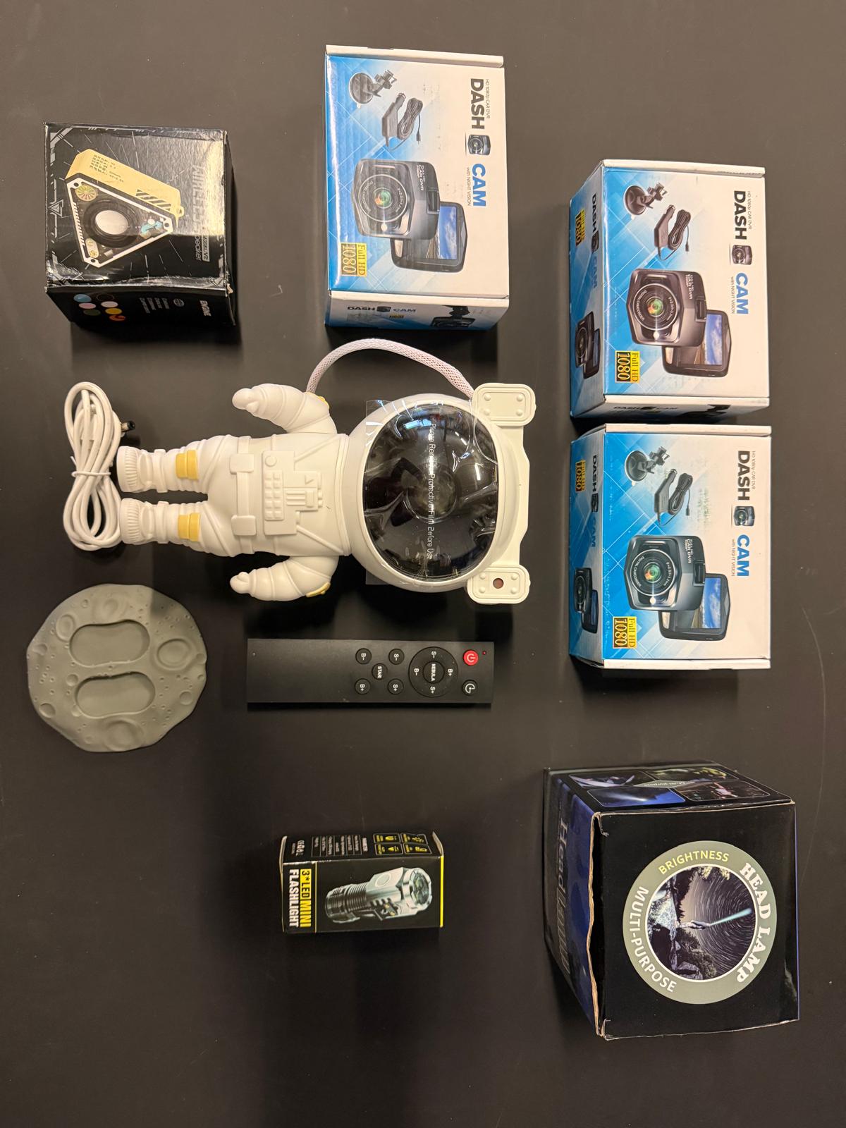 Set van 11 overstock en retourgoederen. De producten zijn retour gestuurd door klanten vanwege ofwel defecten, beschadigingen, problemen met installatie of simpelweg omdat de koper zich heeft bedacht. Een deel van deze goederen is overstock en gloednieuw. De retour goederen zijn voor zover mogelijk compleet gemaakt. De set bestaat uit 3 dashcams, 1 astronaut plafond projector, 1 set draadloze oordopjes, 1 bidet (nieuw), 1 waterdichte speaker, 1 mini zaklamp, 2 draadloze deurbellen en 1 hoofdlamp.