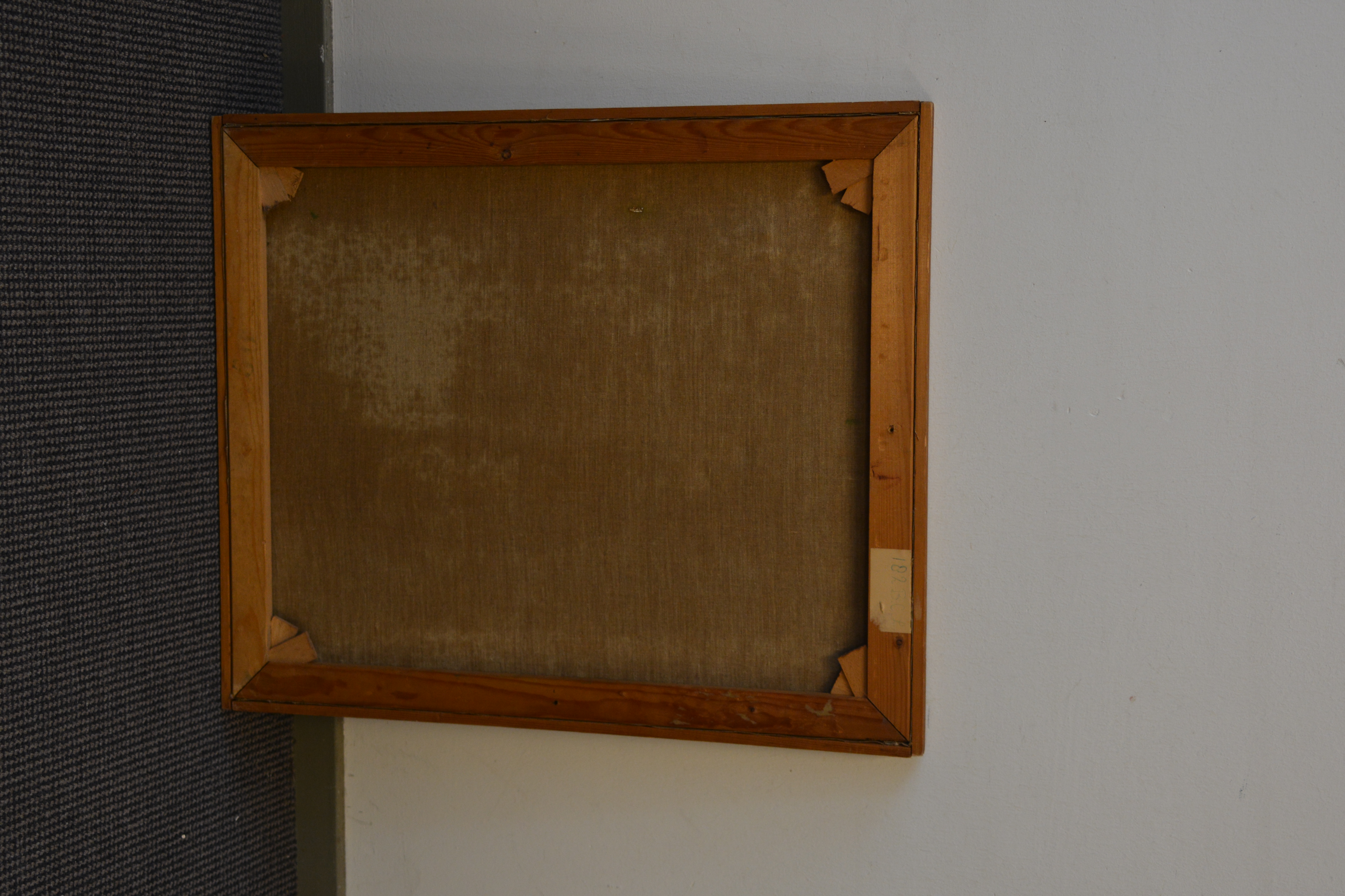 Het lijkt een flatgebouw met een raam. Maar kan ook iets anders zijn. Olieverfschilderij op doek. Ingelijst. In goede staat.