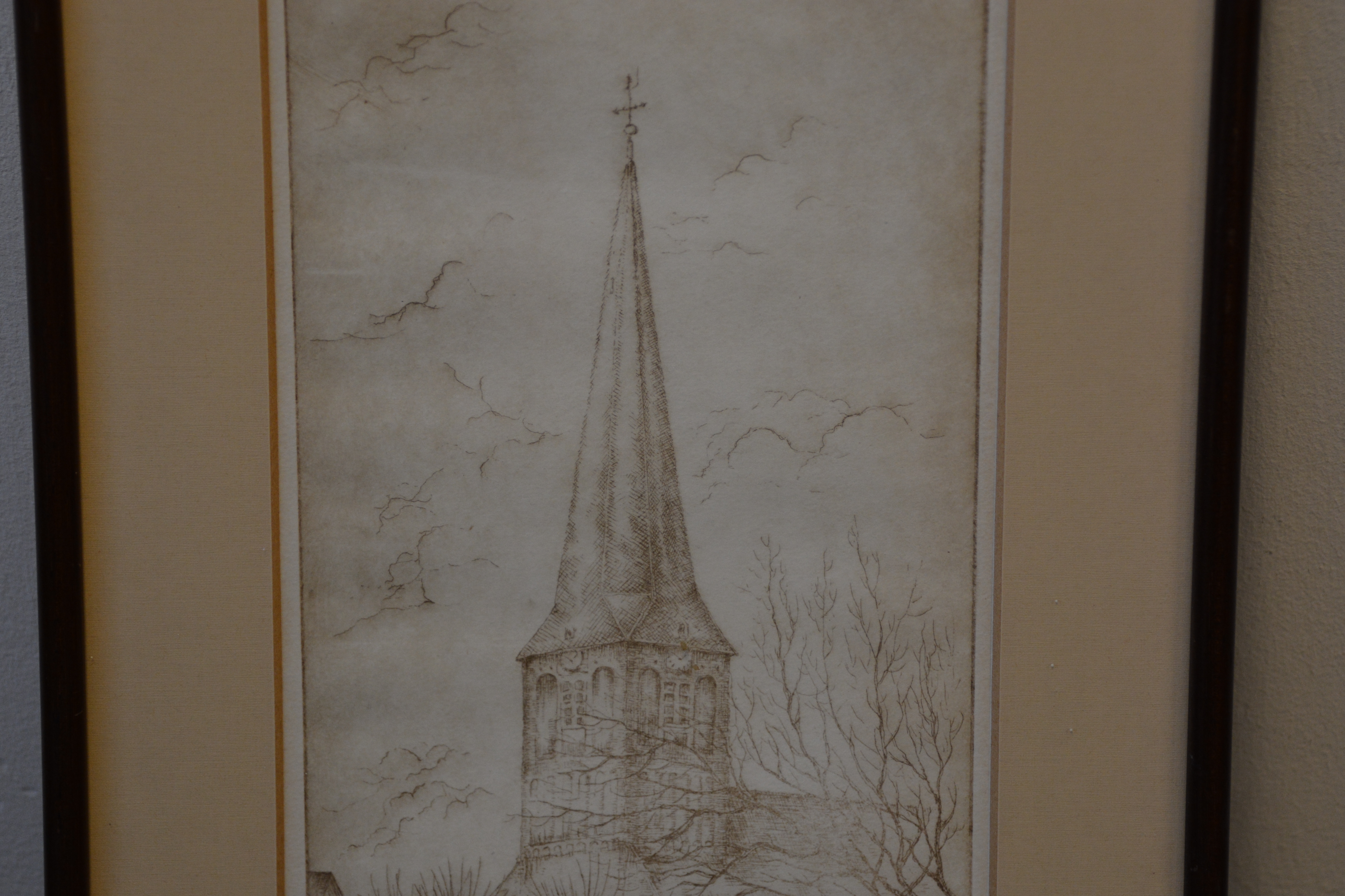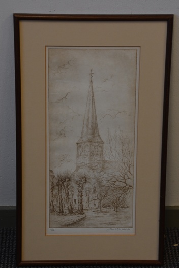 Origineel, no. 10/20 stuks. Jan Goselink geboren in 1928 in Collendoorn (Hardenberg), aquarellist, etser, schilder. Na zijn lerarenopleiding nam Jan Goselink tekenlessen en behaalde de L.O.-akte tekenen. Hij is echter altijd werkzaam geweest als docent wiskunde en maakte zijn tekeningen, etsen, aquarellen, gouaches en olieverfschilderijen in zijn vrije tijd. Hij heeft een voorkeur voor onderwerpen dicht bij huis en vooral de natuur, dier en plant, is voor hem een inspiratiebron. Voor het werk van de schilder en illustrator Anton Pieck heeft hij grote bewondering en dat heeft invloed gehad op zijn werk. De oorspronkelijhke kerk stond aan de zeedijk langs de Zuiderzee, maar werd na stormschade en brand in 1825 afgebroken. Ingelijst en onder een passe-partout. In goede staat.