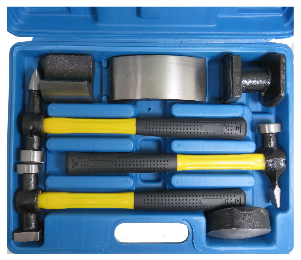 Uitdeukset 8-dlg.-bestaande uit 5 meeste gebruikte tassen voor het uitblutswerk en 3 plaatsslagerhamers alle met een glasvezelsteel.
