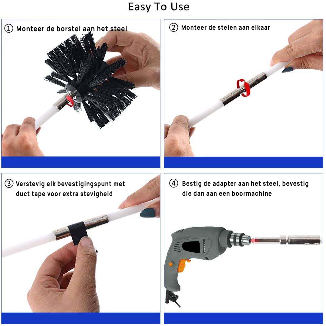De borstels zijn gemaakt van duurzaam nylon en geschikt voor een breed scala aan toepassingen. Ze reinigen schoorstenen, drogers, boilers en andere pijpleidingen met gemak. De borstelkop kan eenvoudig worden vervangen en is te gebruiken met of zonder boormachine. Regelmatig gebruik helpt om de prestaties van je wasdroger te verbeteren, de droogtijd te verkorten en brandgevaar door opgehoopte pluizen of vuil aanzienlijk te verminderen.