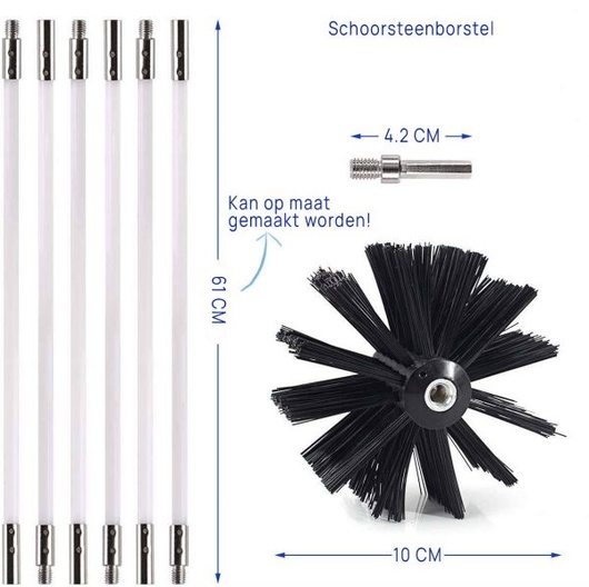 Standaard worden er twee borstels meegeleverd van 10 en 15 cm diameter. Zo heb je altijd de juiste maat borstel voor jouw schoonmaakklus, of het nu om een smalle leiding of een bredere schoorsteenpijp gaat.