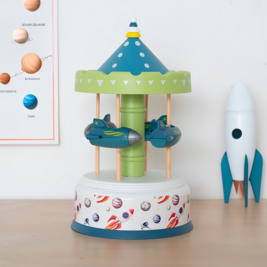 "Een mooie ronddraaiende carrousel van raketjes. Wind de draaimolen op door de bovenkant te draaien en het speelt een leuk muziekje af! Leuk voor de babykamer of als decoratie item in het huis.