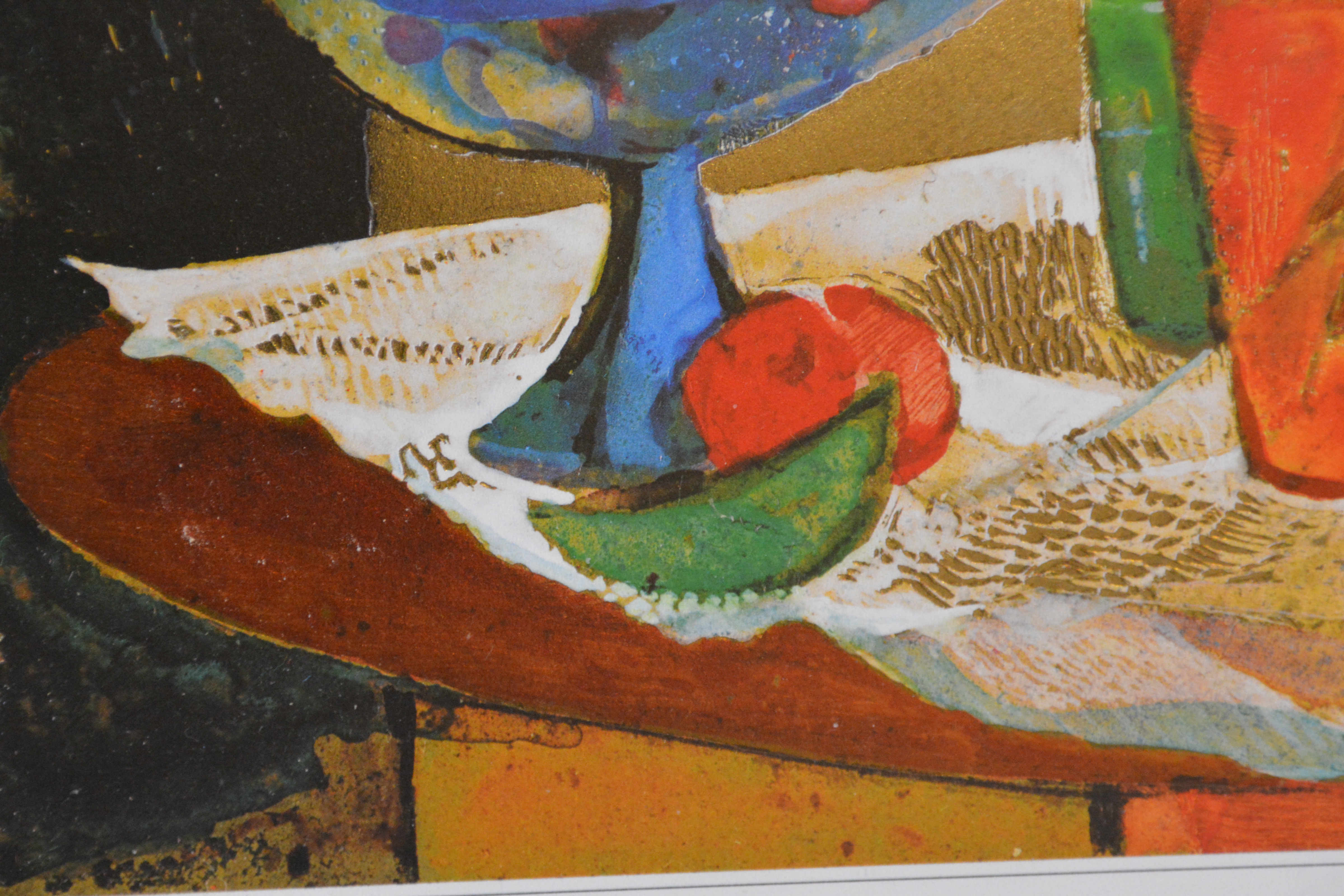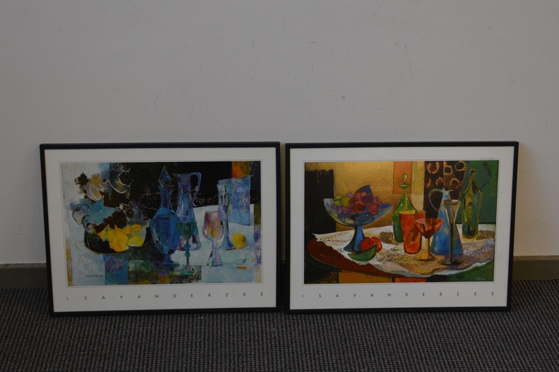 2 Ingelijst artprints. Goudkleurige achtergronden. Vrolijk en kleurig werk. In goede staat.