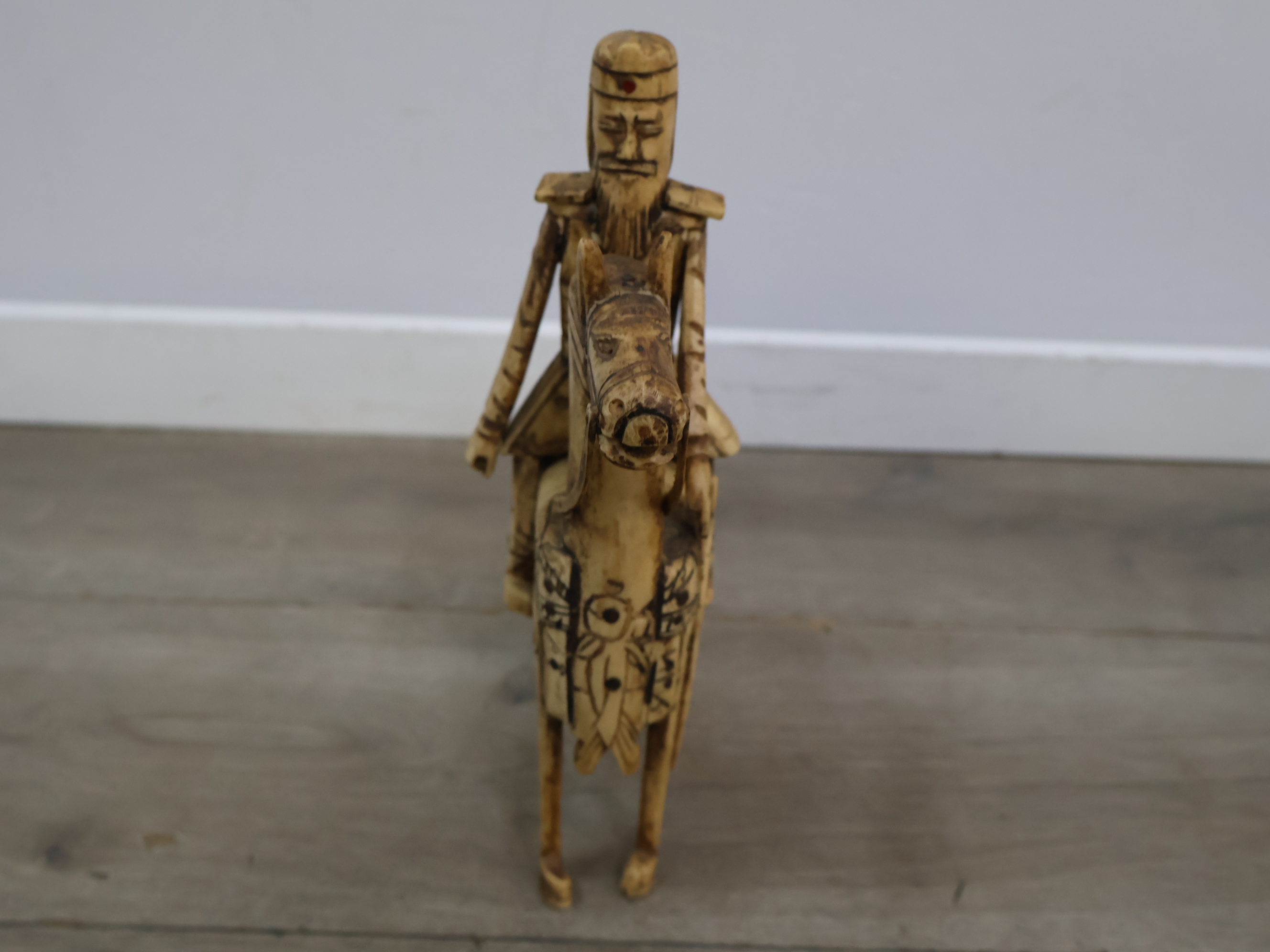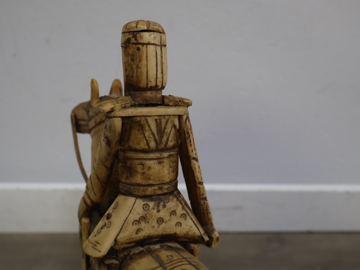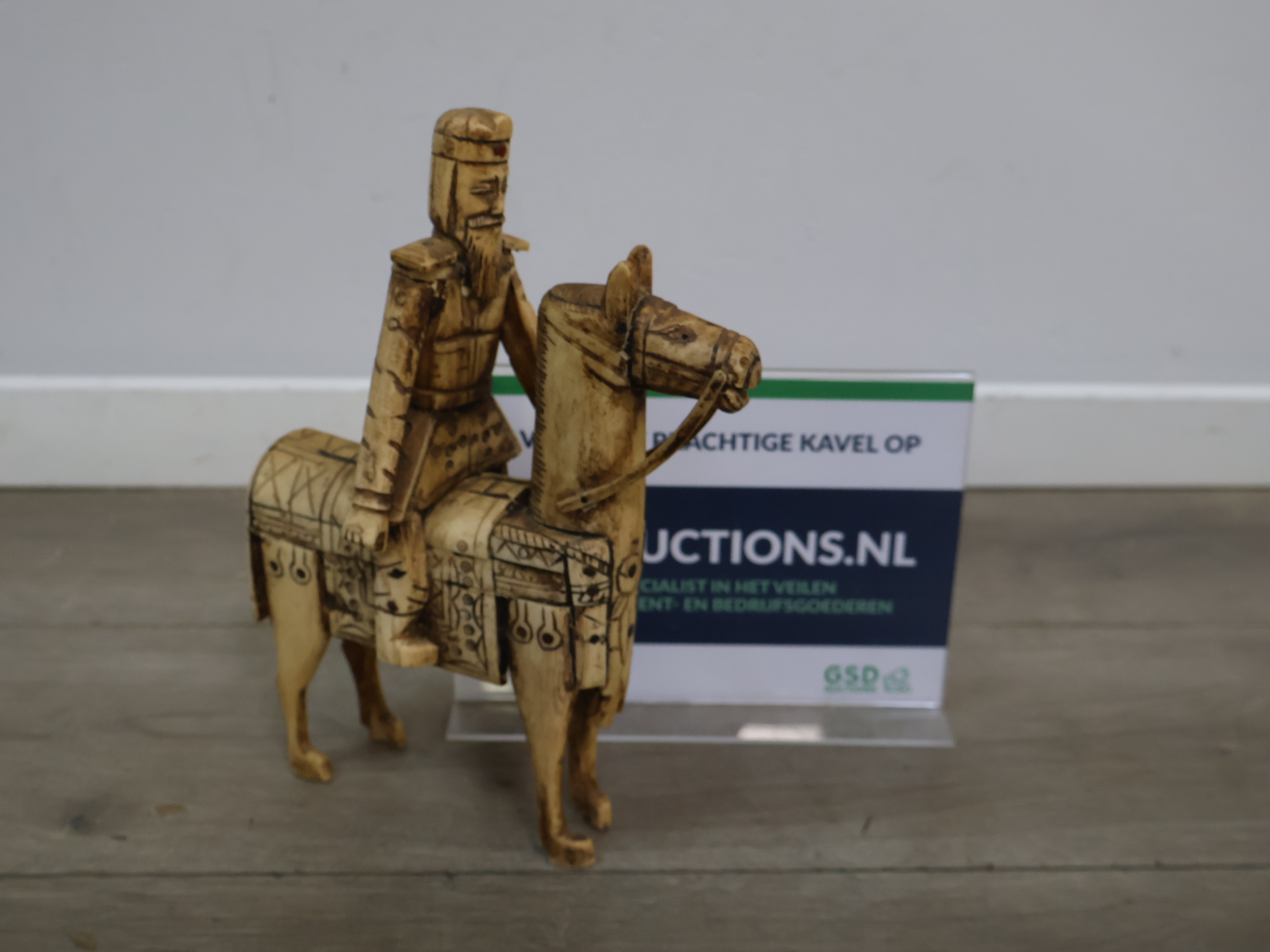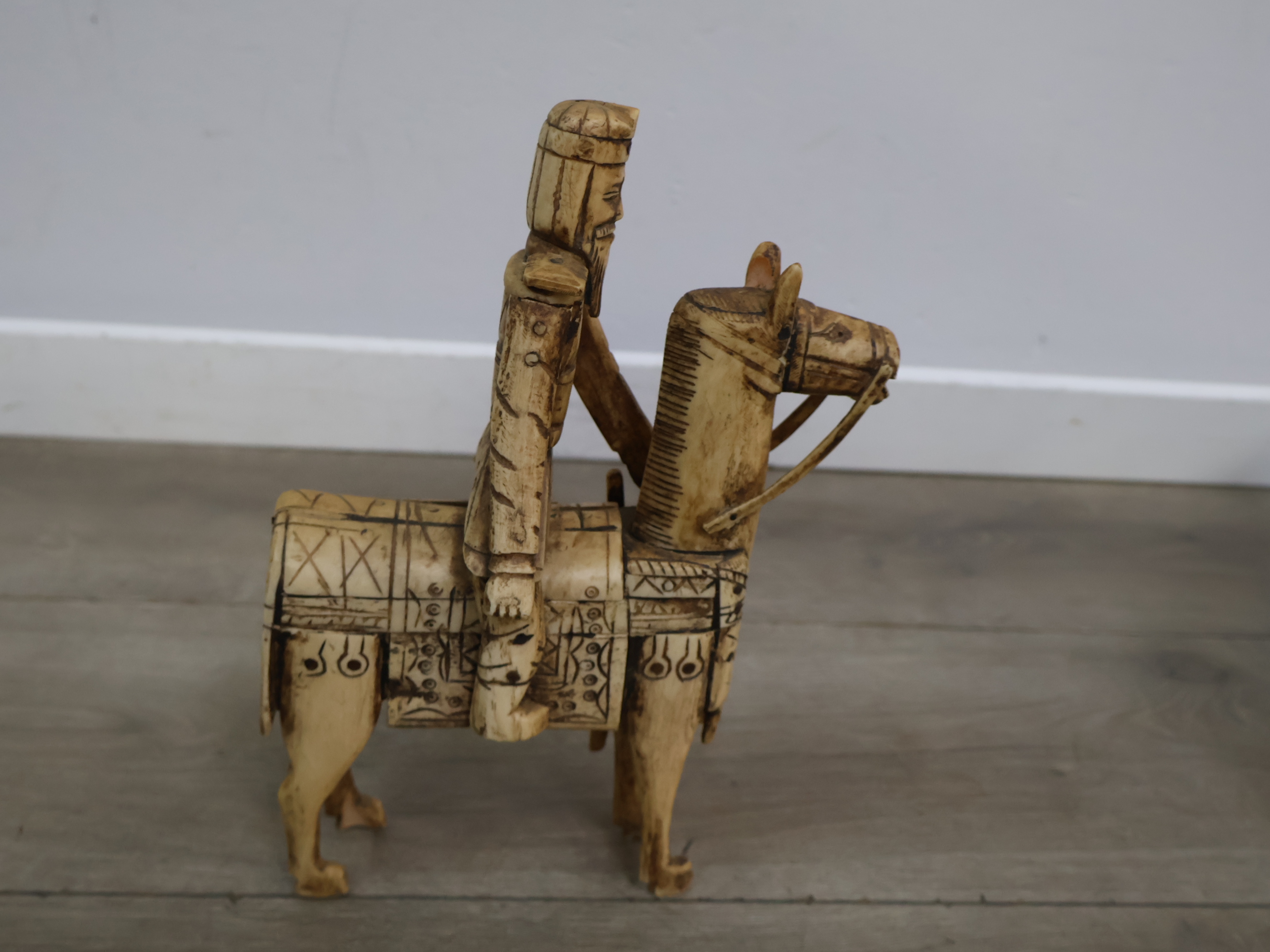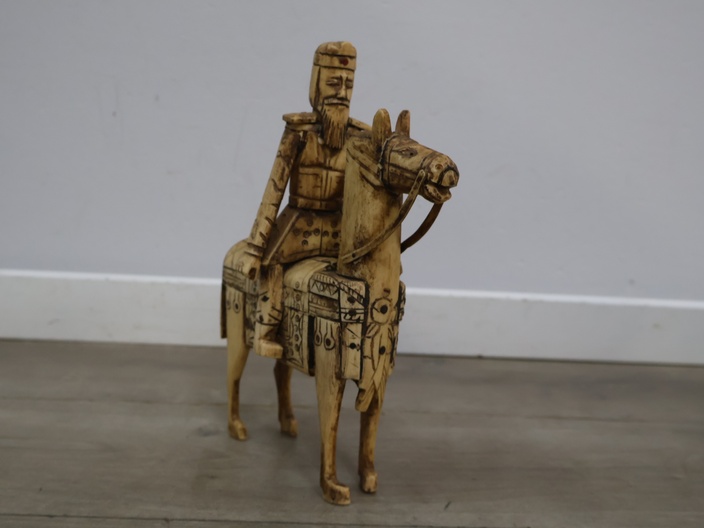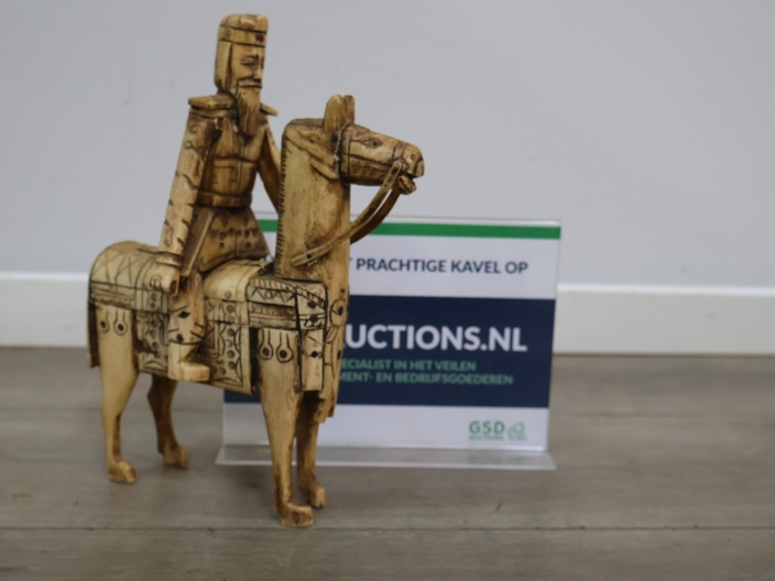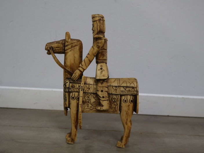 Houten snijkunst beeldje van een ruiter en paard