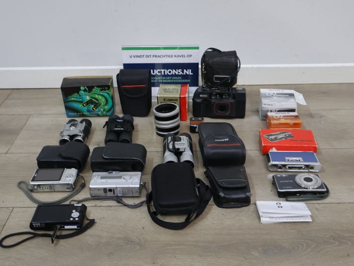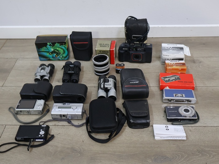 Mix van verrekijkers, fotocamera's en een lens