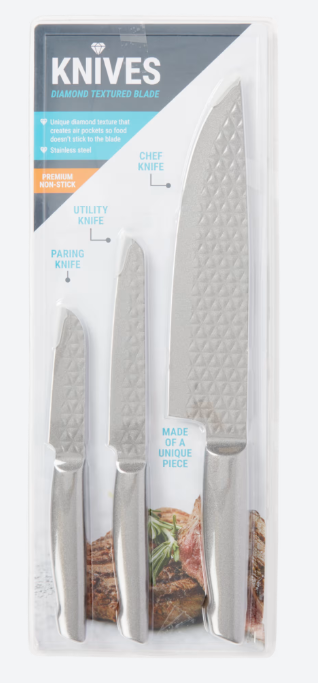 3-delige Keukenmessenset met Unieke Diamantstructuur – Zilverkleur – RVS Messen met Antiaanbaklaag