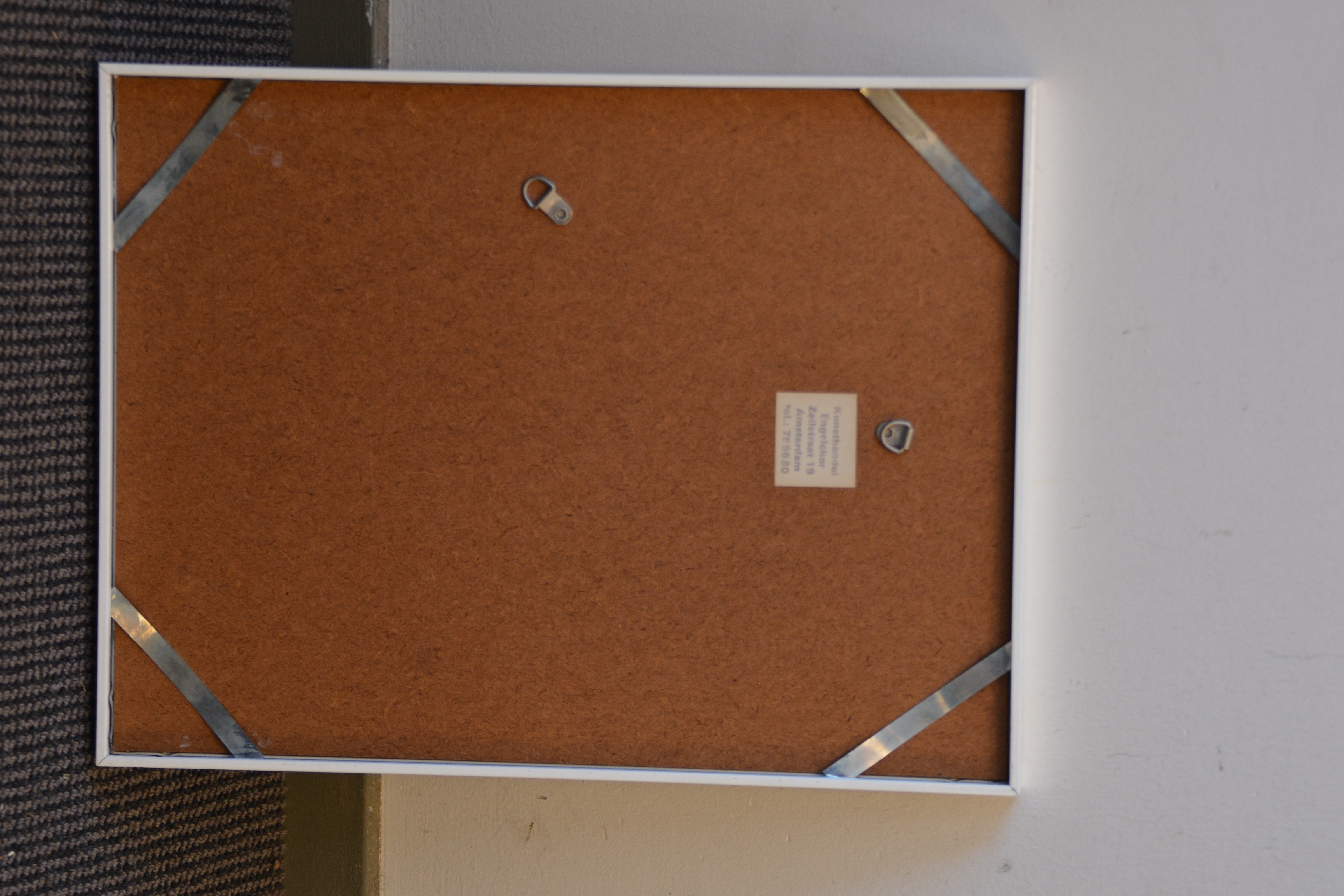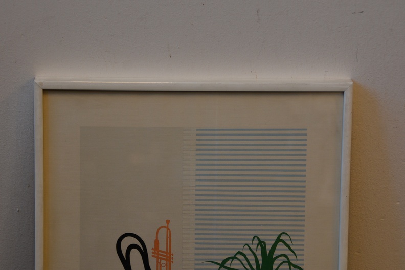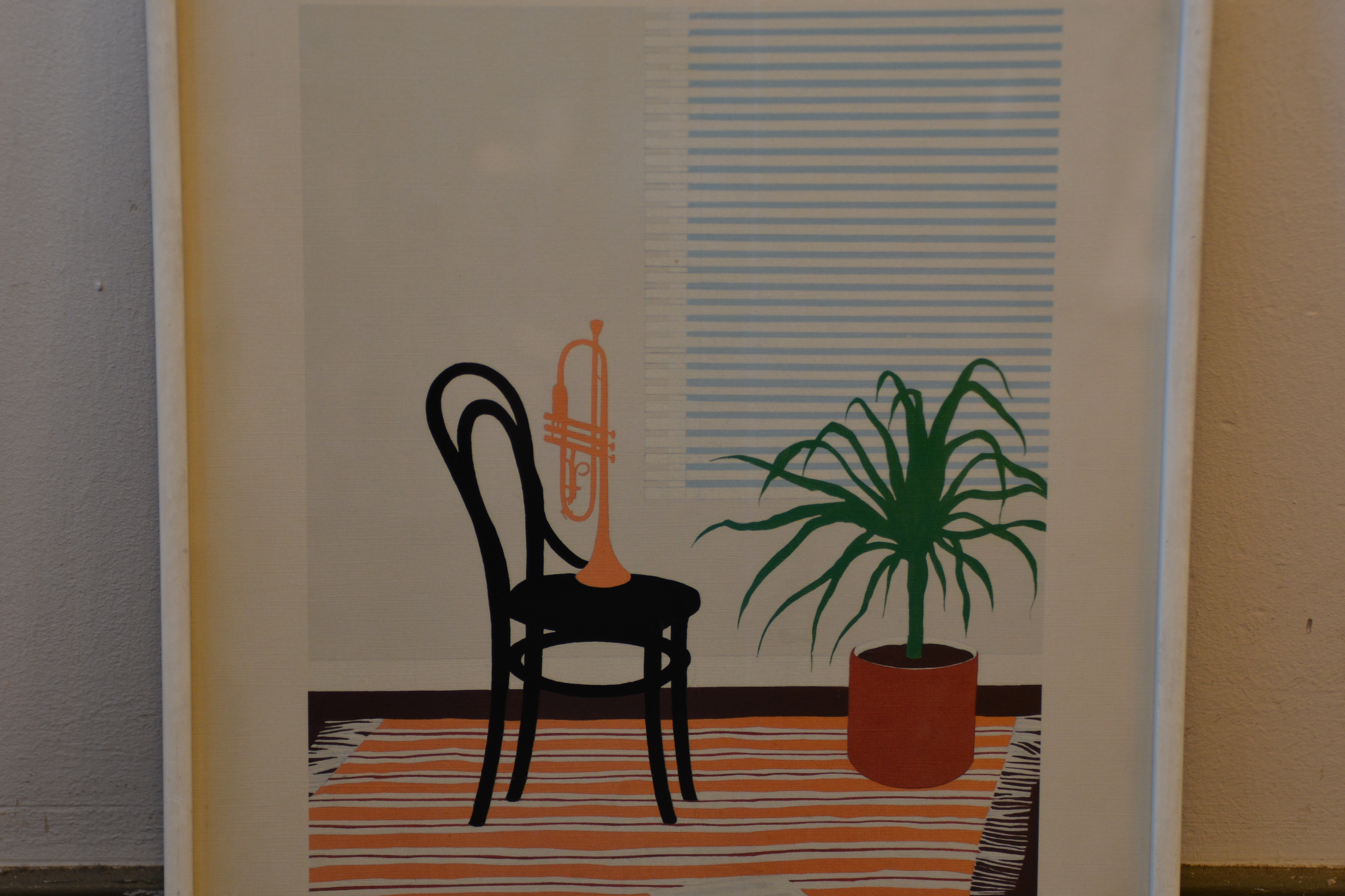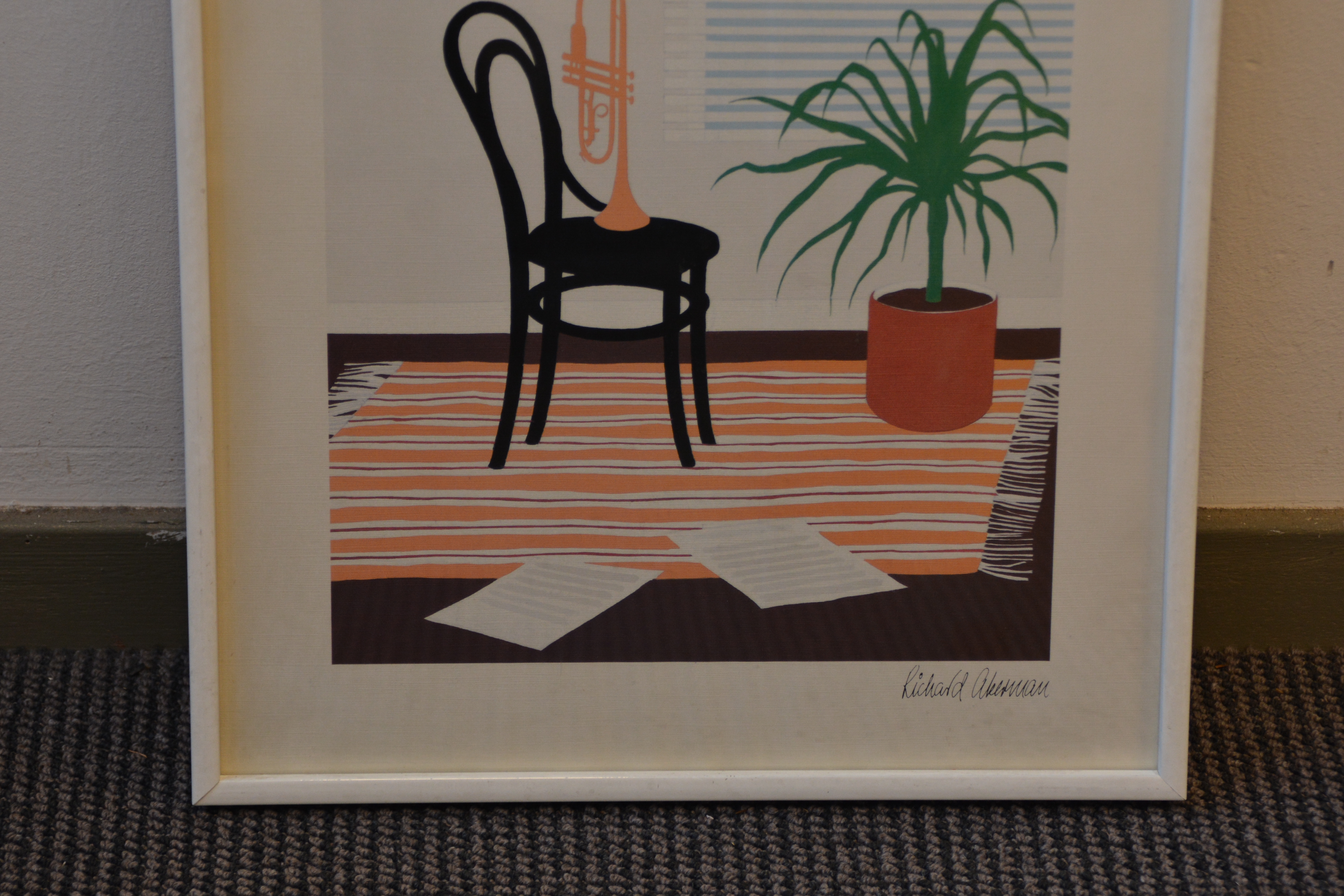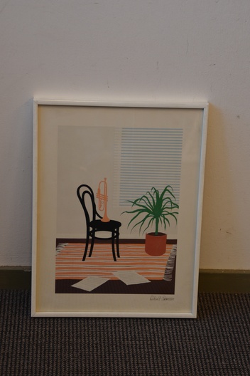 Gekocht bij een kunsthandel.te zien is een kamerinrichting met kleed, stoel, plant en kleed. Op de stoel staat een portret. In goede staat.