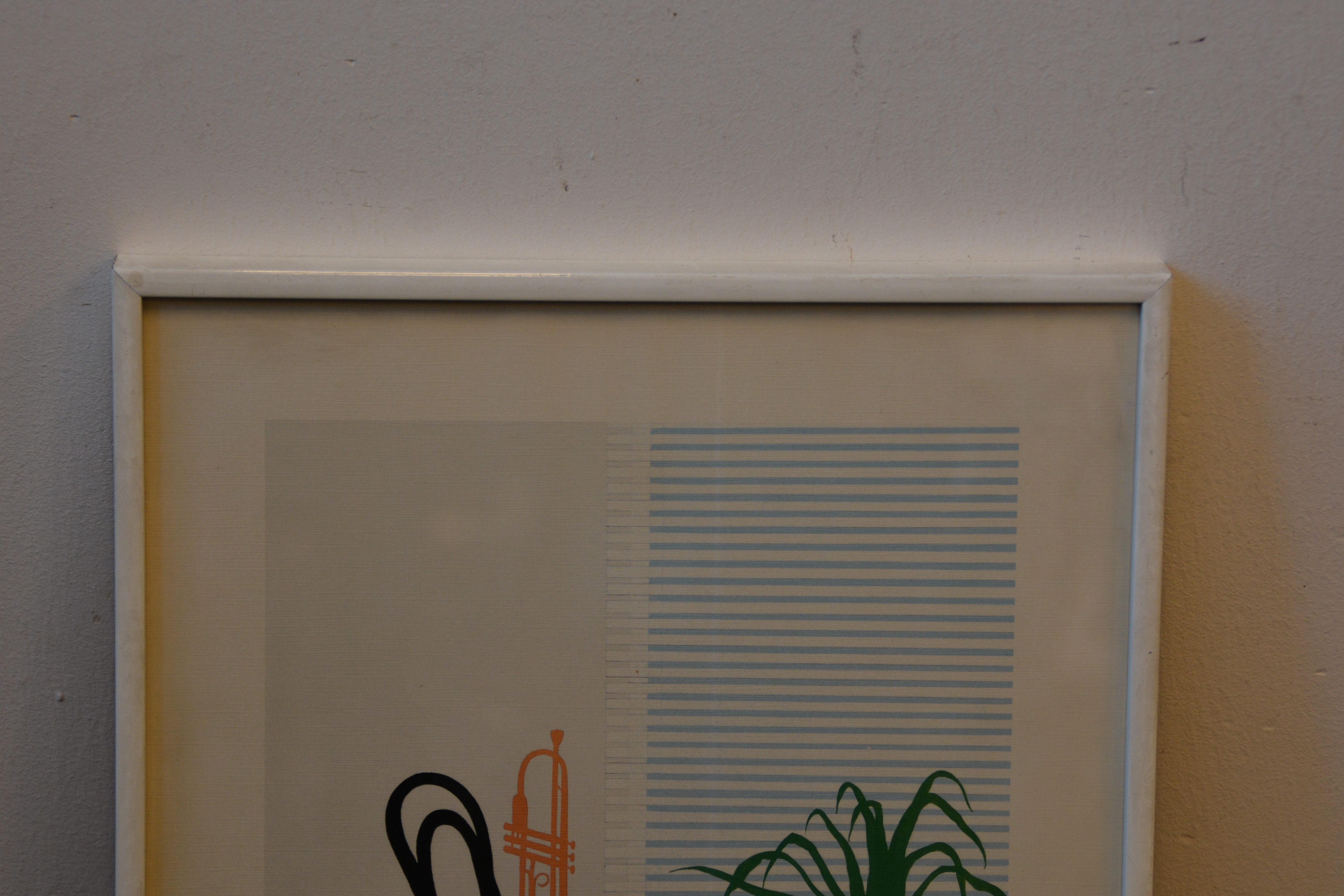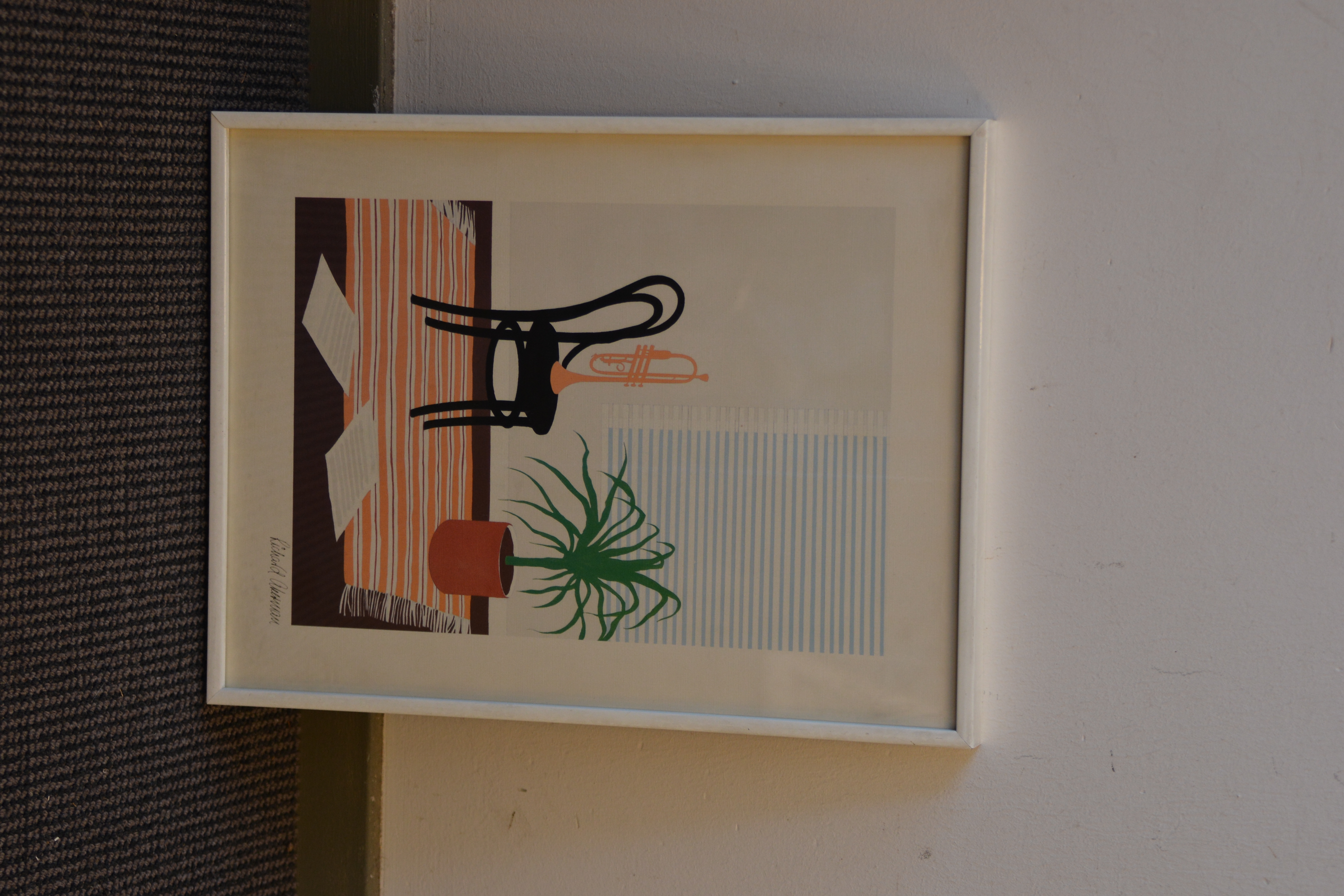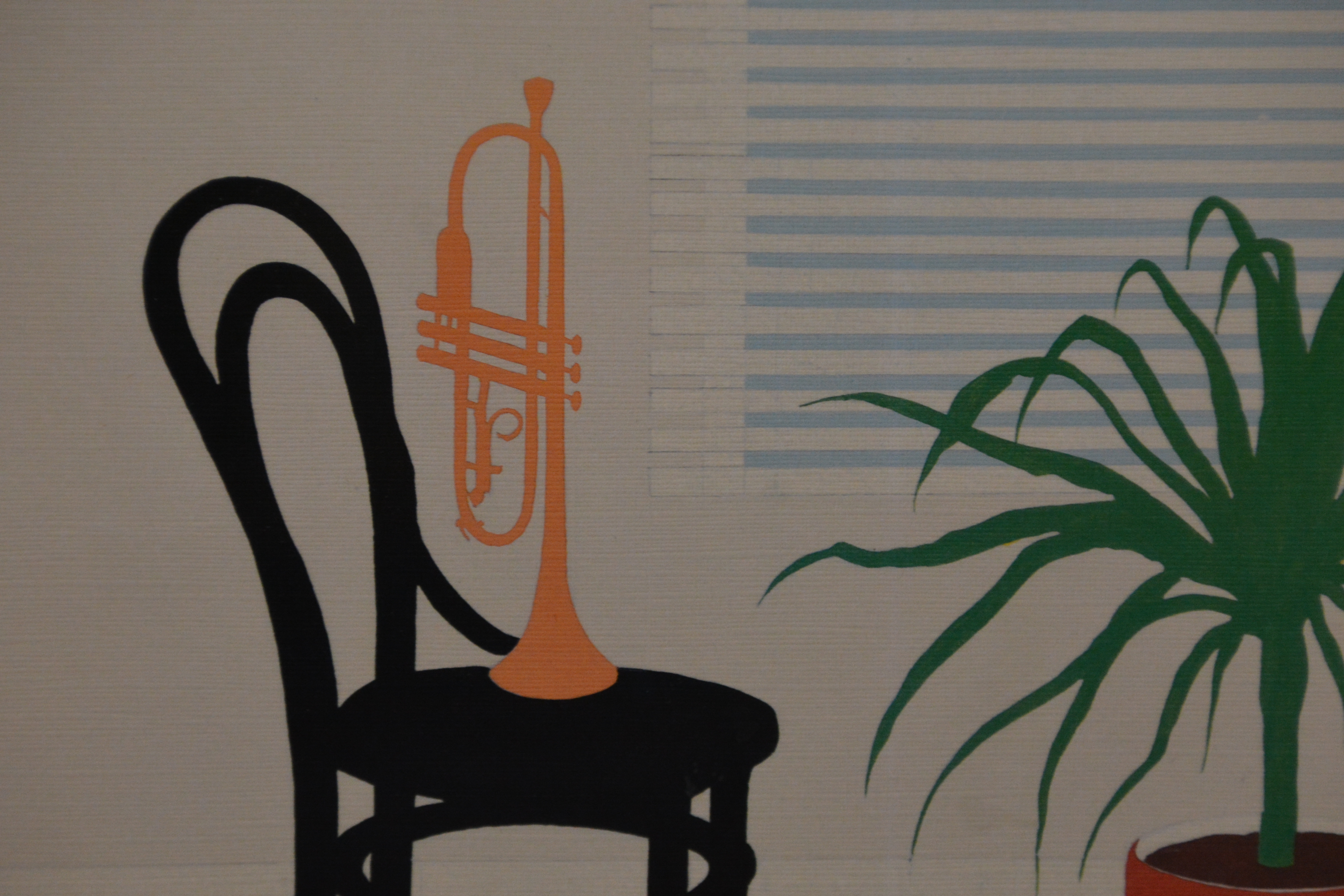 Gekocht bij een kunsthandel.te zien is een kamerinrichting met kleed, stoel, plant en kleed. Op de stoel staat een portret. In goede staat.