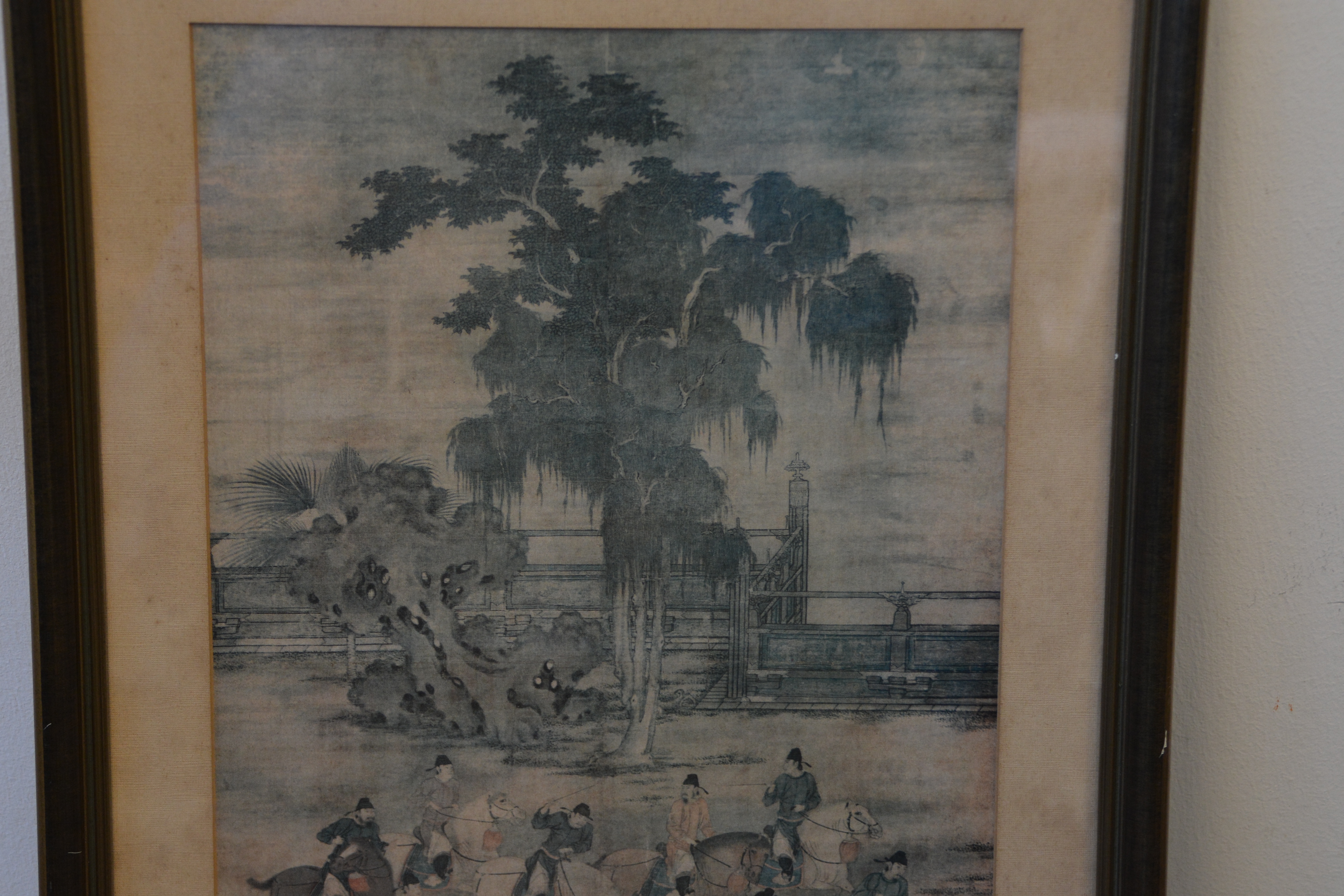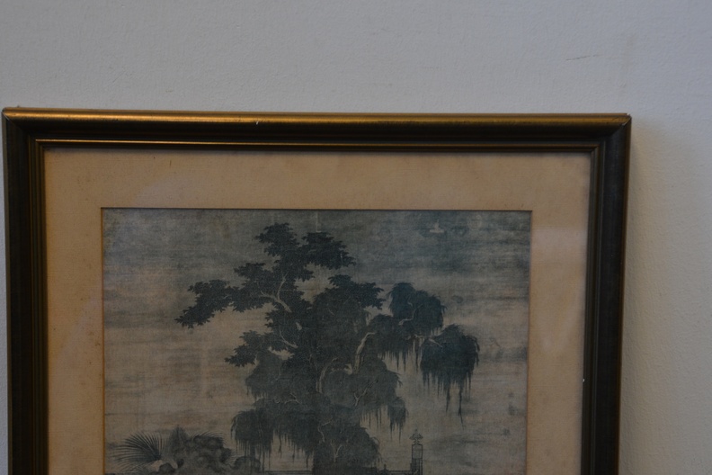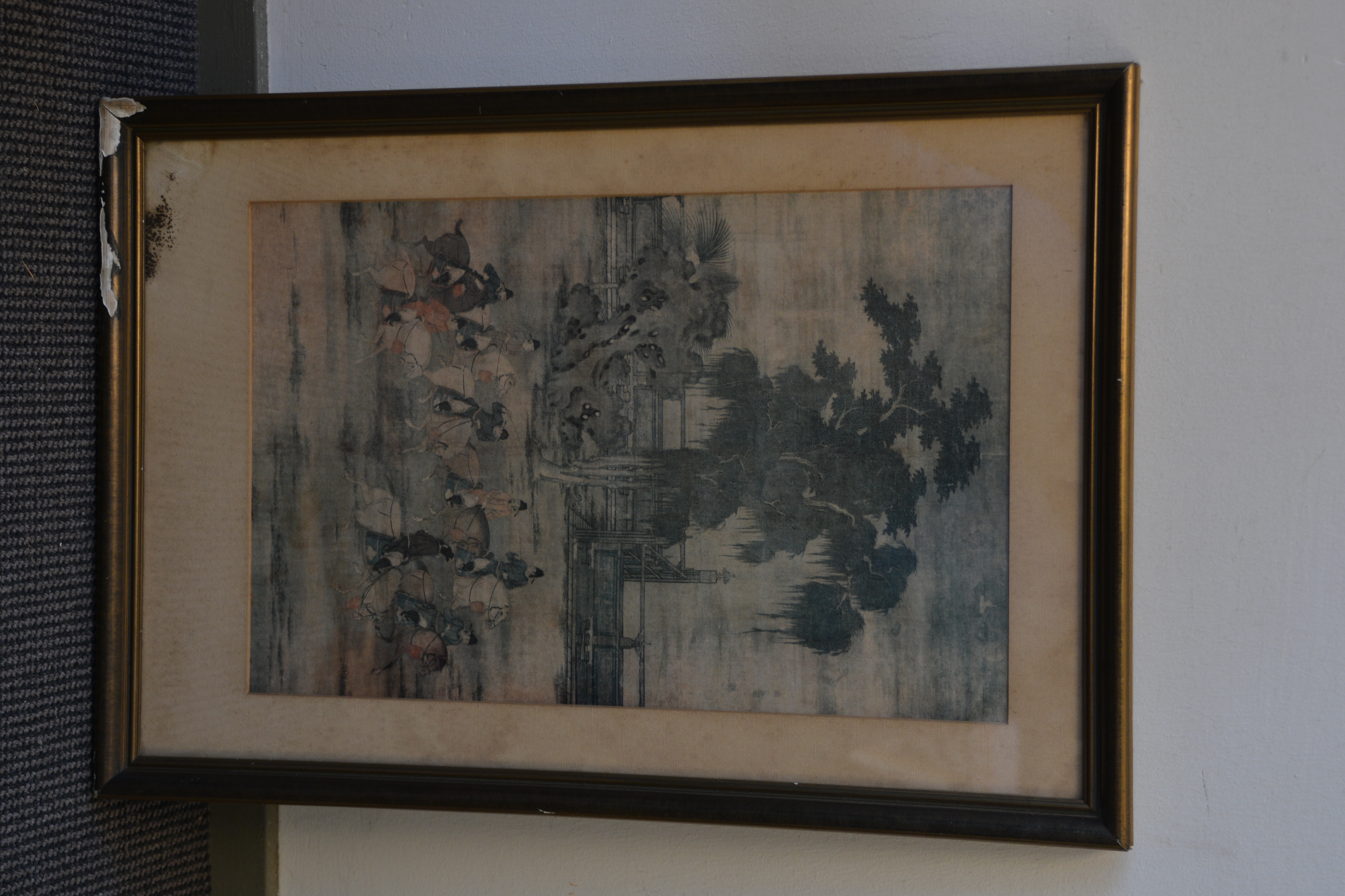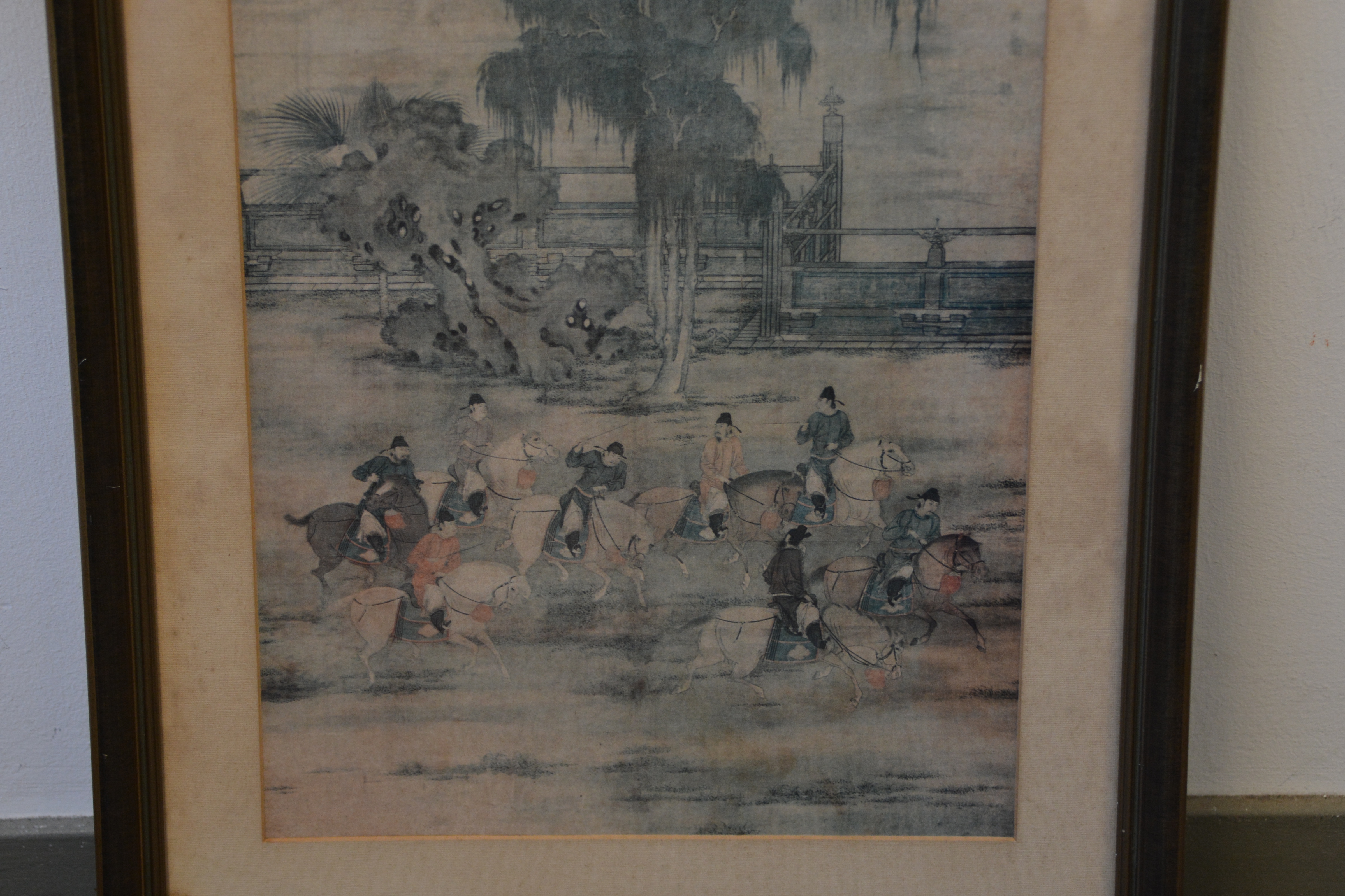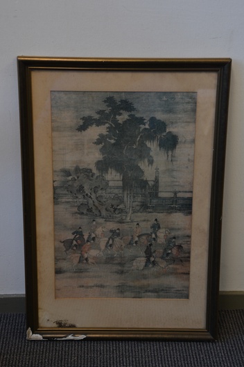 Zeer oude prent van Zhao Yan. Chinese prent van vijf dynastieën. Het is een scėne uit het schilderij' 8 prinsen op lenteexcursie'. De achterkant van de lijst is in de hoek aangetast. De prent zelf is in goede staat.