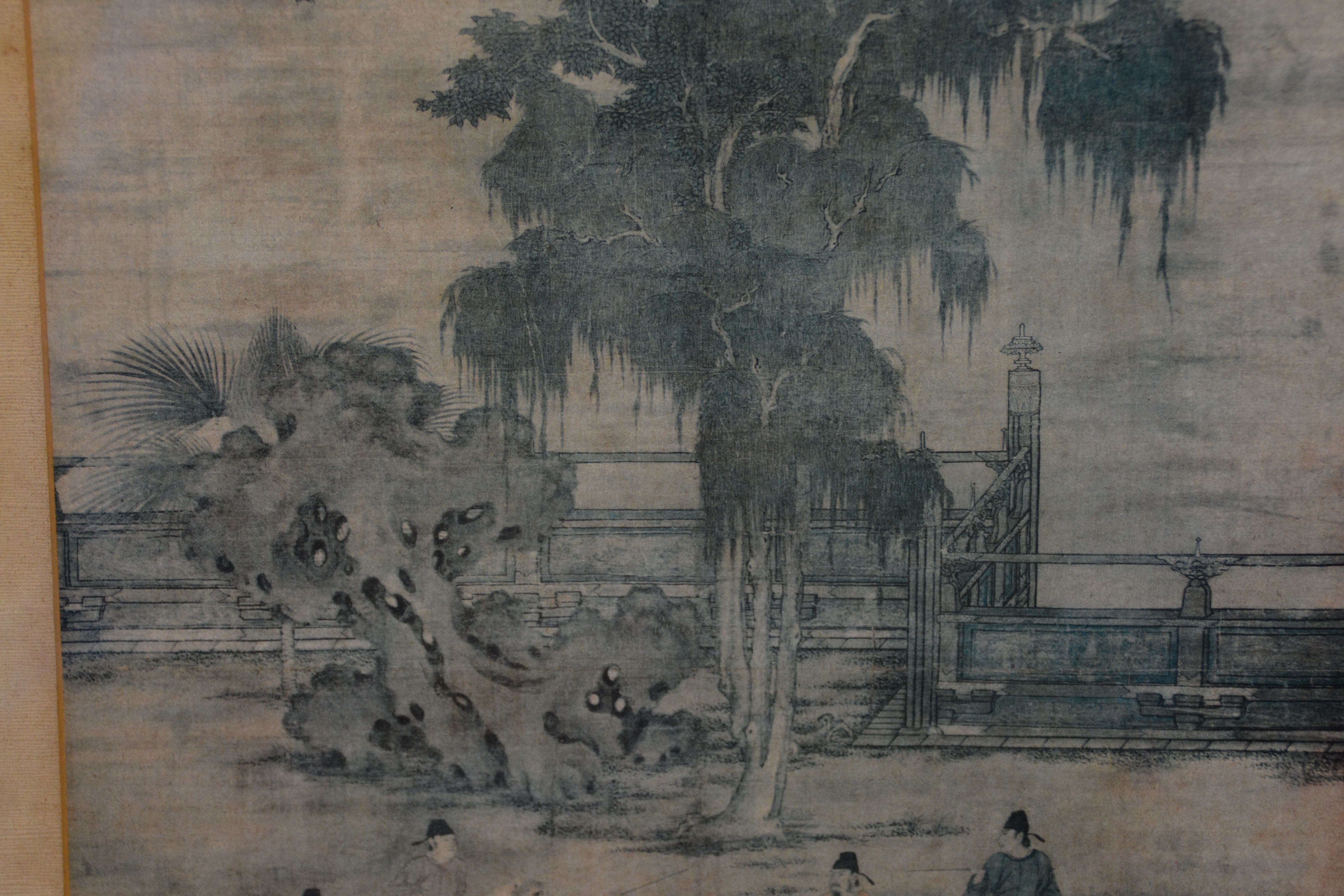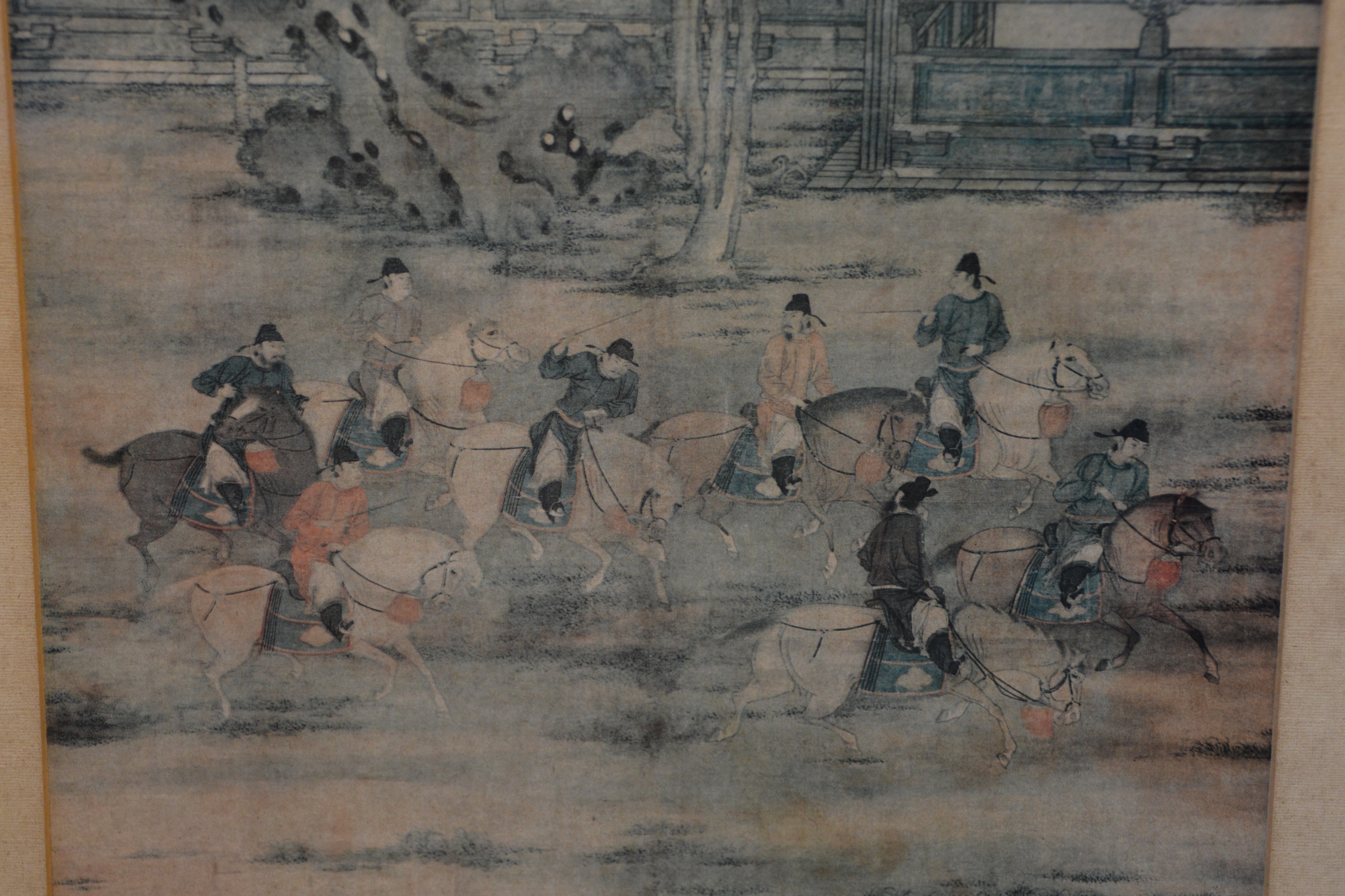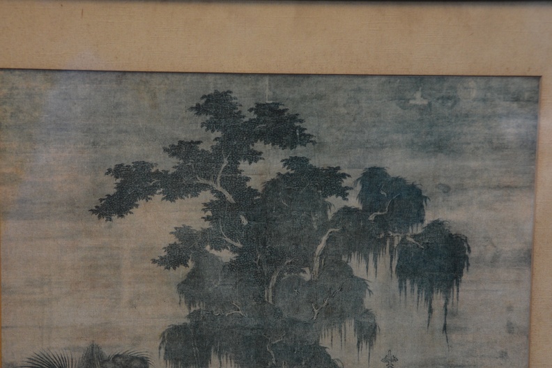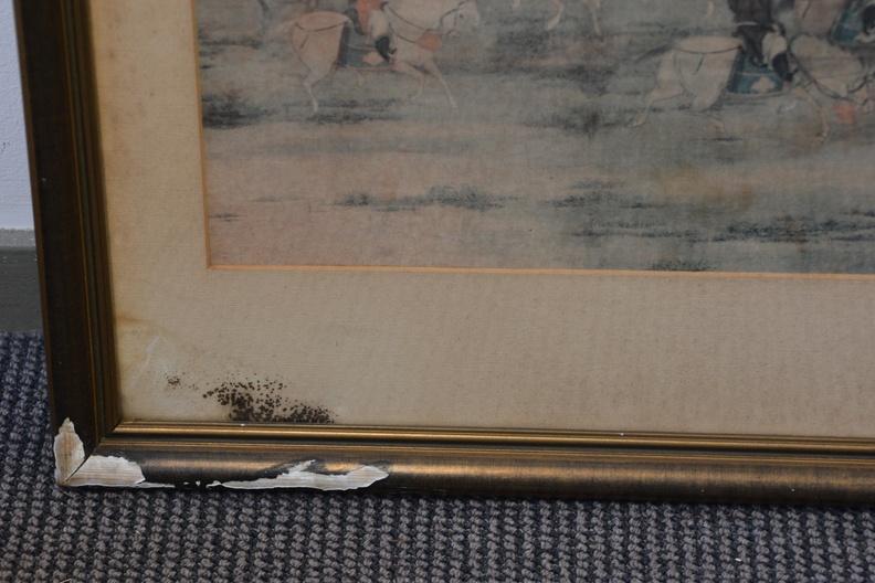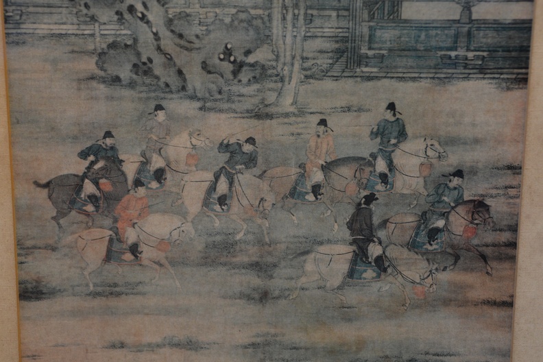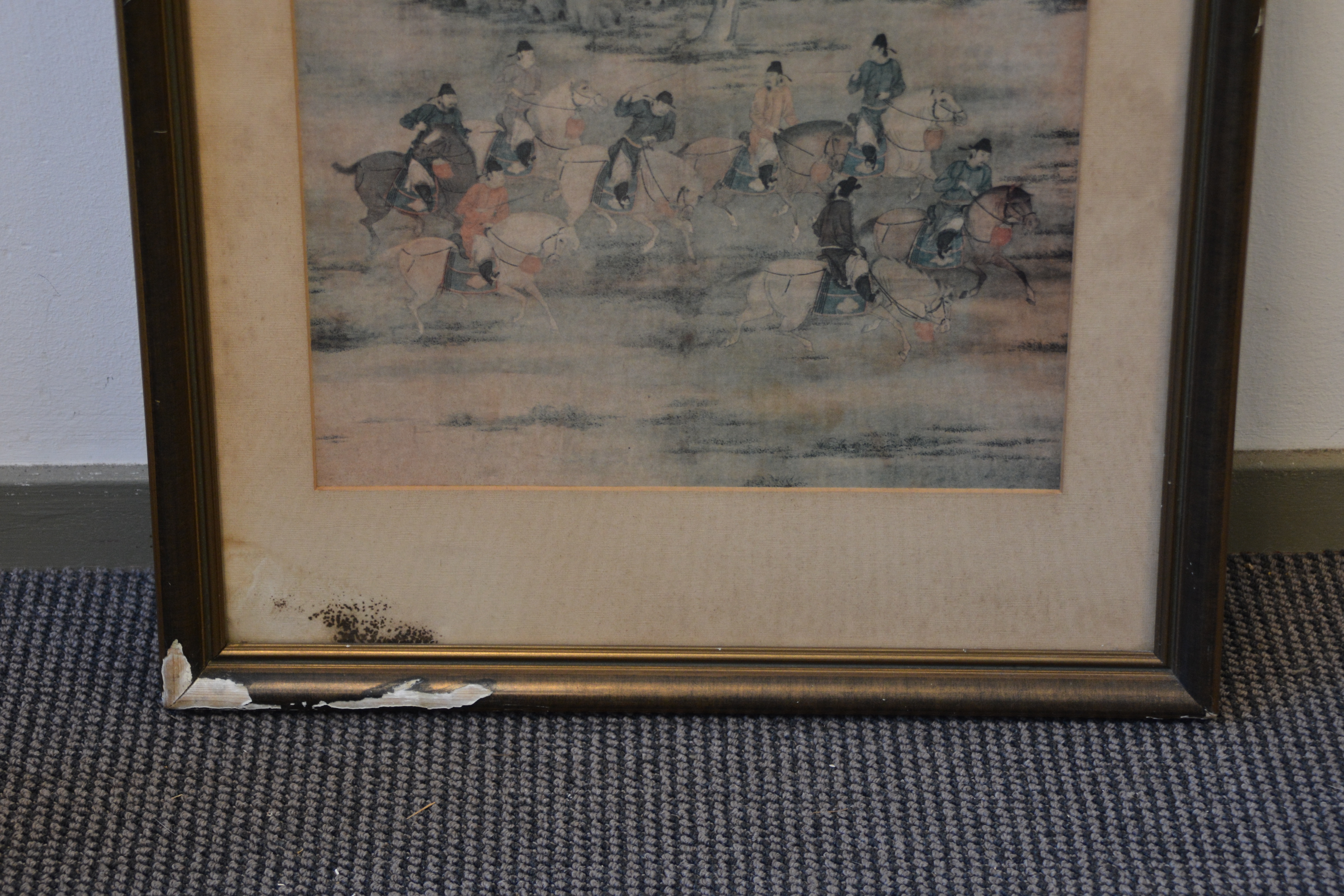 Zeer oude prent van Zhao Yan. Chinese prent van vijf dynastieën. Het is een scėne uit het schilderij' 8 prinsen op lenteexcursie'. De achterkant van de lijst is in de hoek aangetast. De prent zelf is in goede staat.