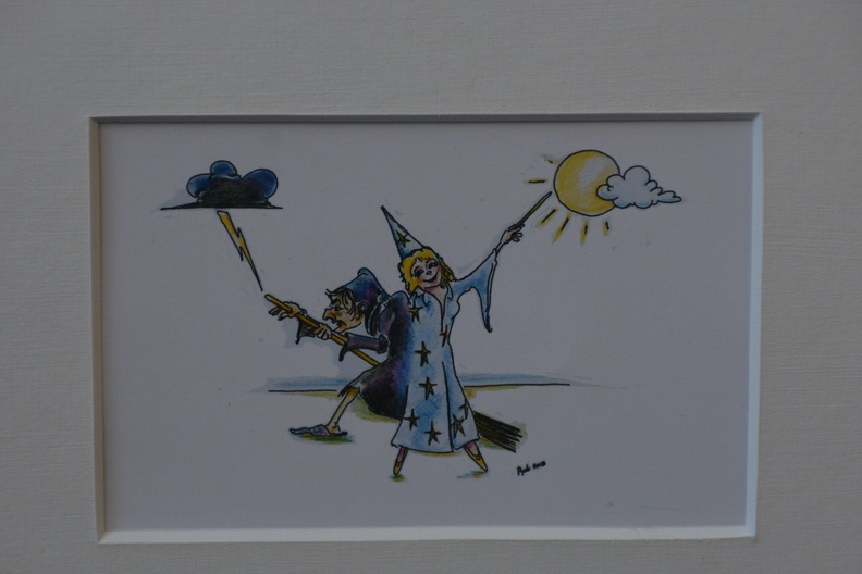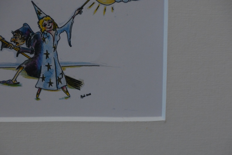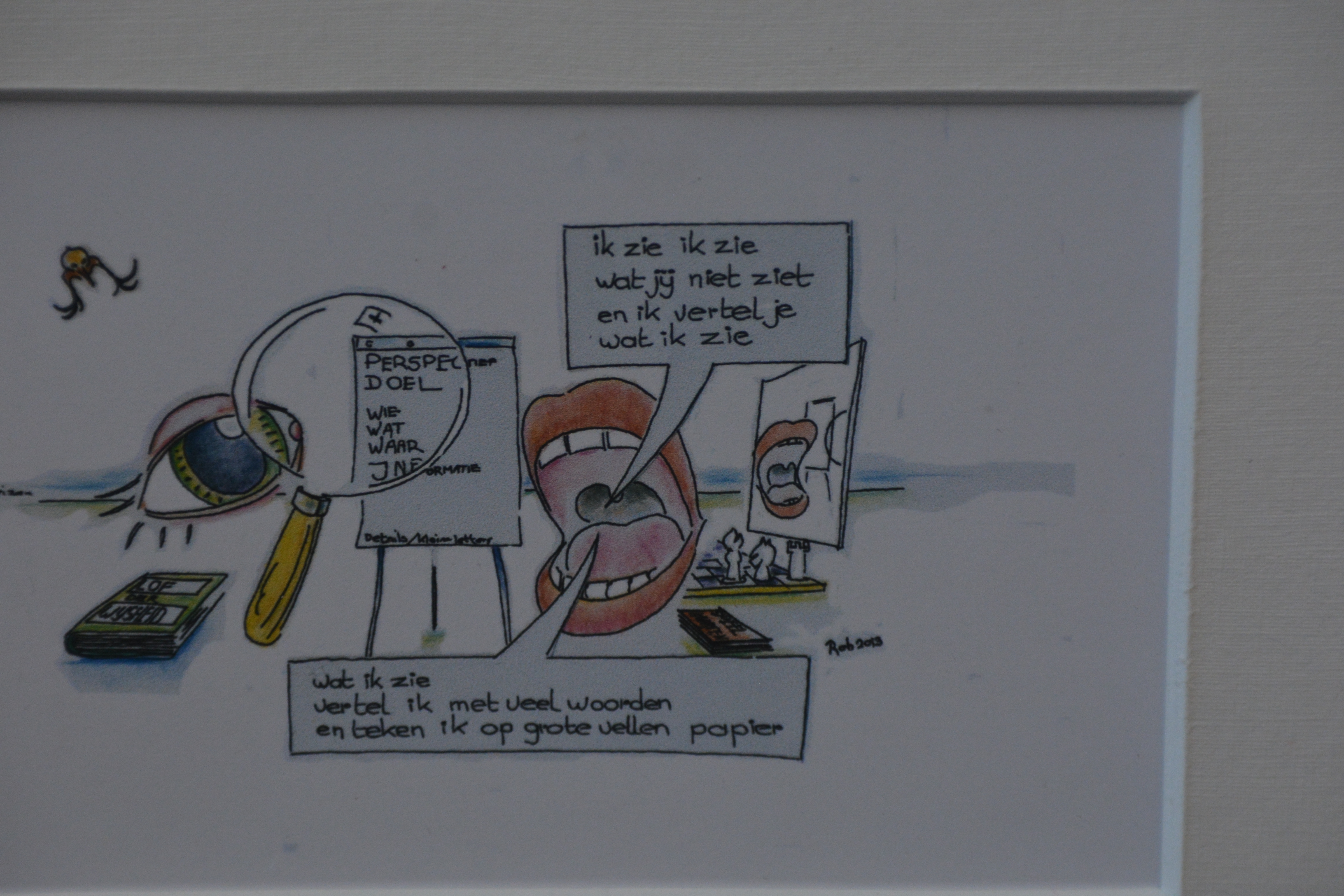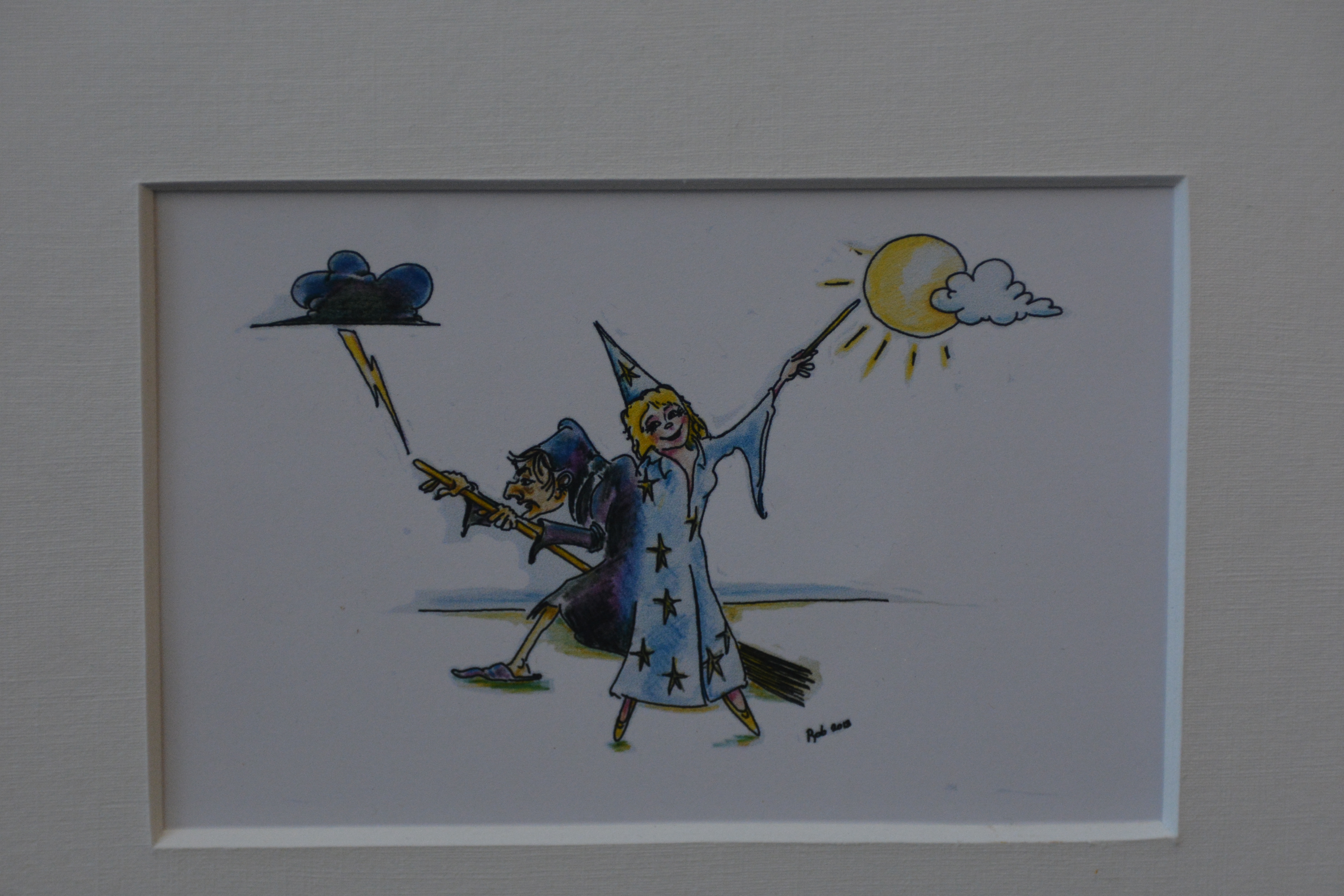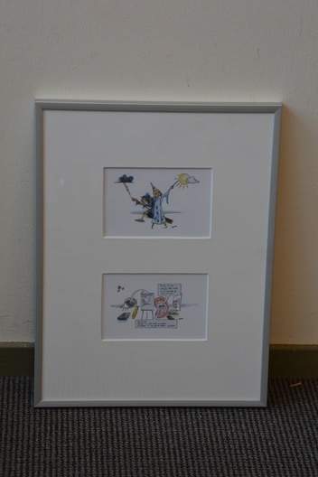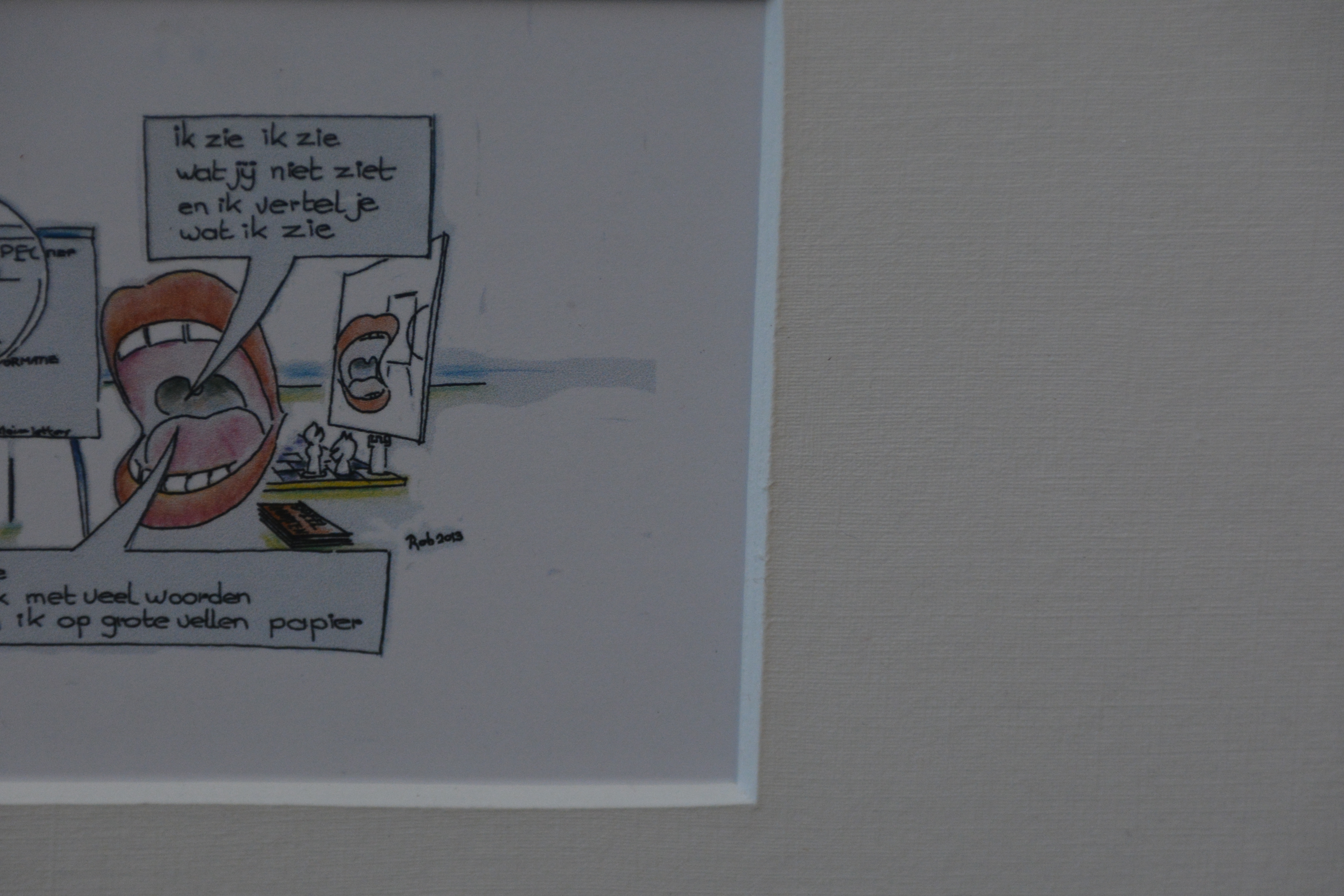 Twee grappige pentekeningen van Rob uit 2013. Ingelijst, met passe-partout en in goede staat
