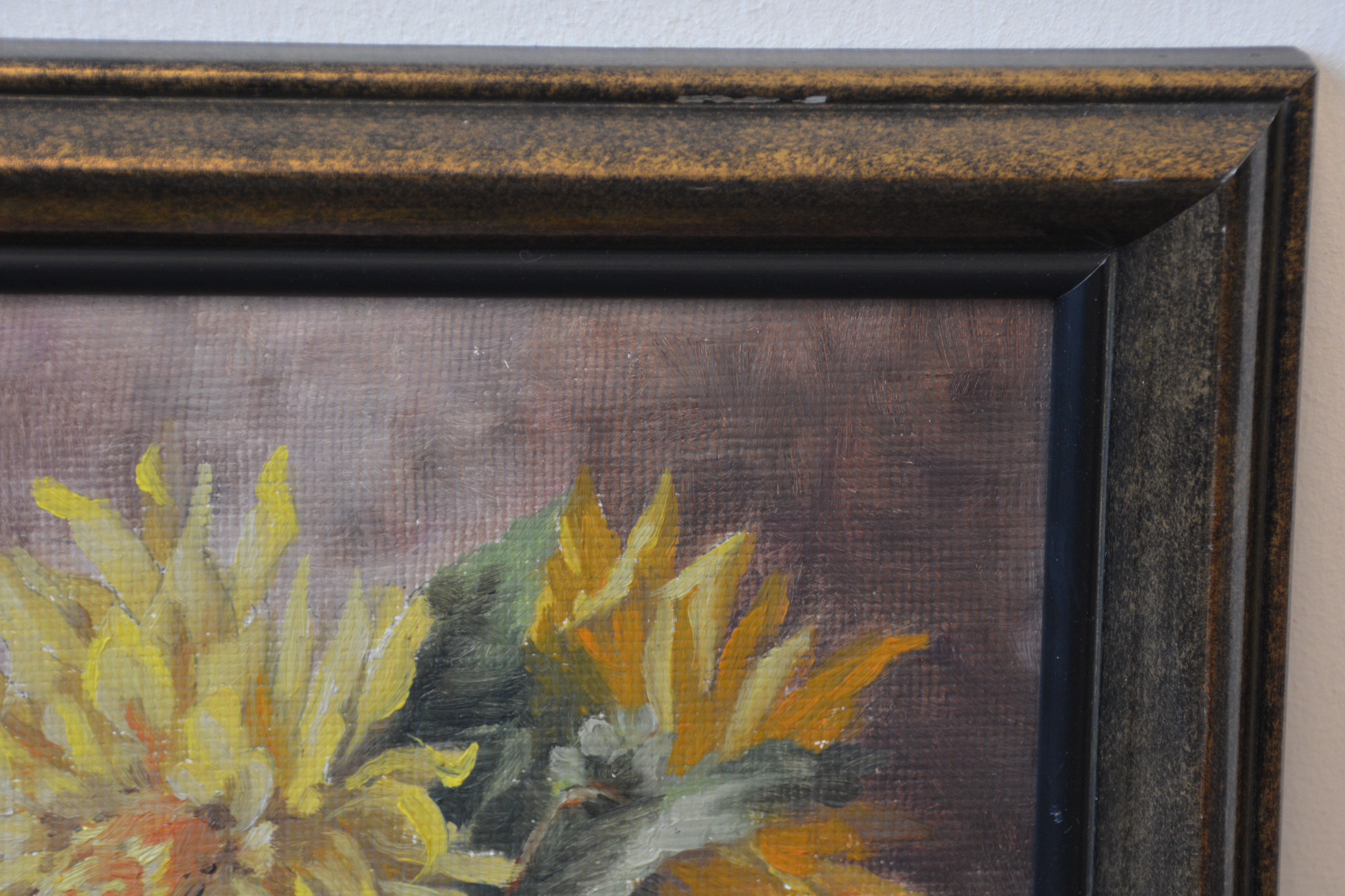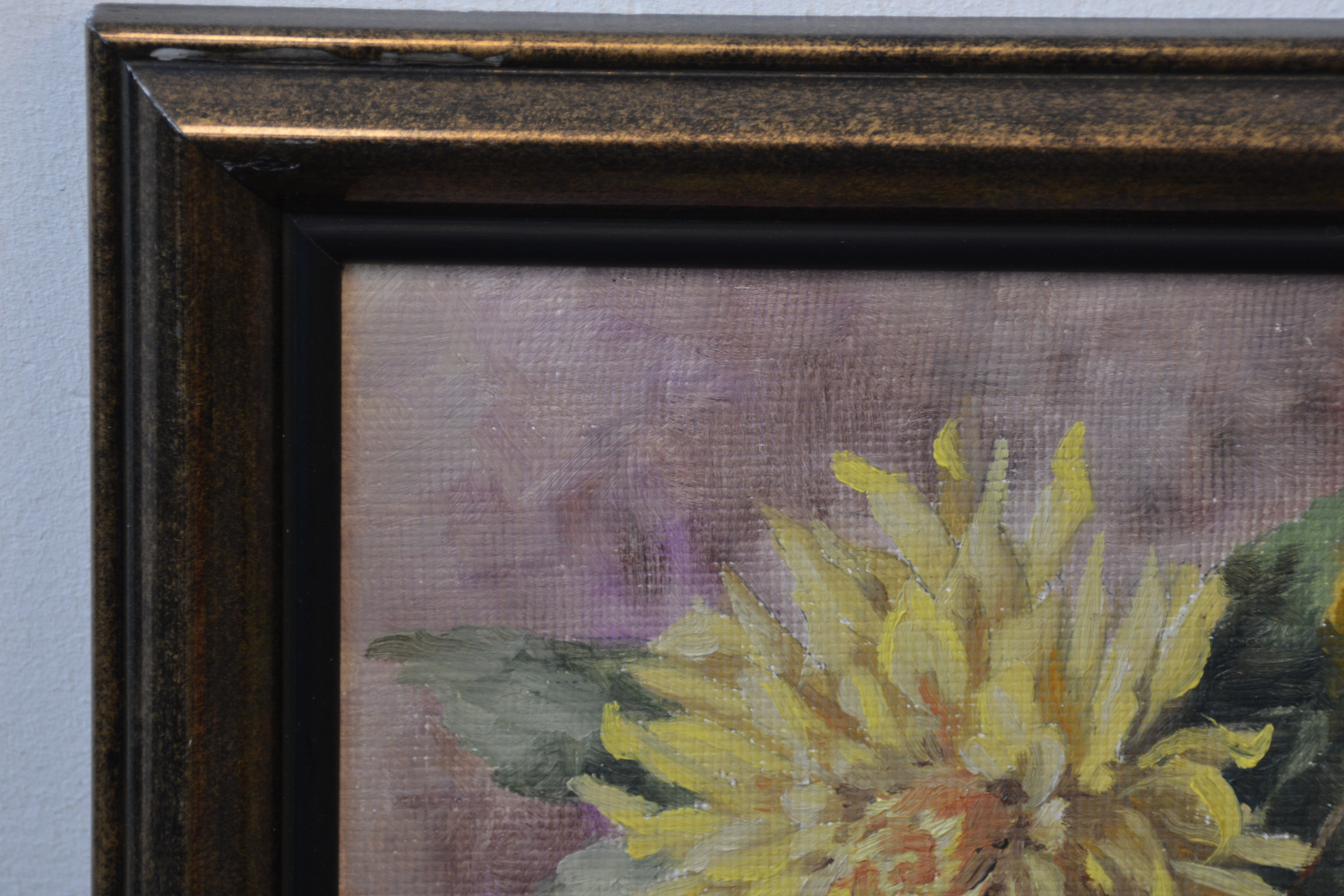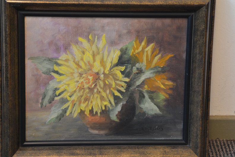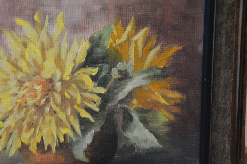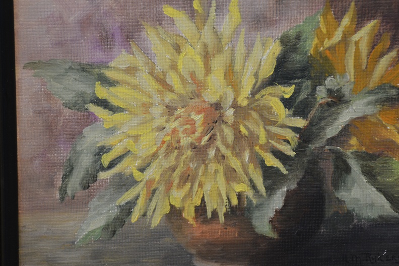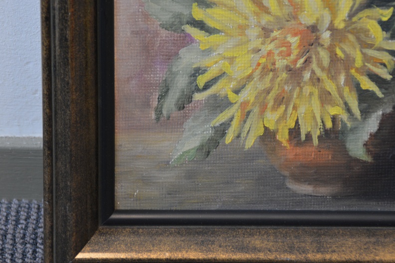 Gele chrysanten  in een vaas. Verf op papier op paneel. Door H.M. Rijkers. In goede staat.