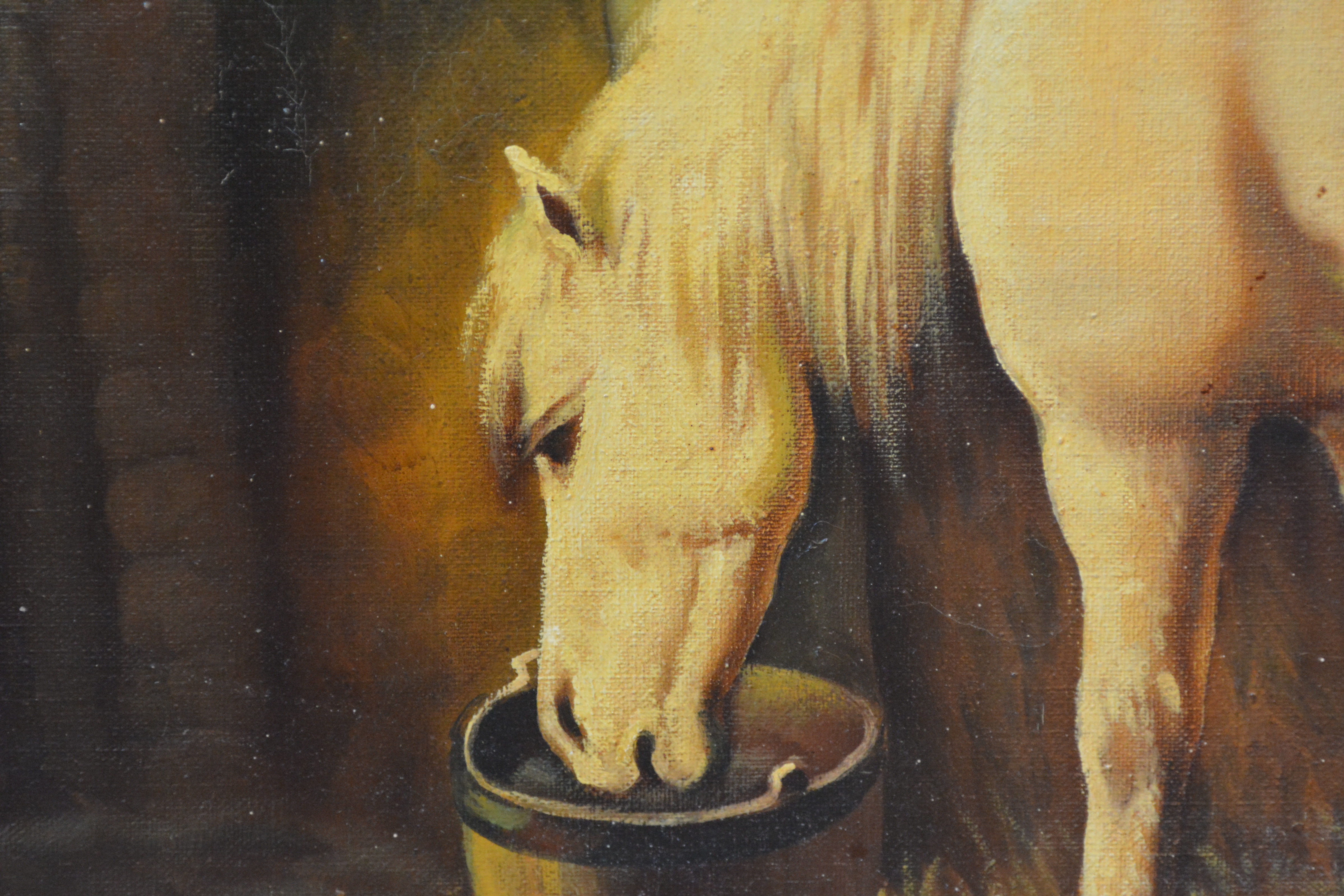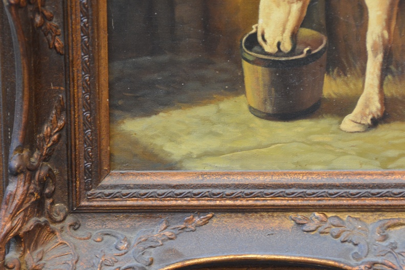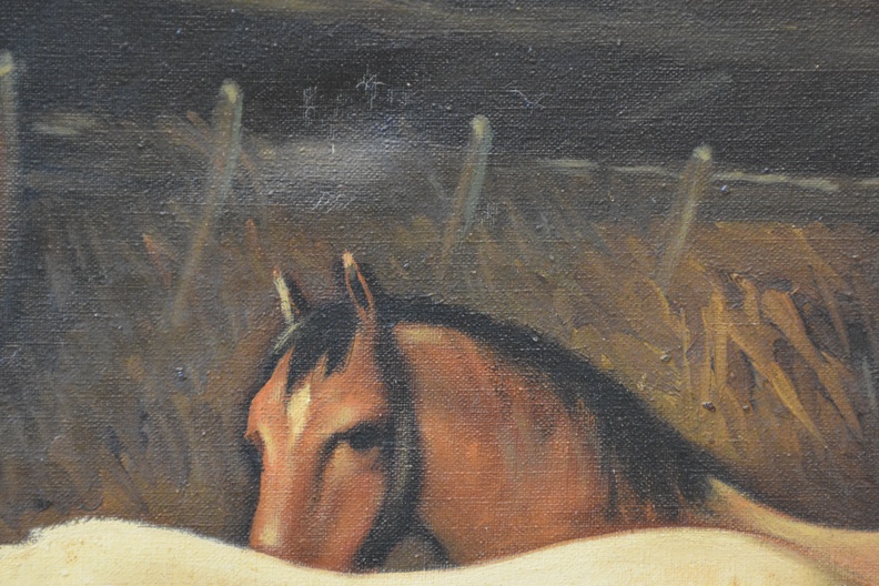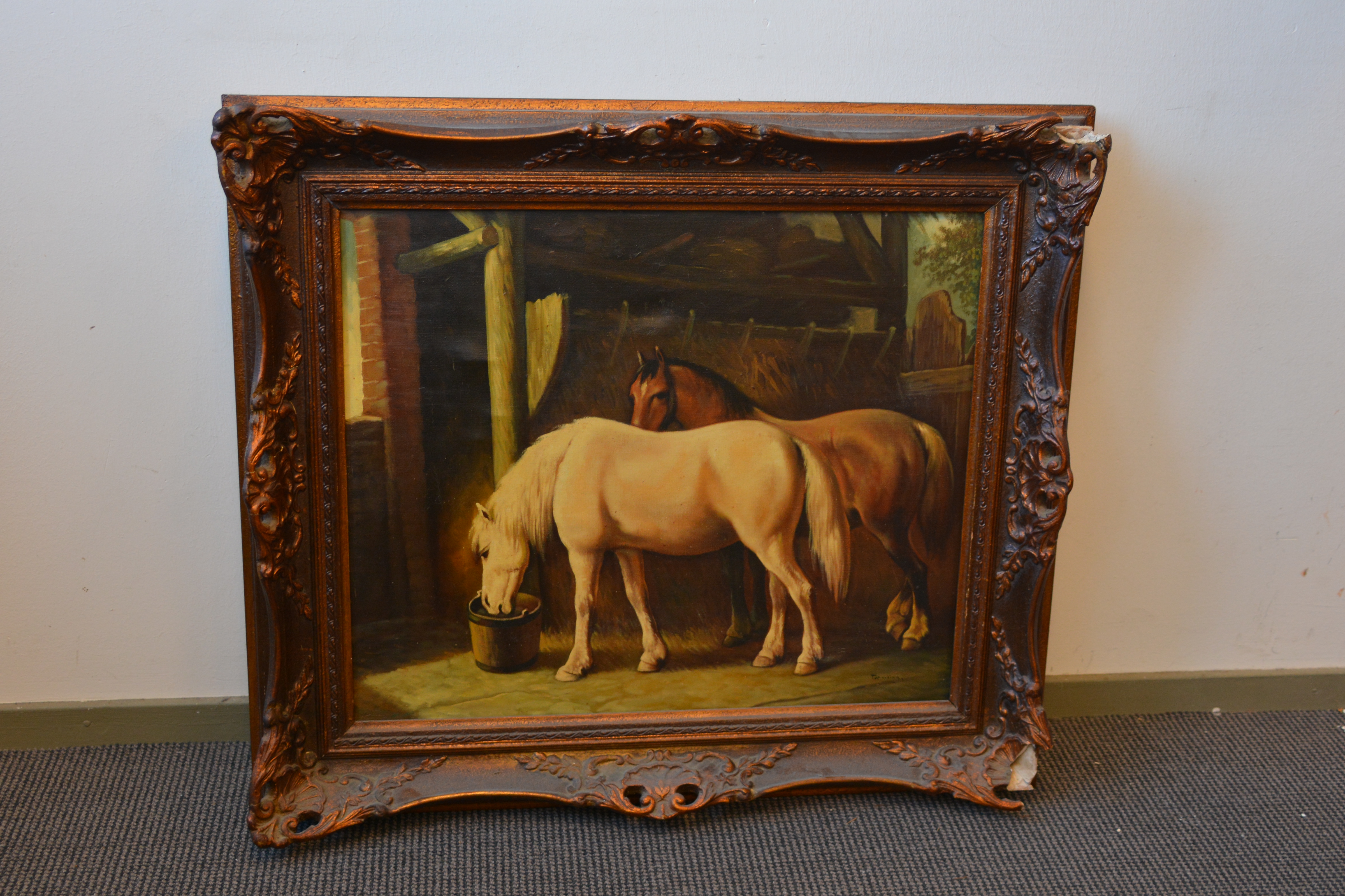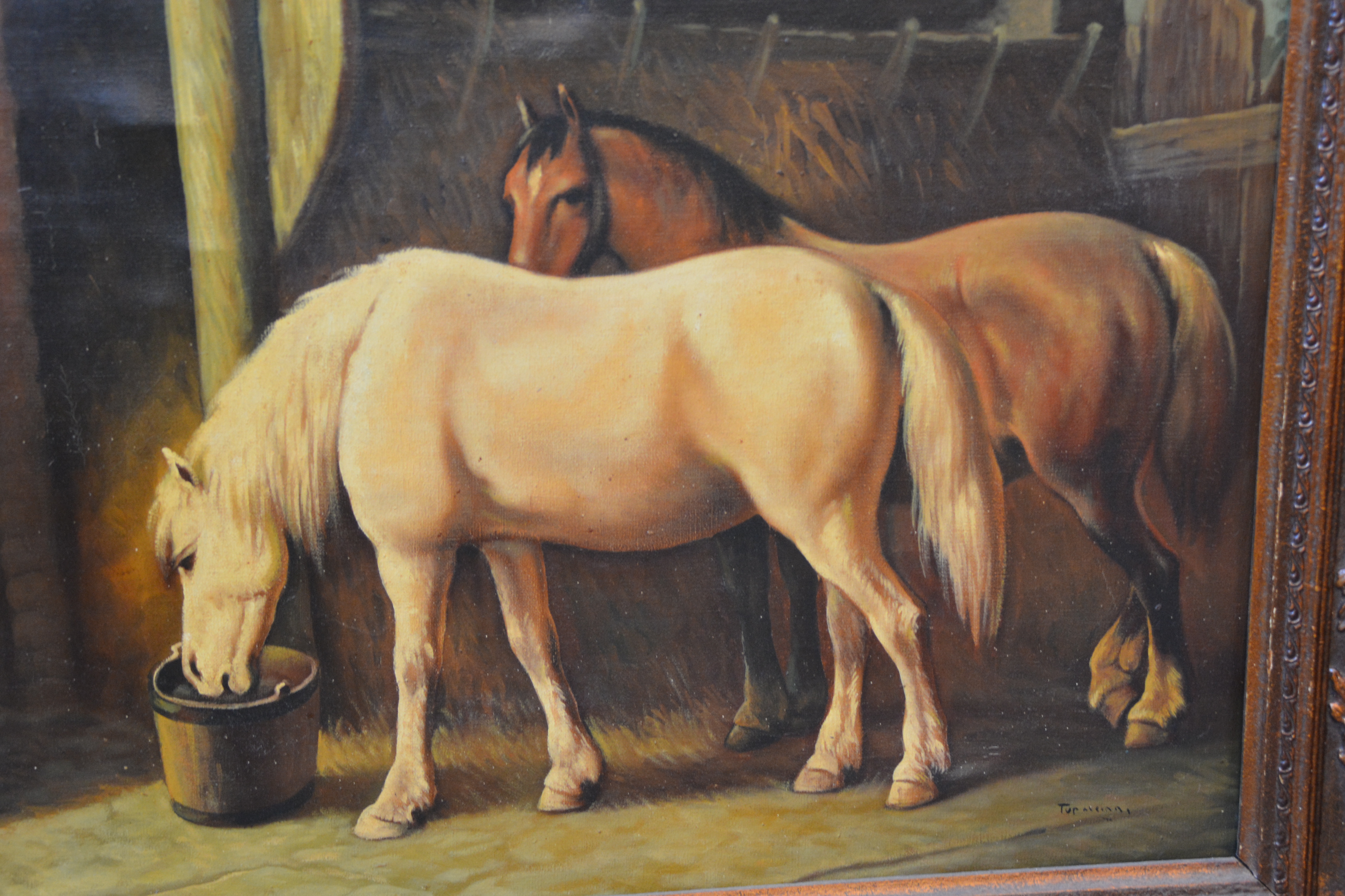 Olieverfschilderij van 2 paarden in de stal.
