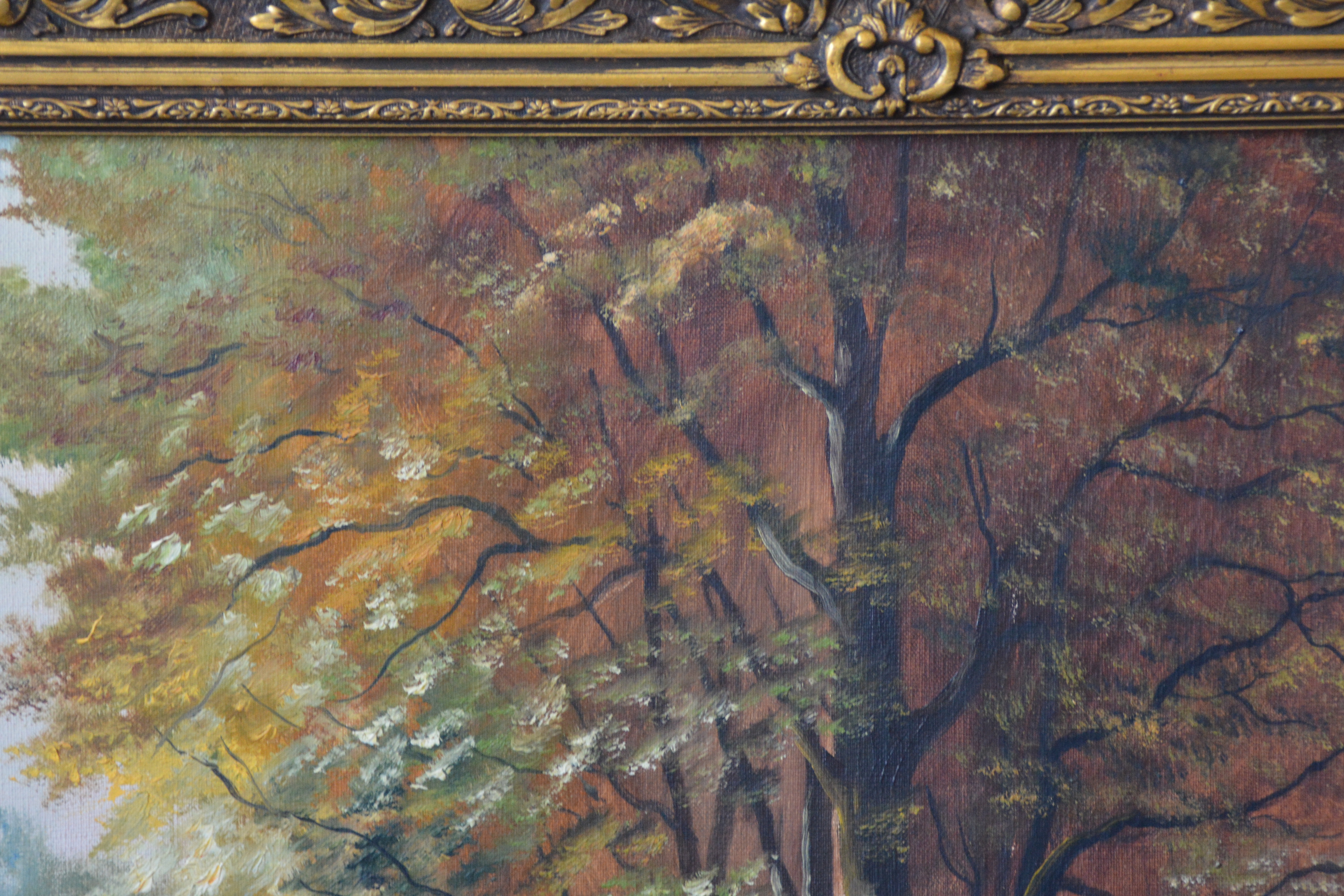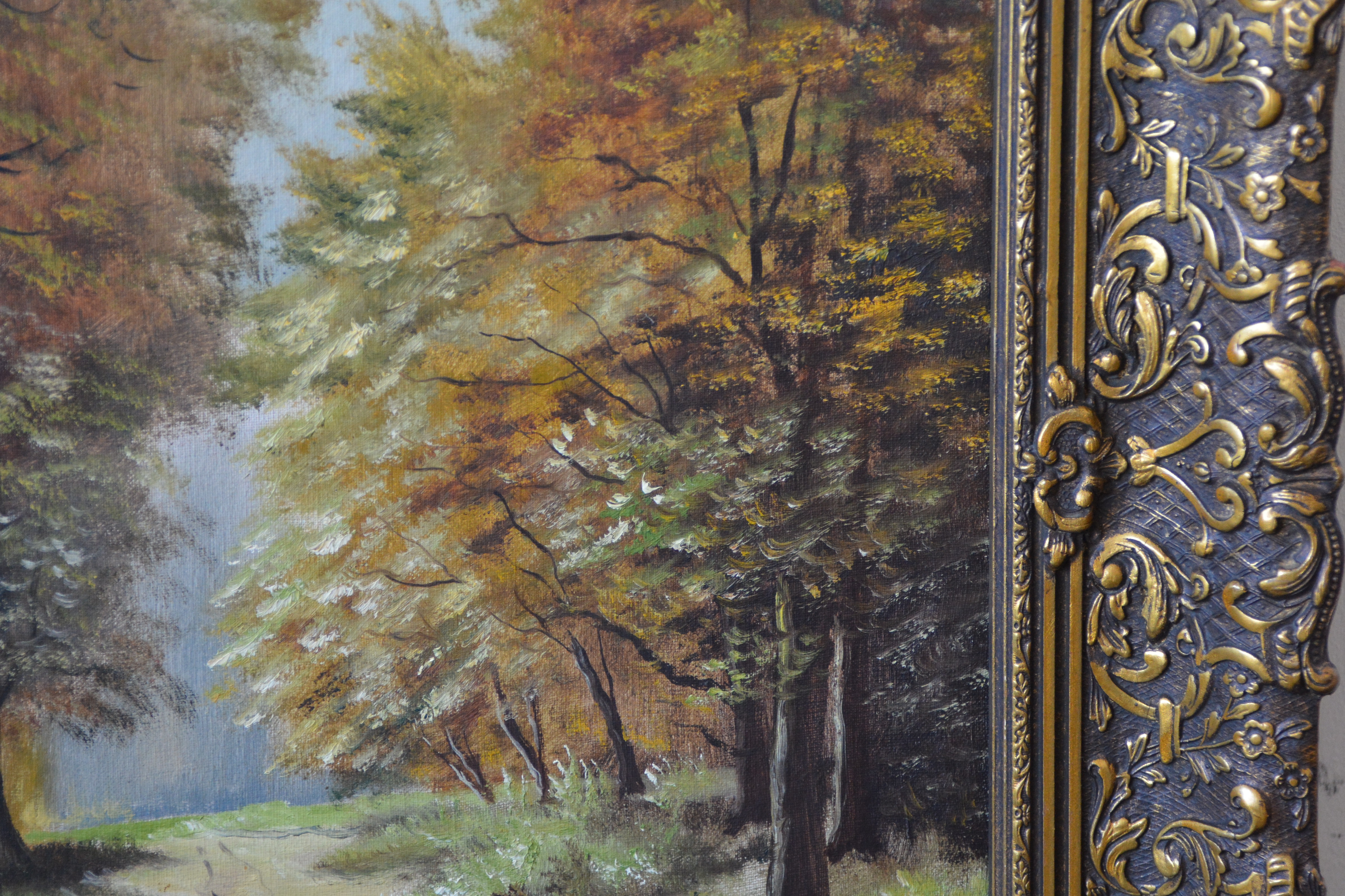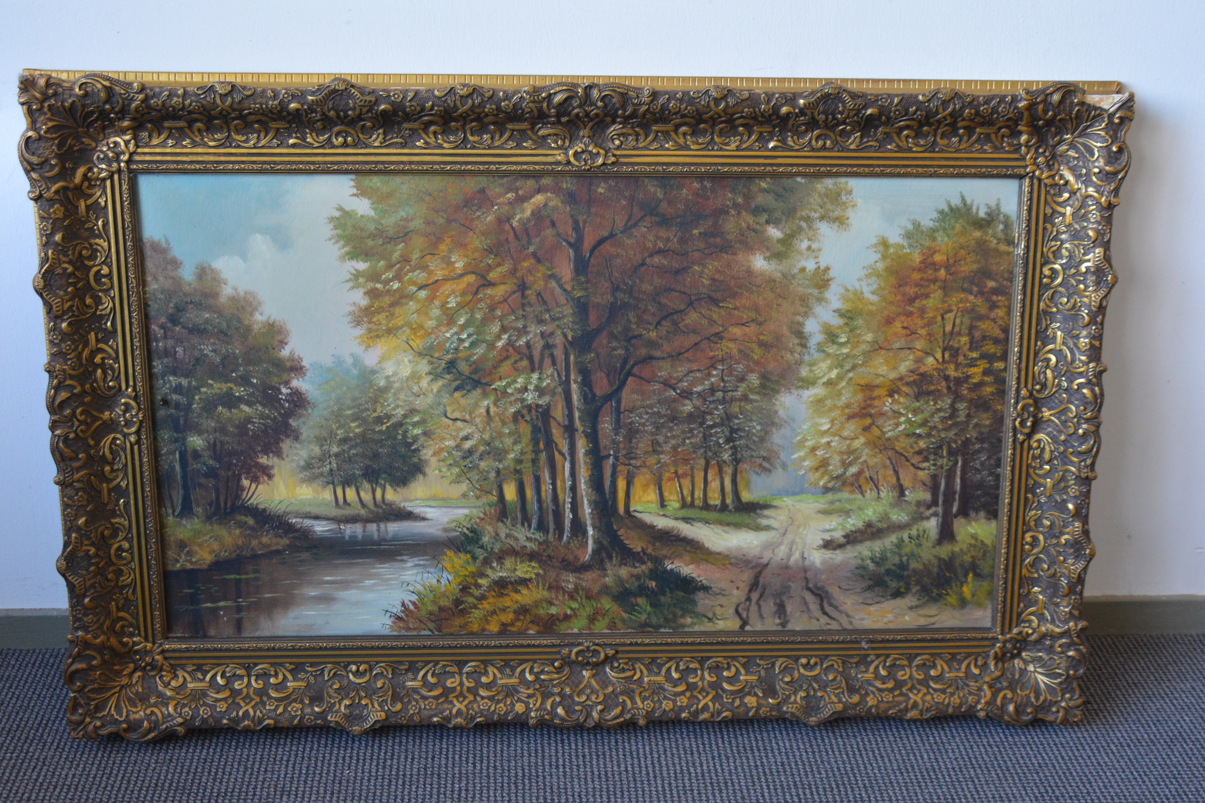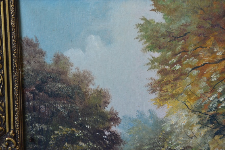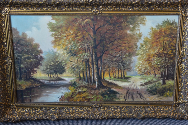 Met rijkelijk bewerkte braaklijst. Herfsttafereel met een pad dat door een bos voert, grenzend aan een waterpartij. Het werk is niet zichtbaar gesigneerd. Olieverf op doek. Kleine beschadiging rechter onderste hoek.