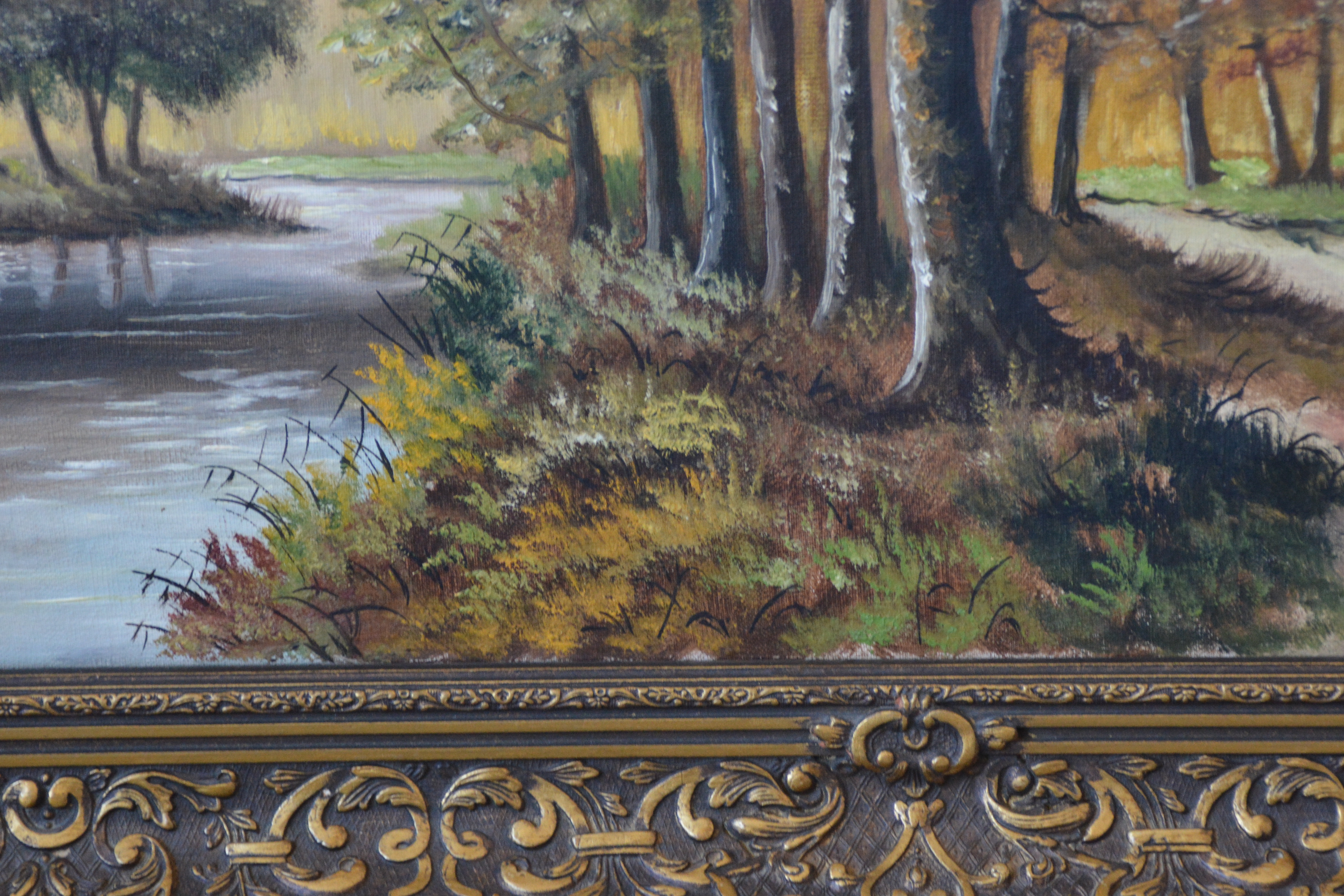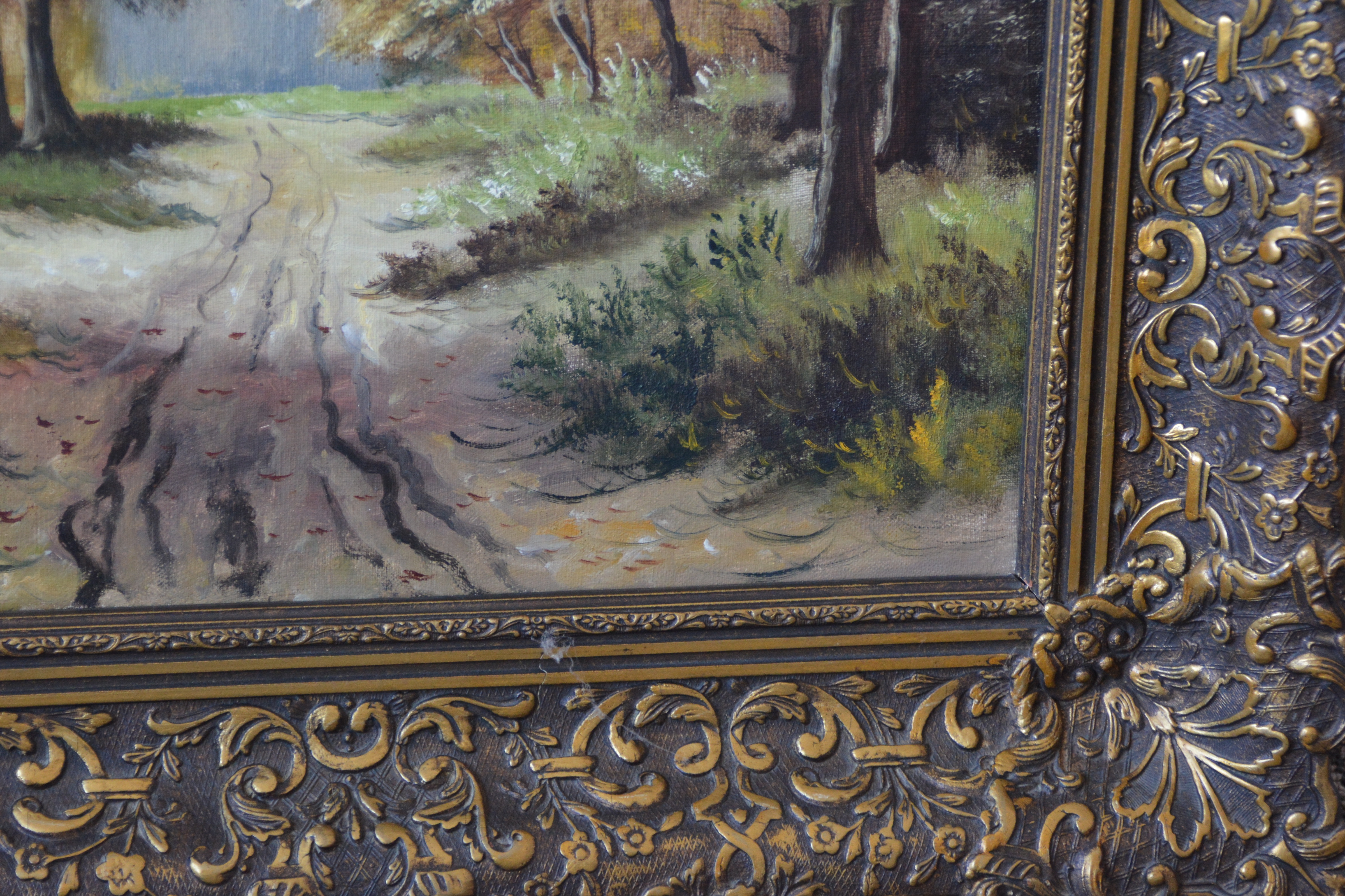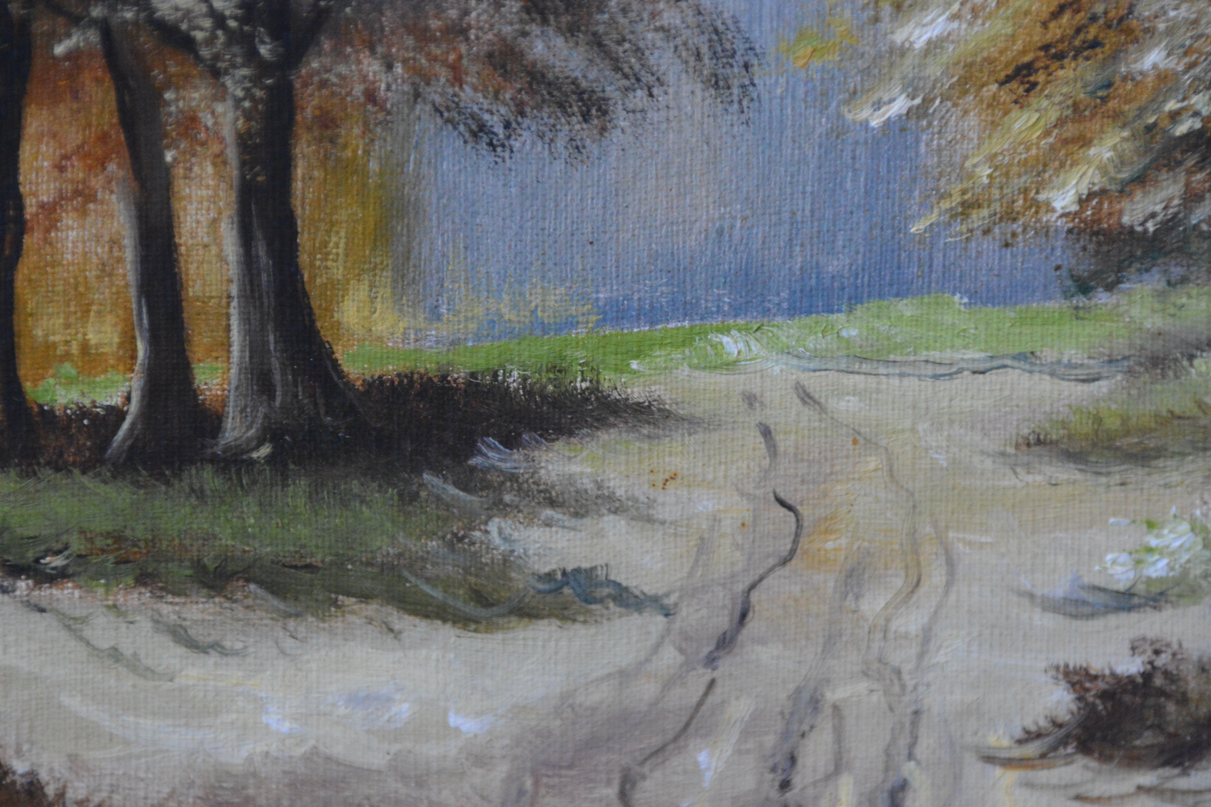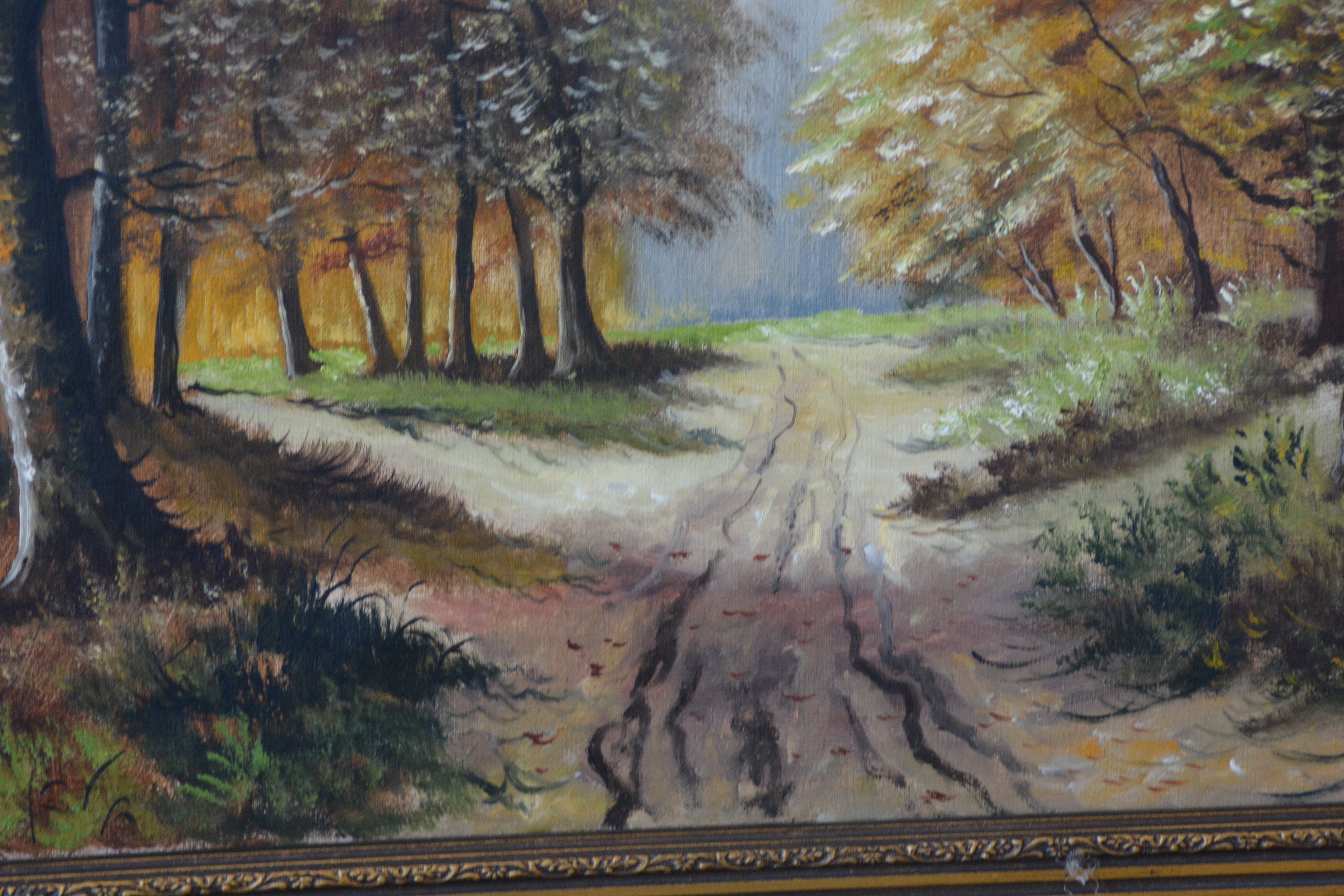 Met rijkelijk bewerkte braaklijst. Herfsttafereel met een pad dat door een bos voert, grenzend aan een waterpartij. Het werk is niet zichtbaar gesigneerd. Olieverf op doek. Kleine beschadiging rechter onderste hoek.