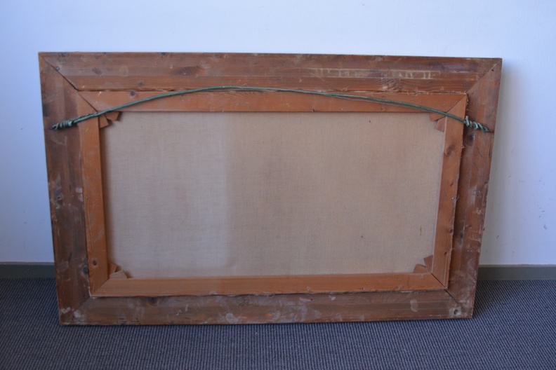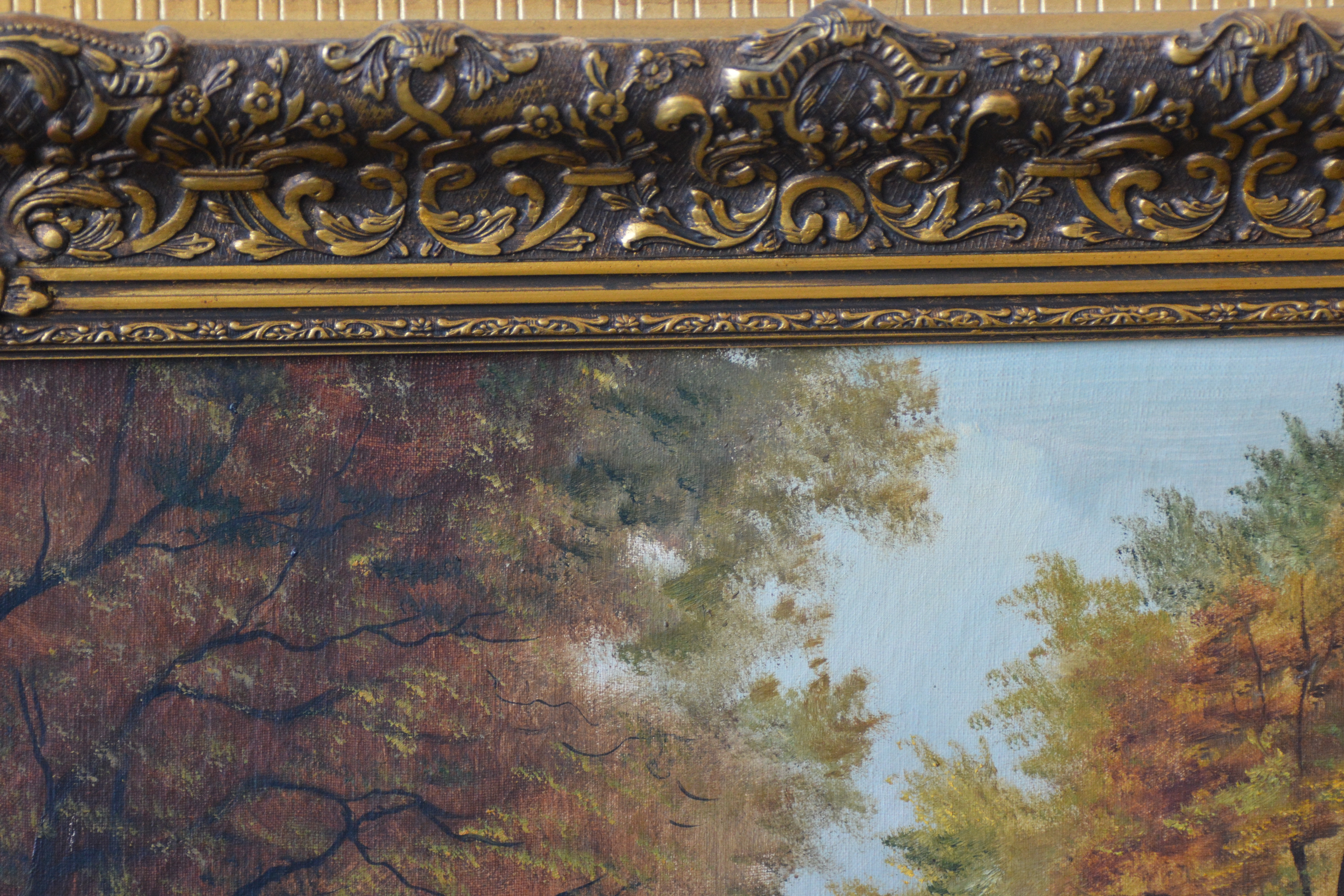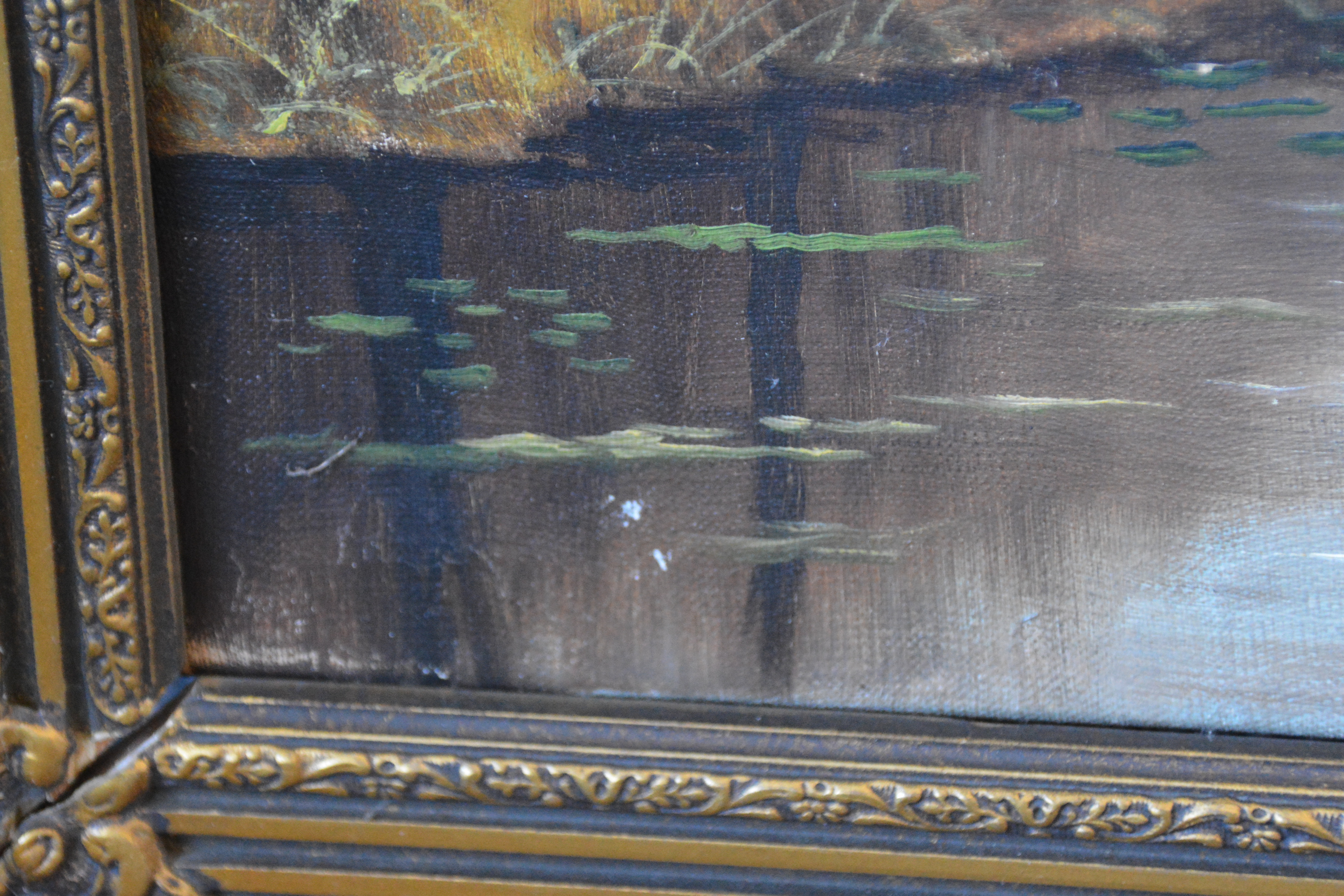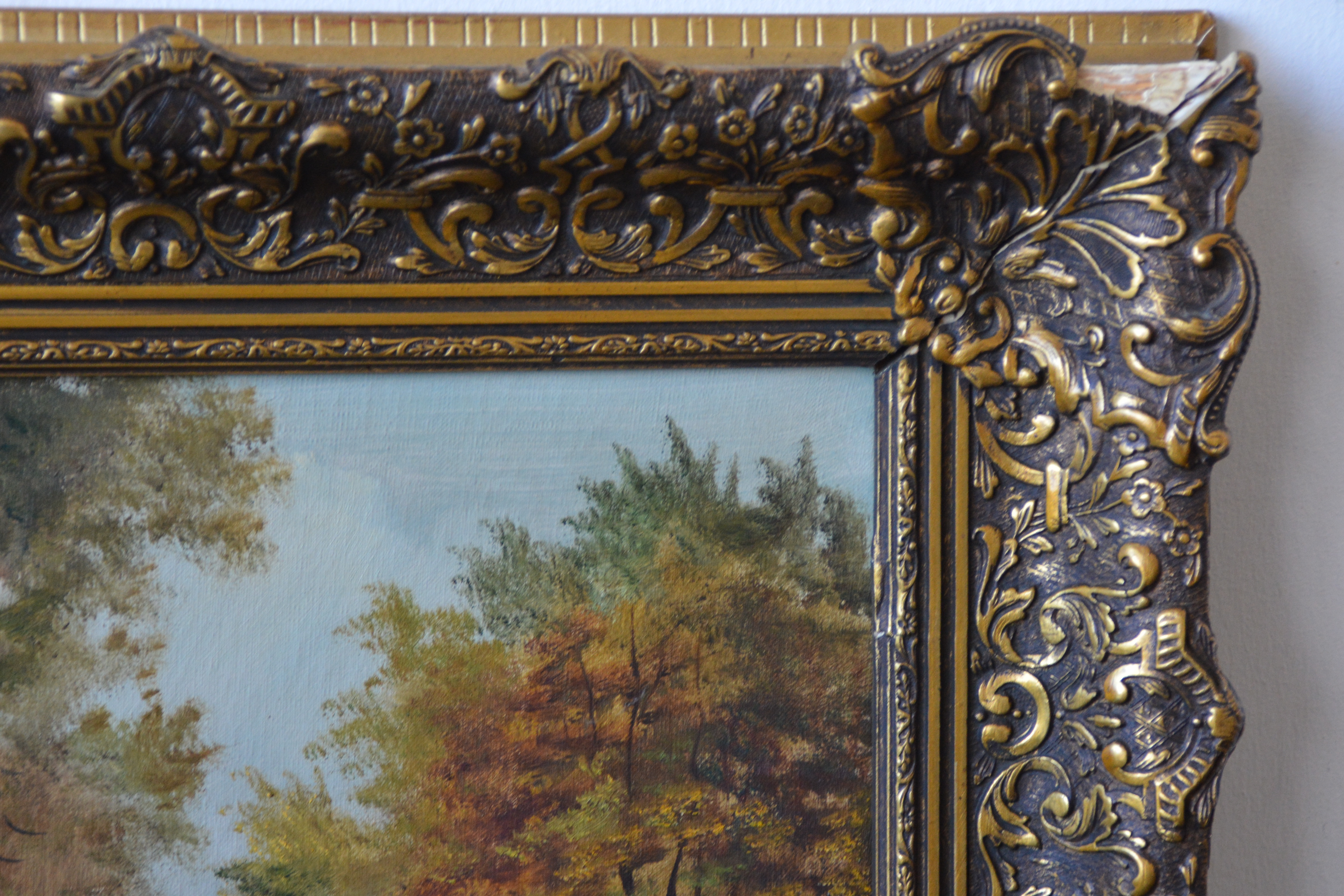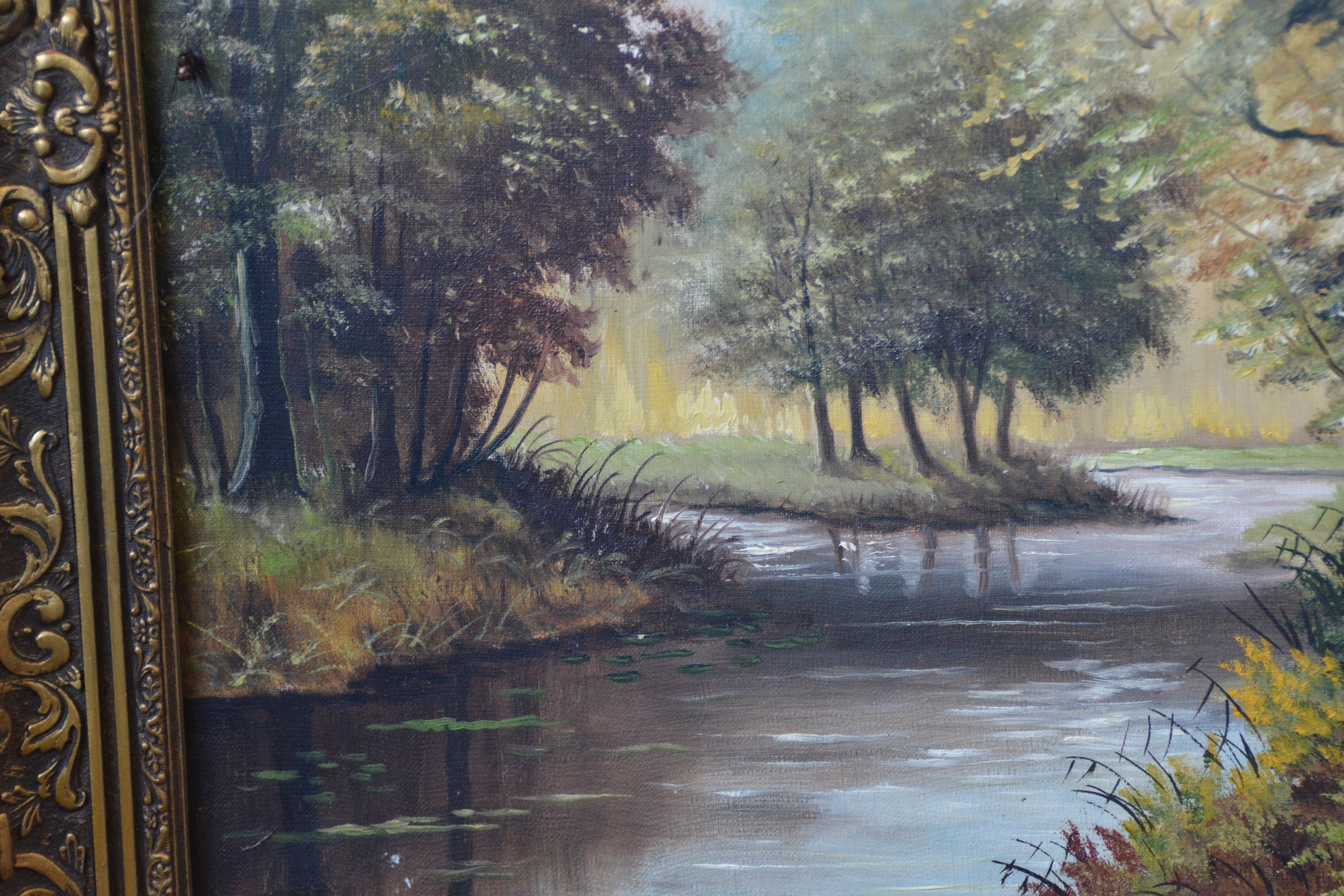 Met rijkelijk bewerkte braaklijst. Herfsttafereel met een pad dat door een bos voert, grenzend aan een waterpartij. Het werk is niet zichtbaar gesigneerd. Olieverf op doek. Kleine beschadiging rechter onderste hoek.