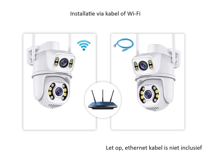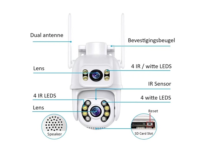De camera heeft twee separate camera's van allebei 3MP. Zo heb je met 1 camera het beeld van twee stuks en zie je in een oogopslag alles. De camera heeft 1 vaste lens en 1 lens die 270 graden horizontaal en 90 graden verticaal kan draaien (Pan Tilt Zoom) en alle beelden zijn te bekijken via de gratis app, die je op telefoon, laptop, pc of tablet kan bekijken. Zo kan je kiezen welk gedeelte van het gebied je te allen tijden wilt bekijken, en welk gedeelte je via de draaibare camera wilt zien. In de app zie je 2 schermen, waar zowel de beelden van de vaste en de draaibare camera zijn te zien. Sluit aan via Bluetooth, Wi-Fi of een netwerk kabel en voel je altijd veilig!