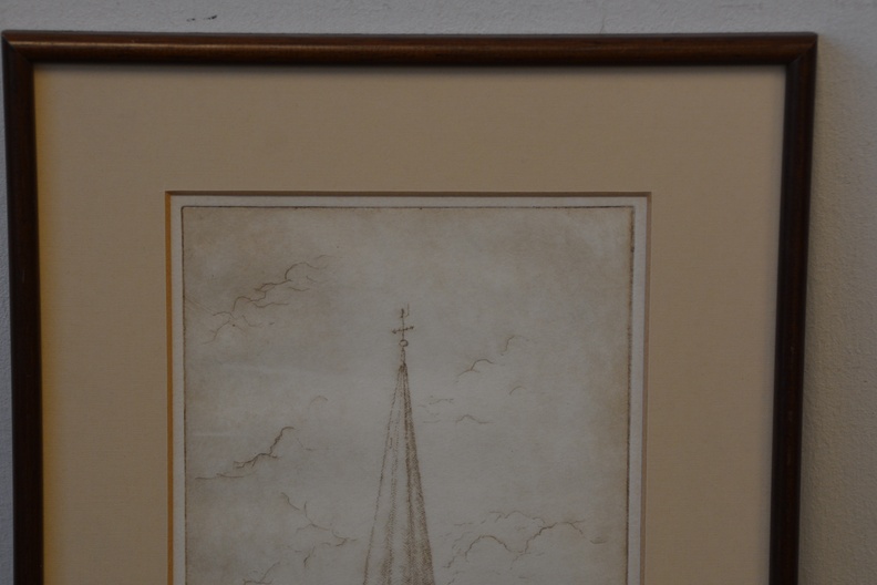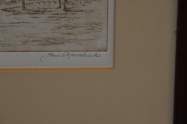 Origineel, no. 10/20 stuks. Jan Goselink geboren in 1928 in Collendoorn (Hardenberg), aquarellist, etser, schilder. Na zijn lerarenopleiding nam Jan Goselink tekenlessen en behaalde de L.O.-akte tekenen. Hij is echter altijd werkzaam geweest als docent wiskunde en maakte zijn tekeningen, etsen, aquarellen, gouaches en olieverfschilderijen in zijn vrije tijd. Hij heeft een voorkeur voor onderwerpen dicht bij huis en vooral de natuur, dier en plant, is voor hem een inspiratiebron. Voor het werk van de schilder en illustrator Anton Pieck heeft hij grote bewondering en dat heeft invloed gehad op zijn werk. De oorspronkelijhke kerk stond aan de zeedijk langs de Zuiderzee, maar werd na stormschade en brand in 1825 afgebroken. Ingelijst en onder een passe-partout. In goede staat.