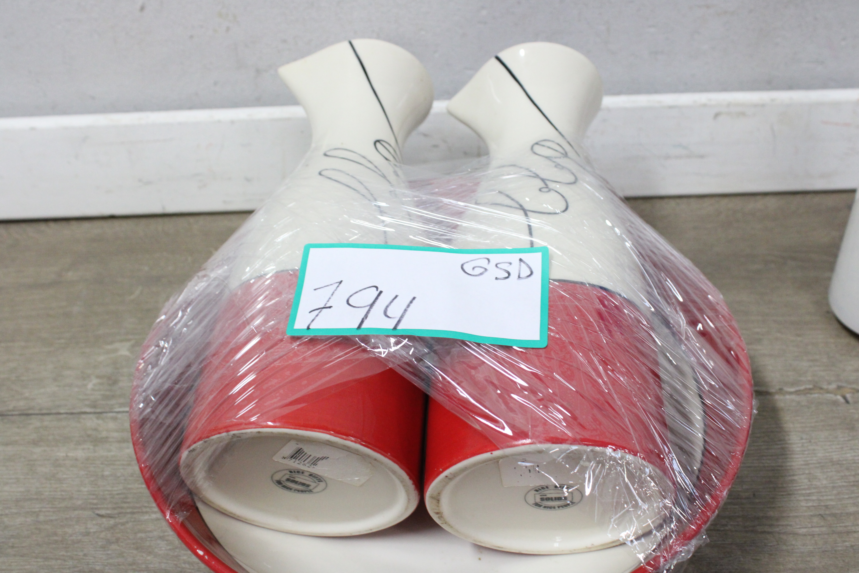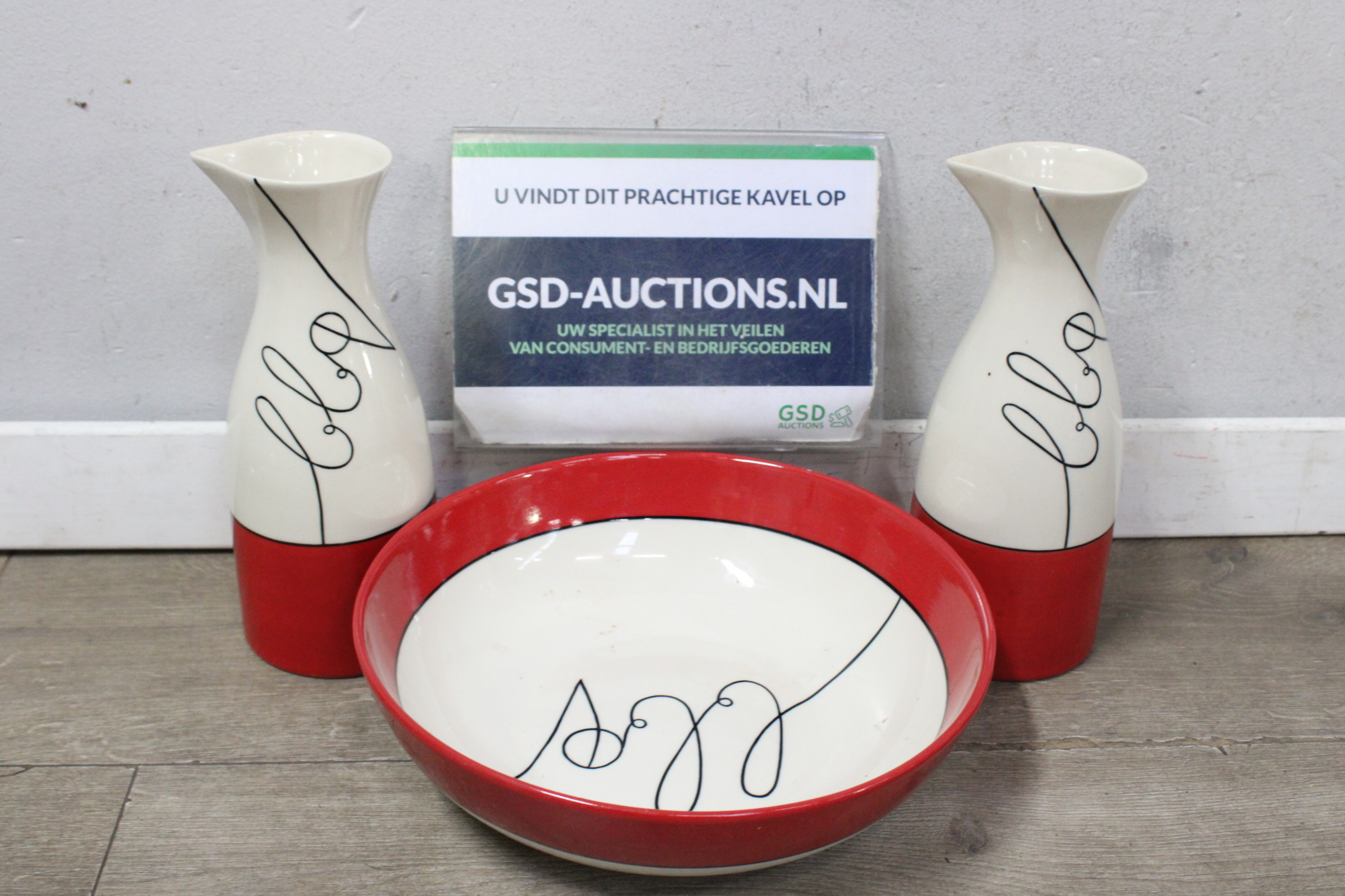 Set van 2 Rood/Witte Vazen & 1 Schaal